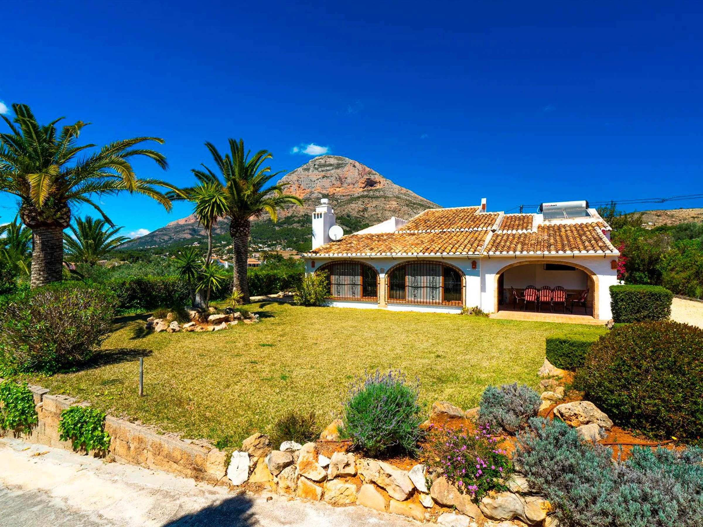 Großzügiges und komfortables Ferienhaus in Xàbia, Javea, Costa Blanca, Spanien mit privatem Pool für 8 Personen. Casa Danesa befindet sich auf einem grossen Grundstück mit geteilter, privater Einfahrt umgeben von Grünflächen, Bäumen und mit Ausblick auf den Berg Montgo.