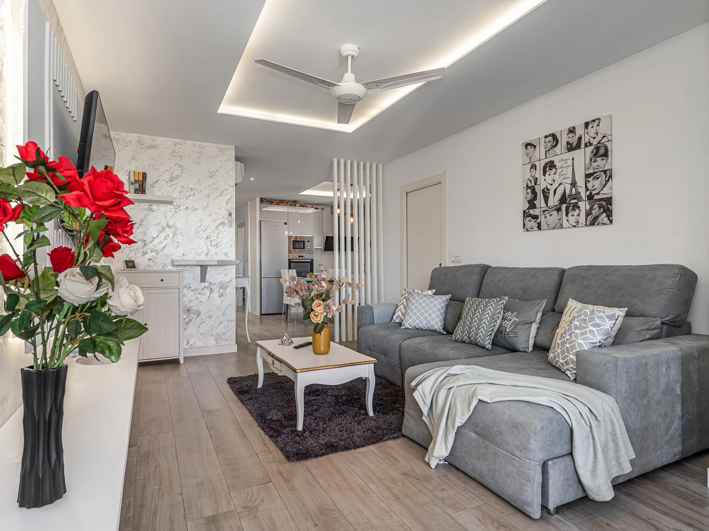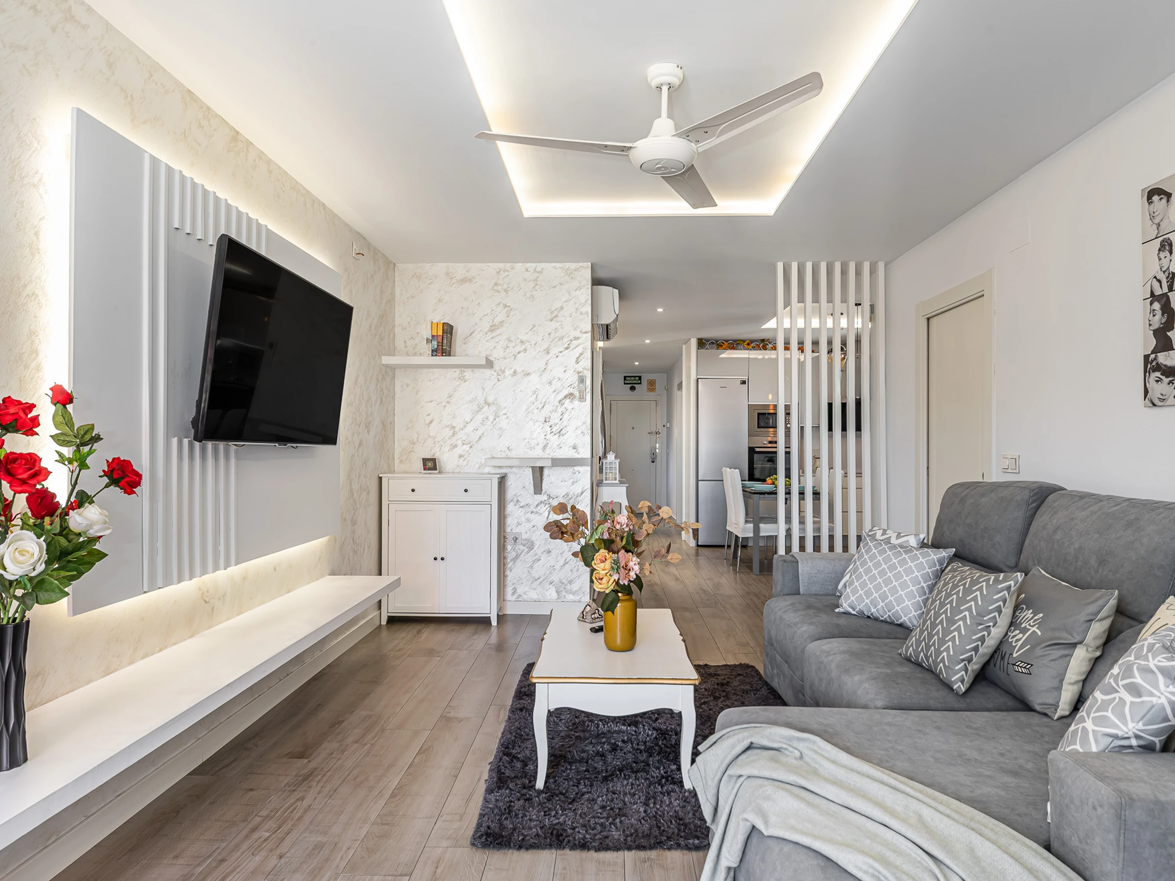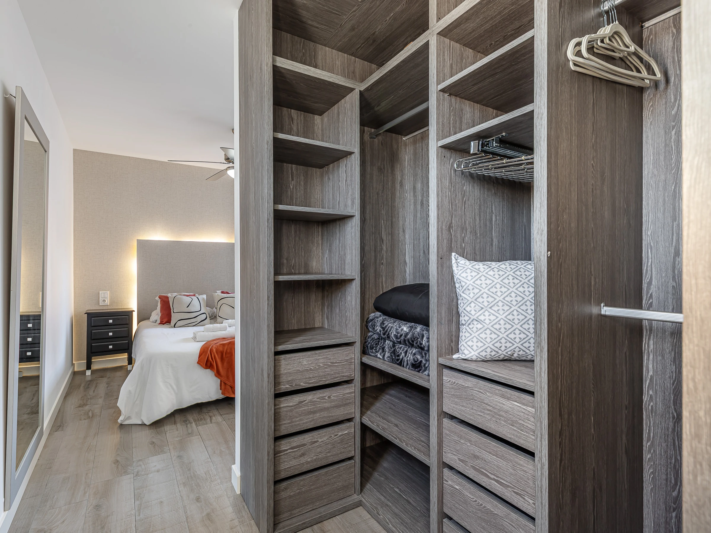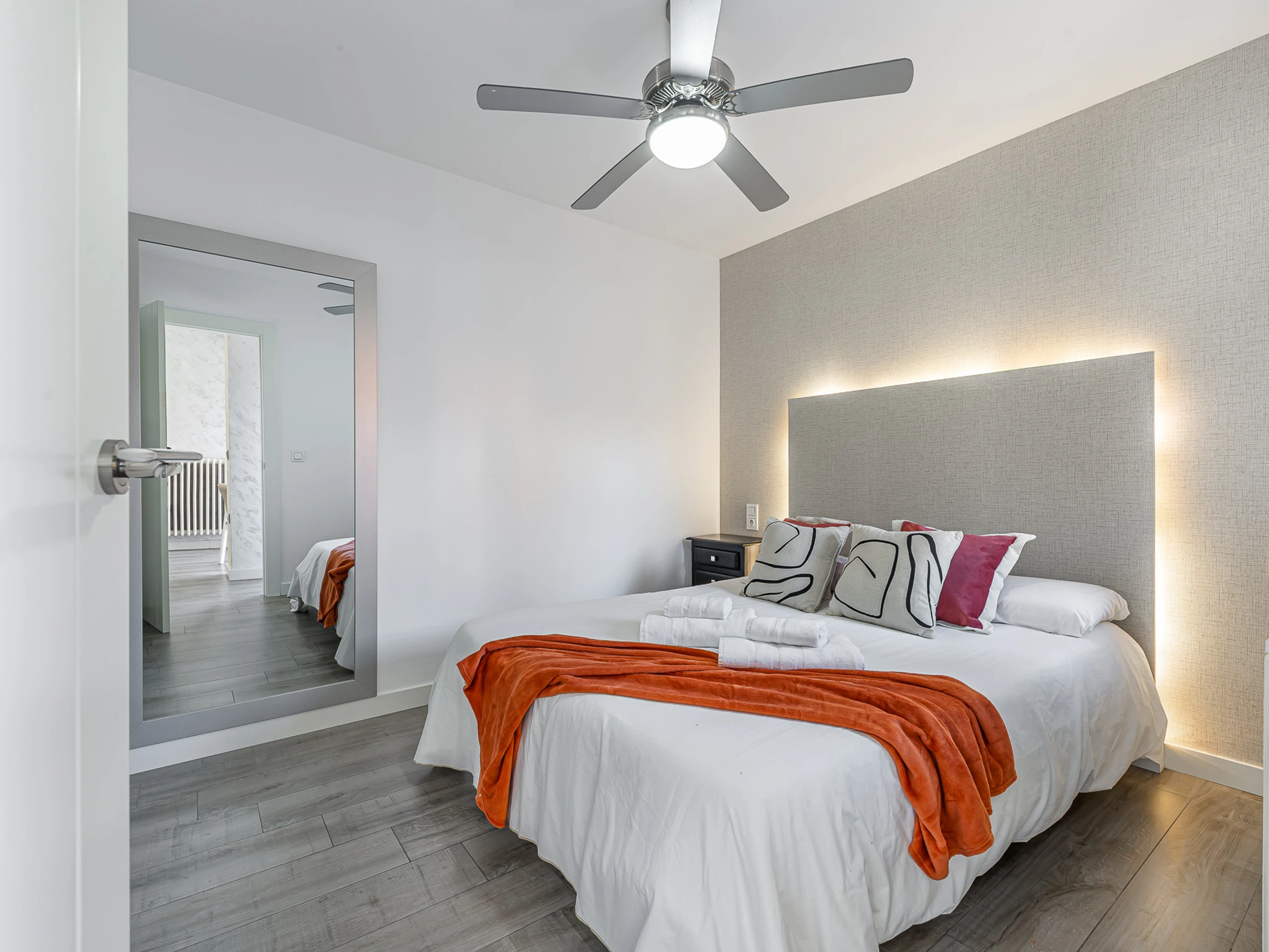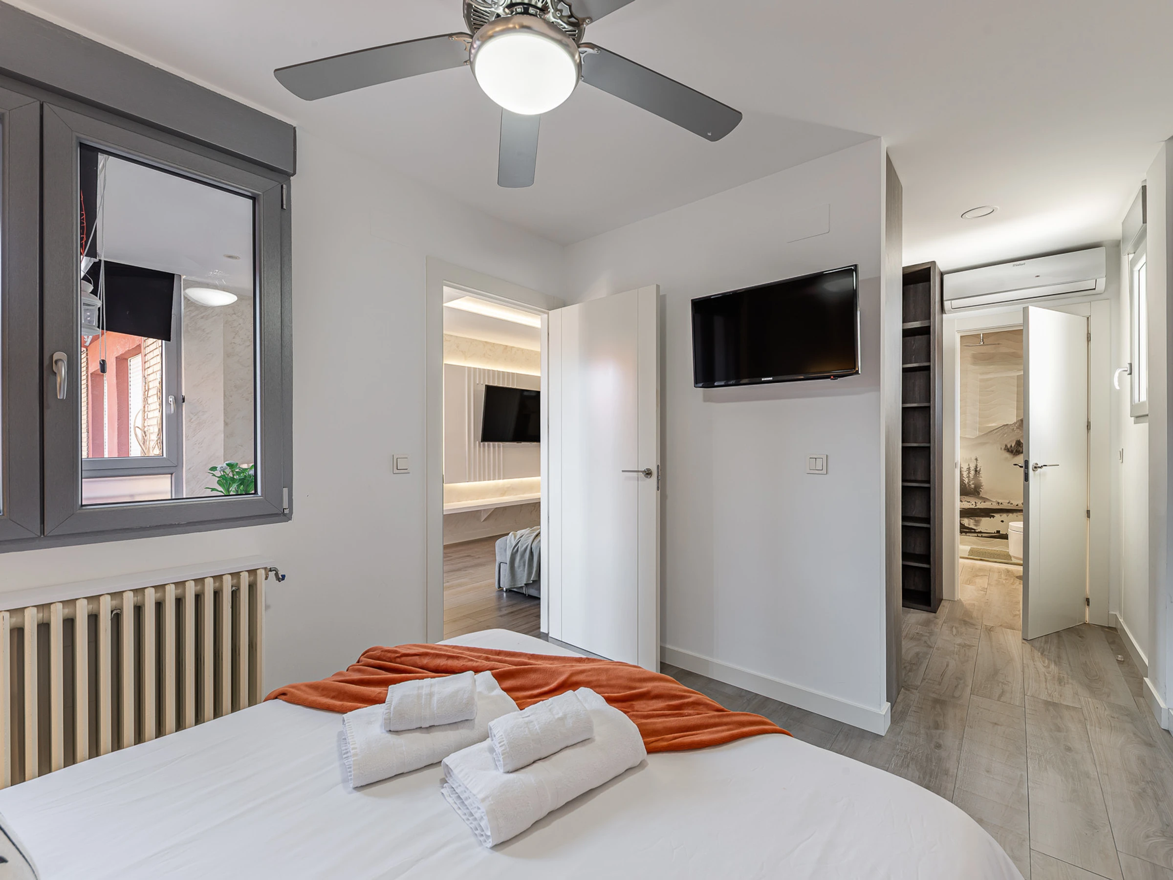 The apartment consists of a living room and a fully equipped open-plan kitchen for all your needs. It has two bedrooms, both with double beds and one of them also with a tv and a dressing room. Apart from the AC system, all rooms have a celing fan. A bathroom equipped with a shower completes the accommodation.