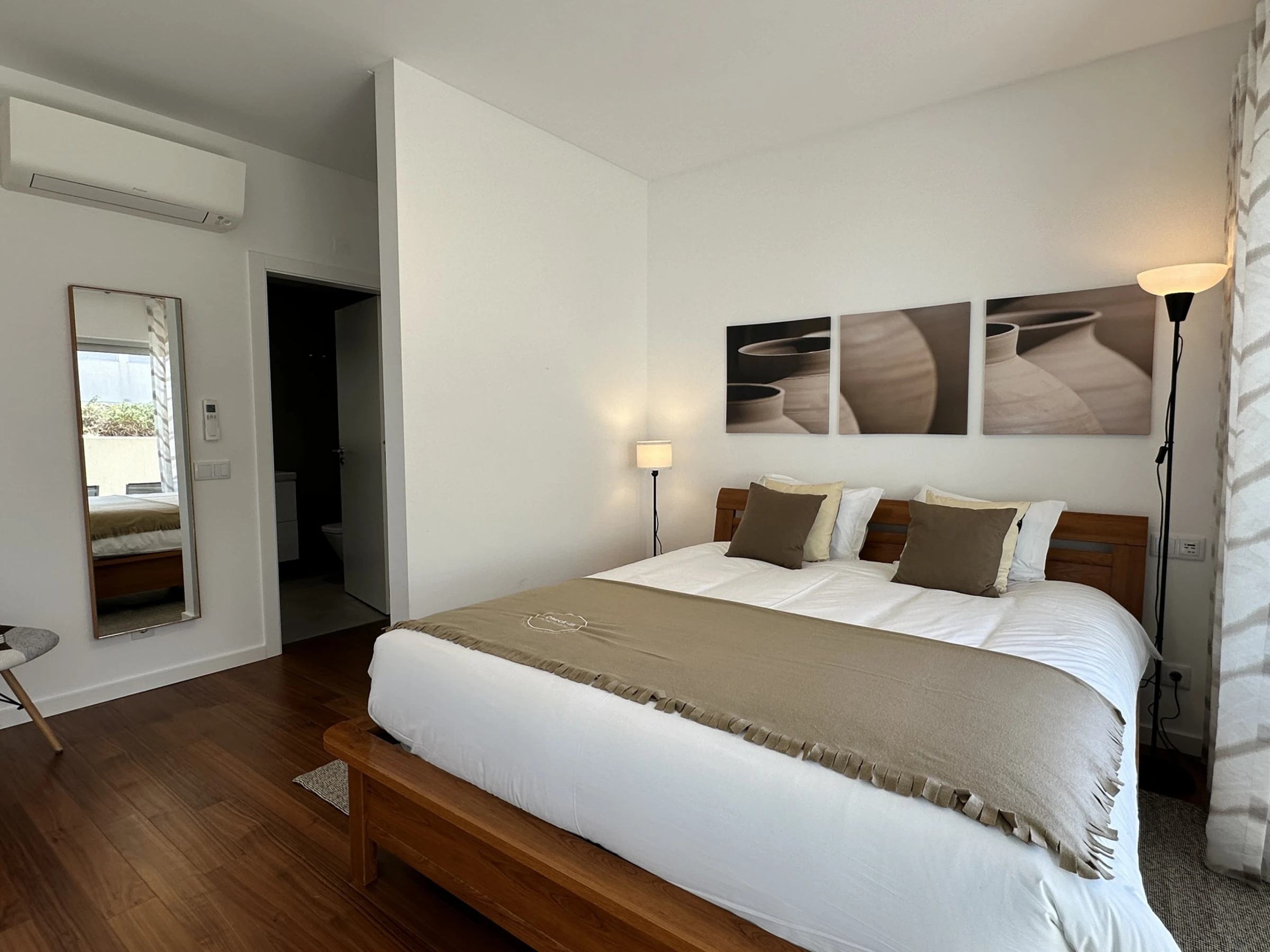 The modern decor and soft tones create a relaxing atmosphere, ideal for resting after a day at the beach or sightseeing.