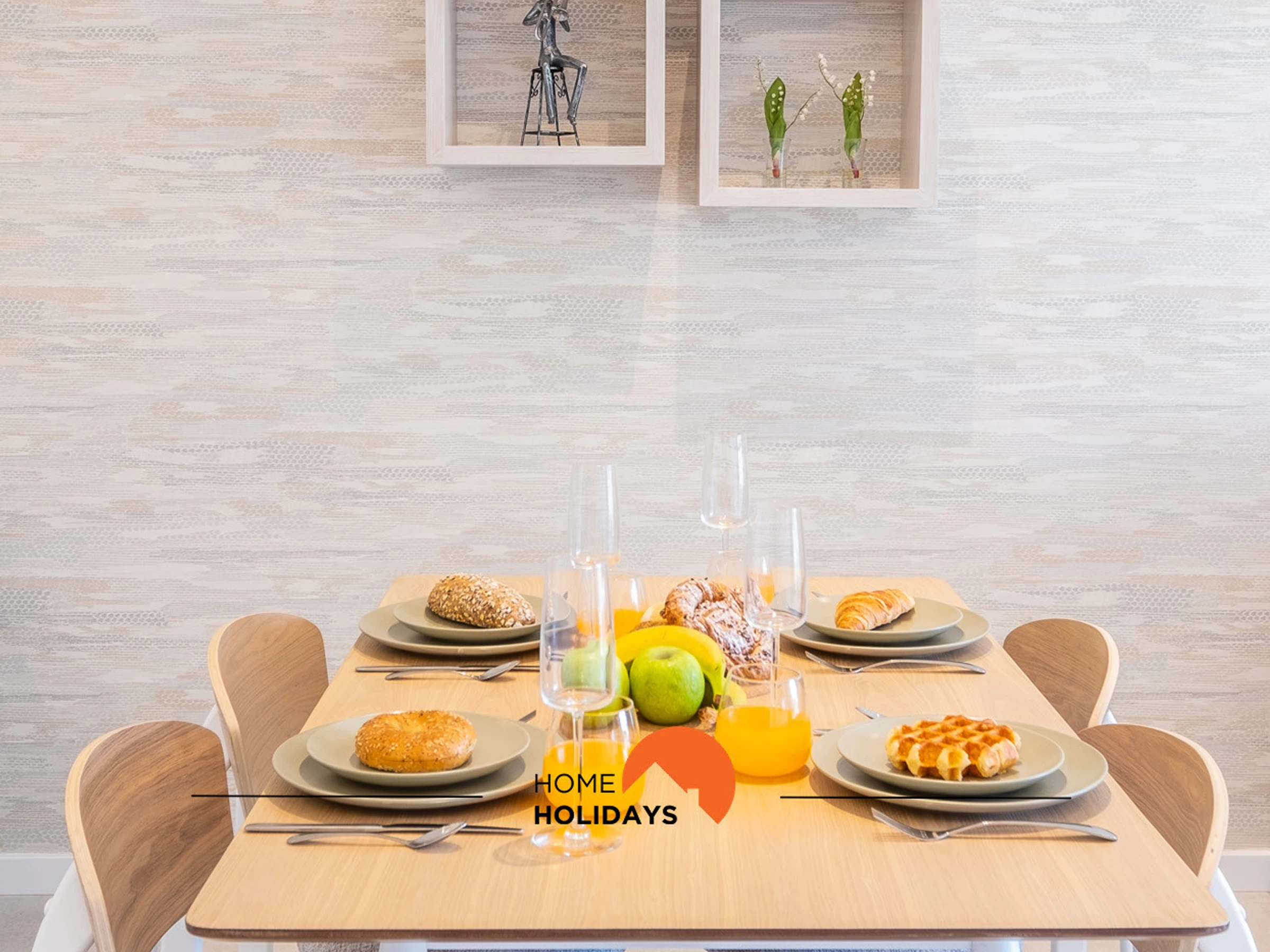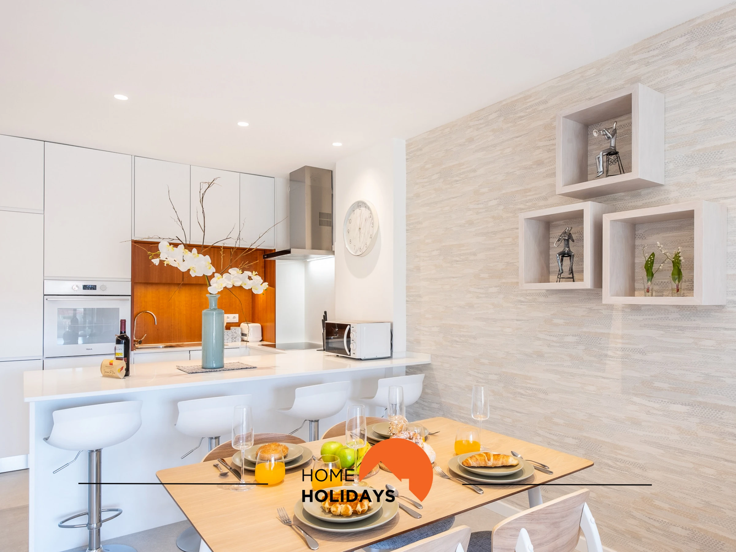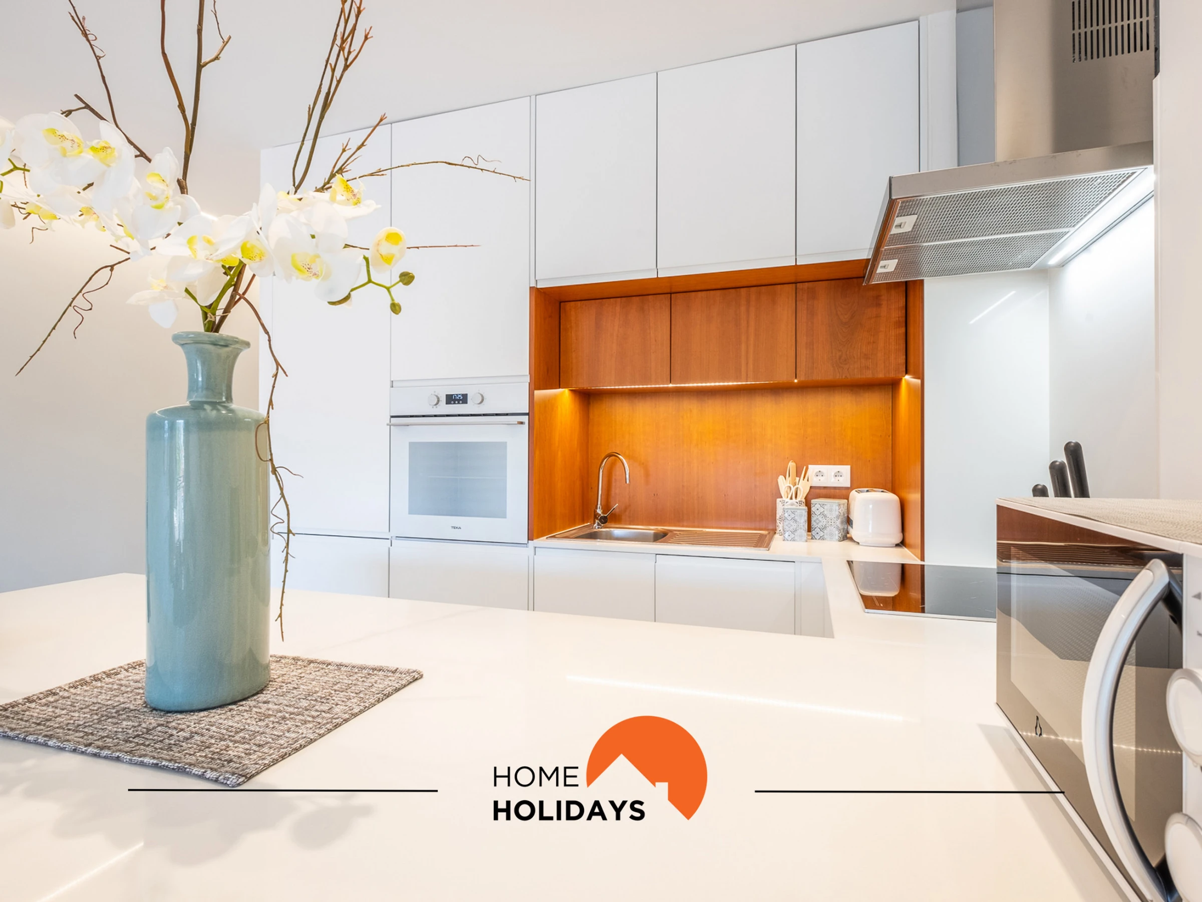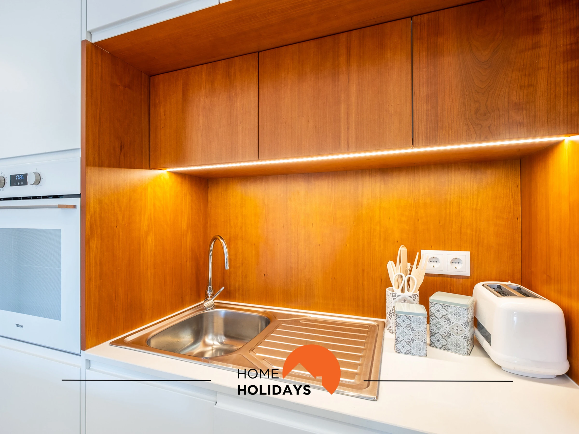 The bright bedroom has a double bed, fully equipped kitchen, air conditioning, free Wi-Fi and an inviting balcony. The large living room includes a sofa, TV and dining area.