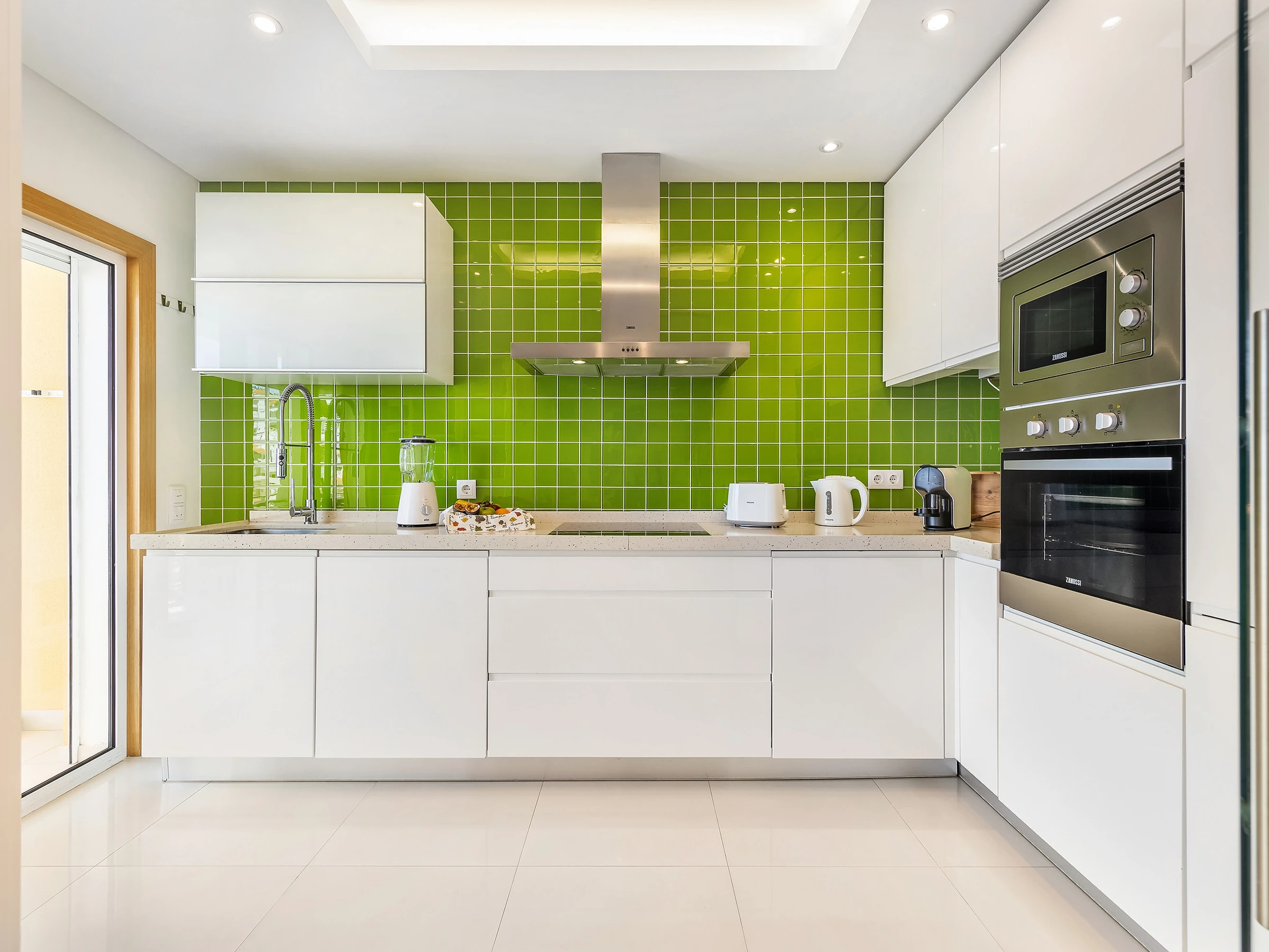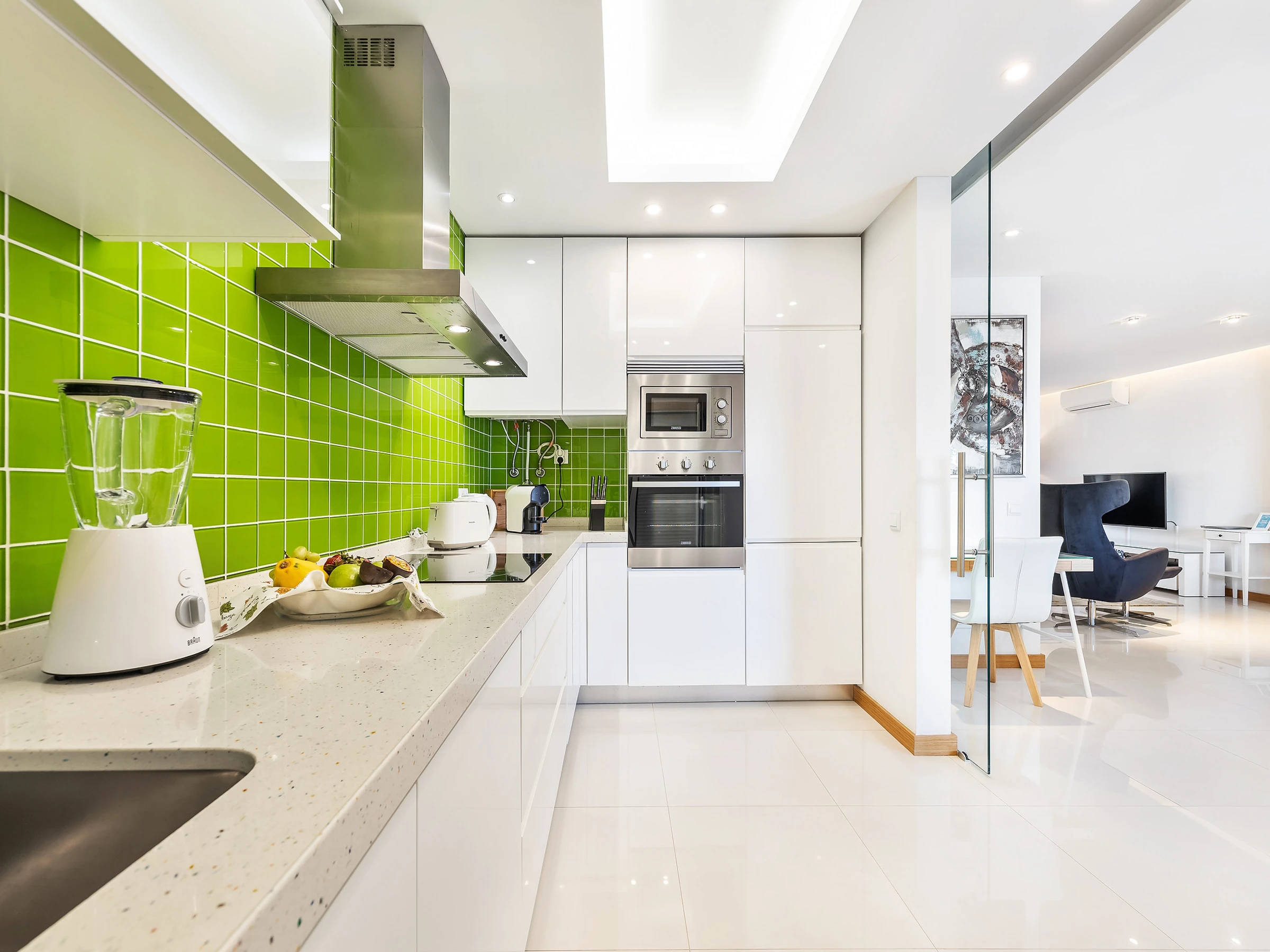 The fully equipped, ample kitchen has all the utilities needed including microwave, built-in oven, and full-size fridge/freezer. Appliances include a toaster, blender, coffee maker and electric juicer for making delicious fresh juice from the Algarve’s oranges. The kitchen has a charming balcony overlooking the pools and lovely surrounding grounds. It is here that the iconic vista of Old Town can be viewed and where your breakfast and morning coffee can be enjoyed.