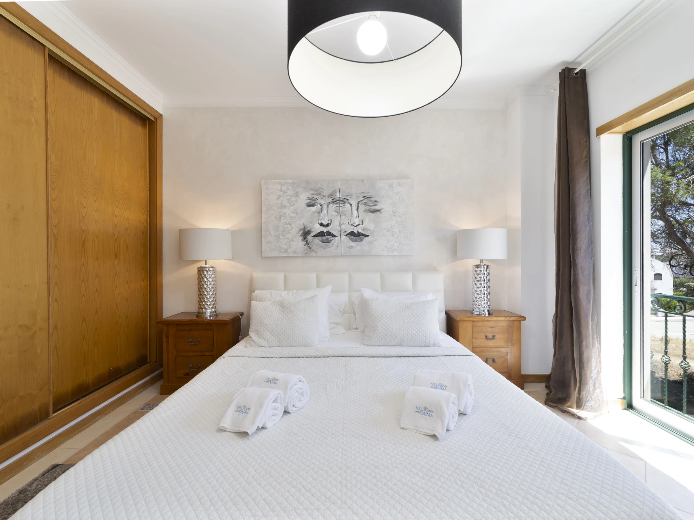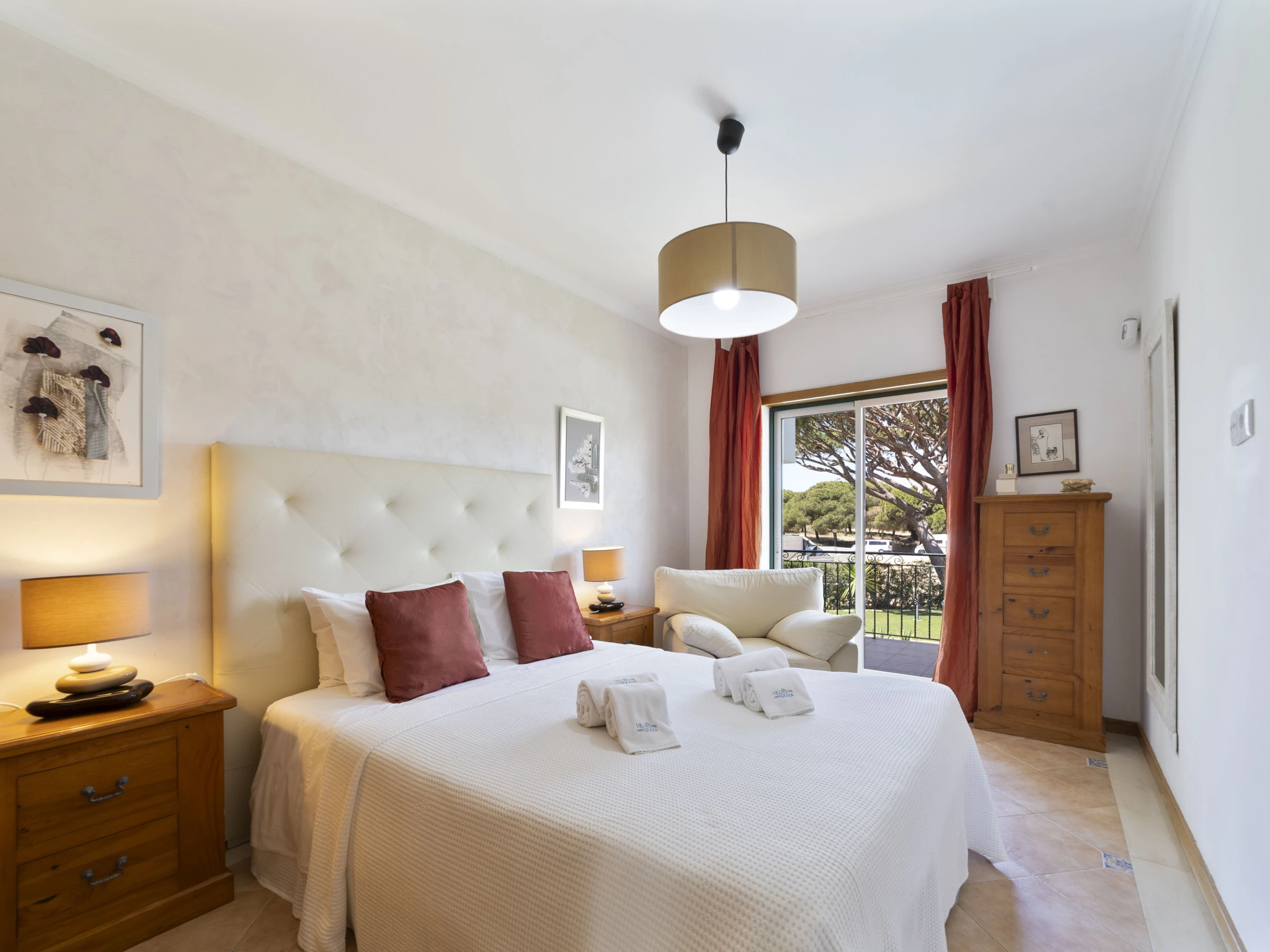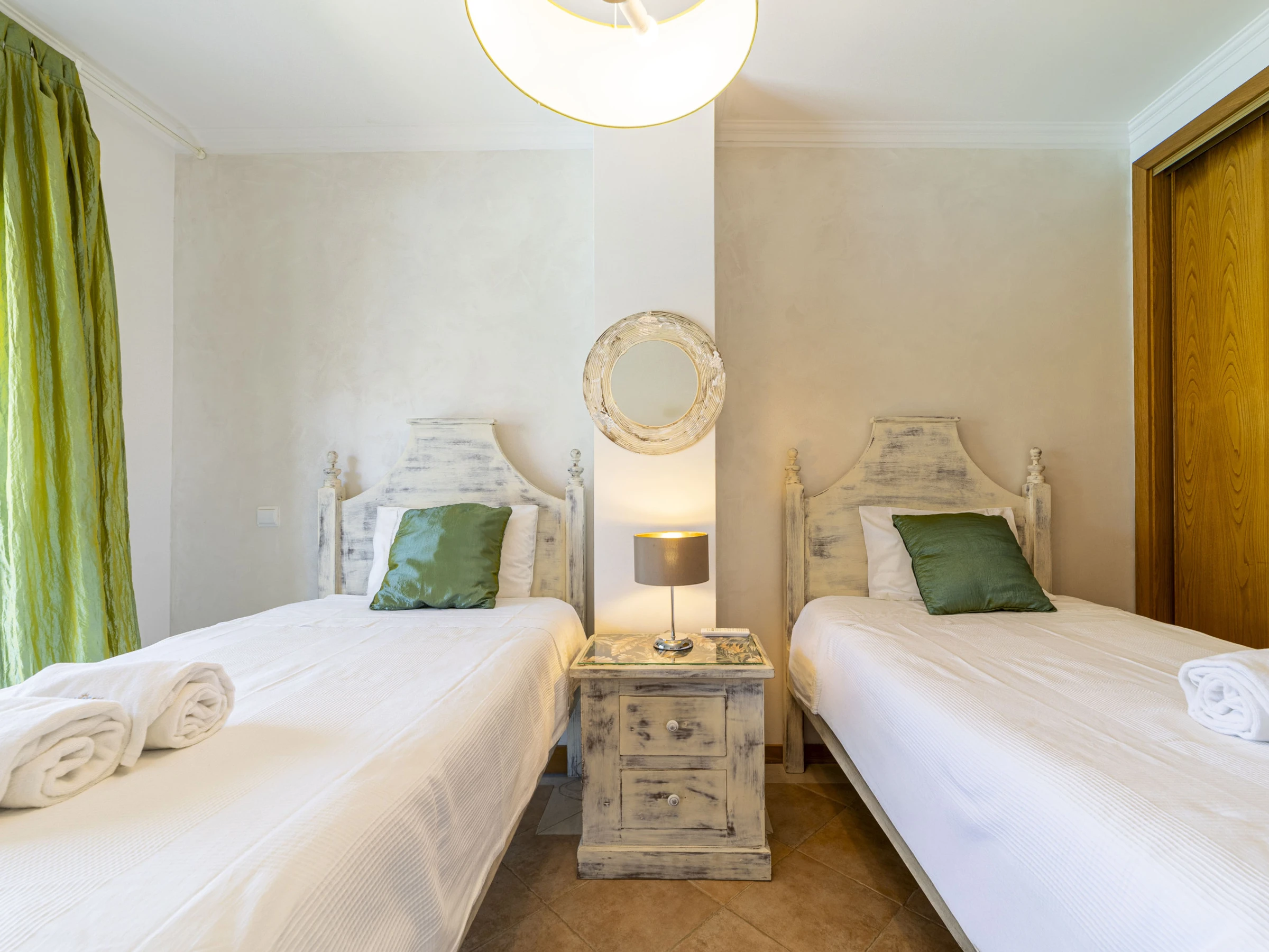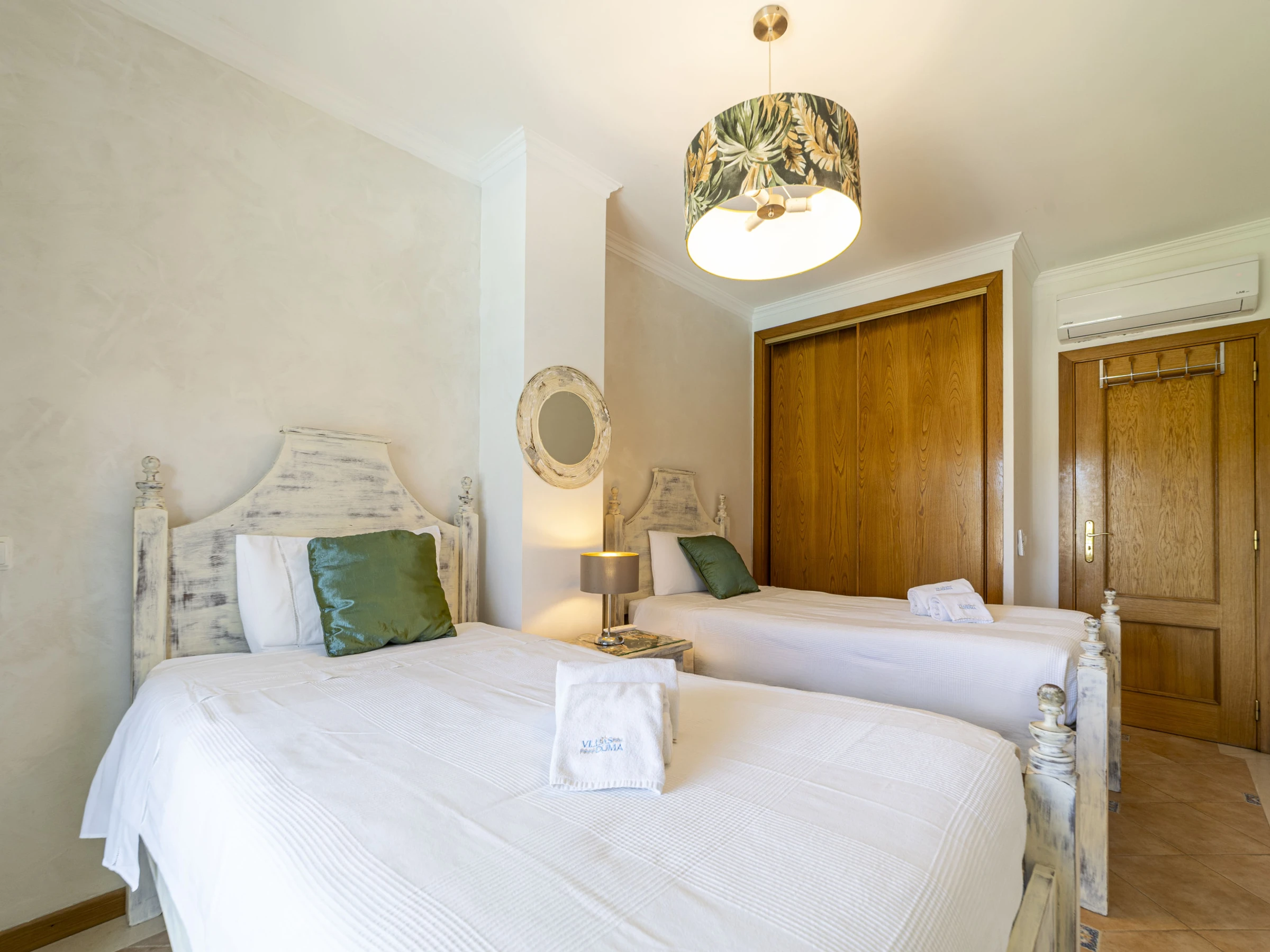 On the first floor, bedroom one has 2 single beds, air conditioning, large fitted wardrobes and double doors opening on to a shared terrace which overlooks the communal gardens and swimming pool.
