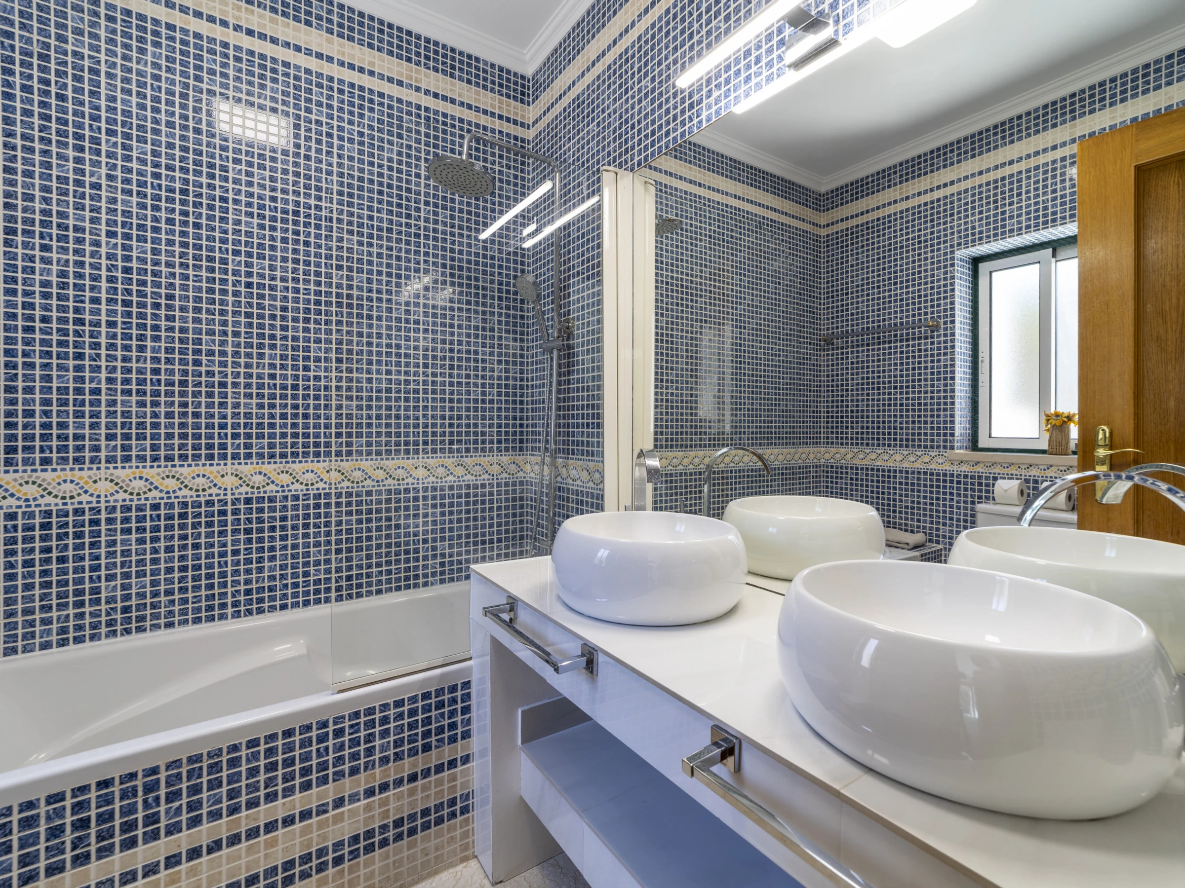 The master bedroom features a double bed, air conditioning, large fitted wardrobes and access to a private terrace. This bedroom also has a private bathroom with twin basins and a full bath with shower over.