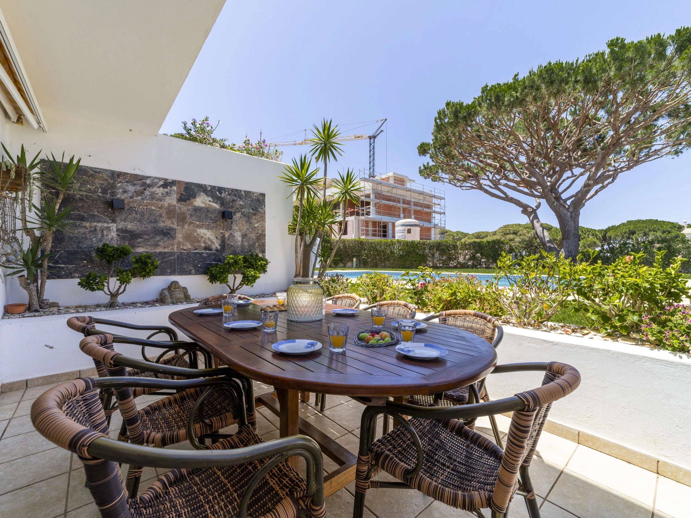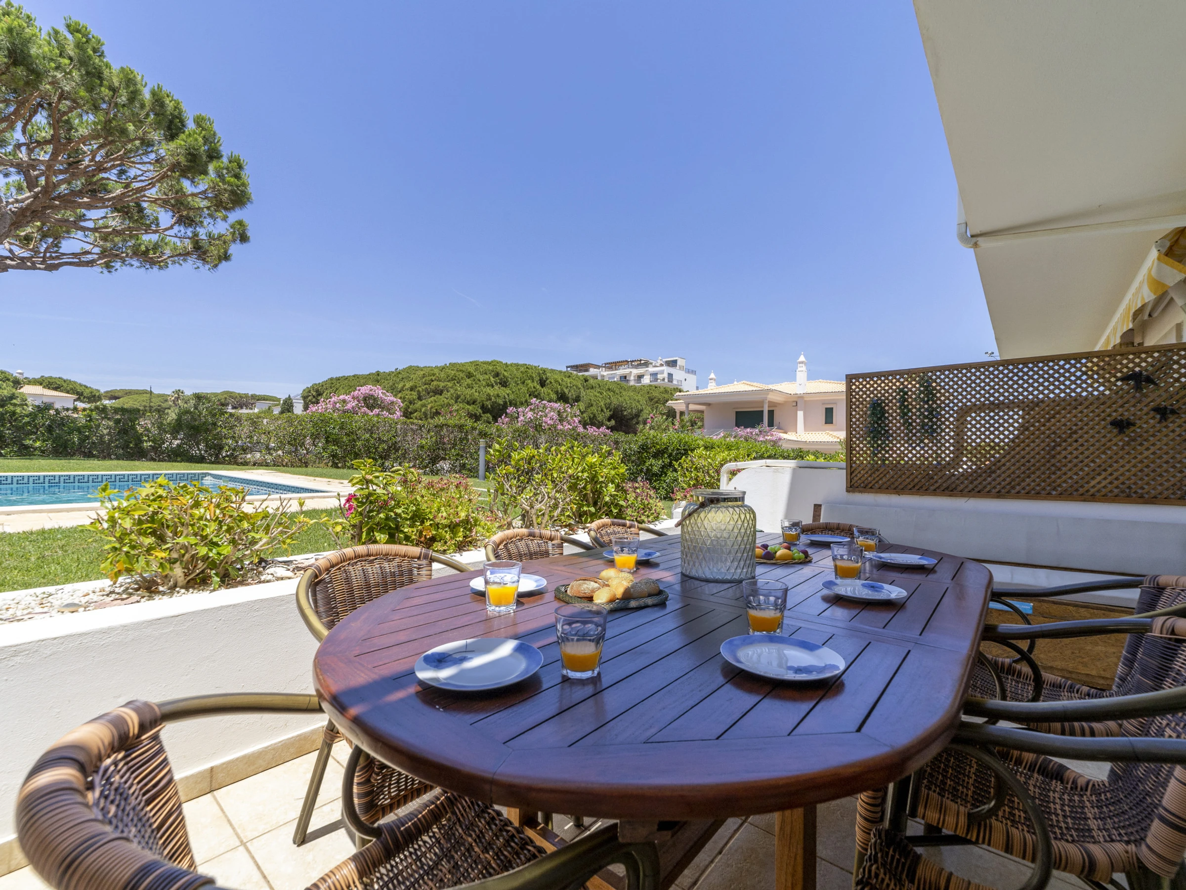 It comprises of 3 bedrooms, 2 bathrooms and a WC and has capacity for up to 8 people (using 2 additional fold up type beds). There is a great private terrace over looking the communal swimming pool and gardens with table and 6 chairs. A gate leads directly on to the garden area and swimming pool.