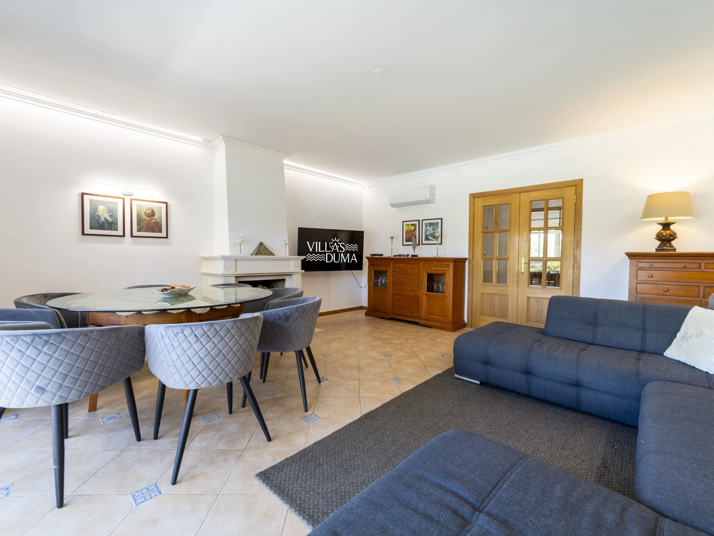 Double doors lead to the living area which has a large L shaped sofa, fire place, TV with some international channels, DVD player, CD music system, dining table with chairs and air conditioning.