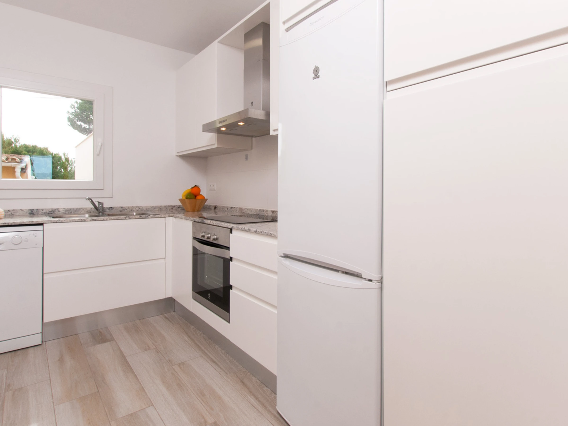 The living room with sofa, TV and dining table organizes the life of the house. There are three bedrooms, two doubles and one with two beds. The kitchen is fully equipped.