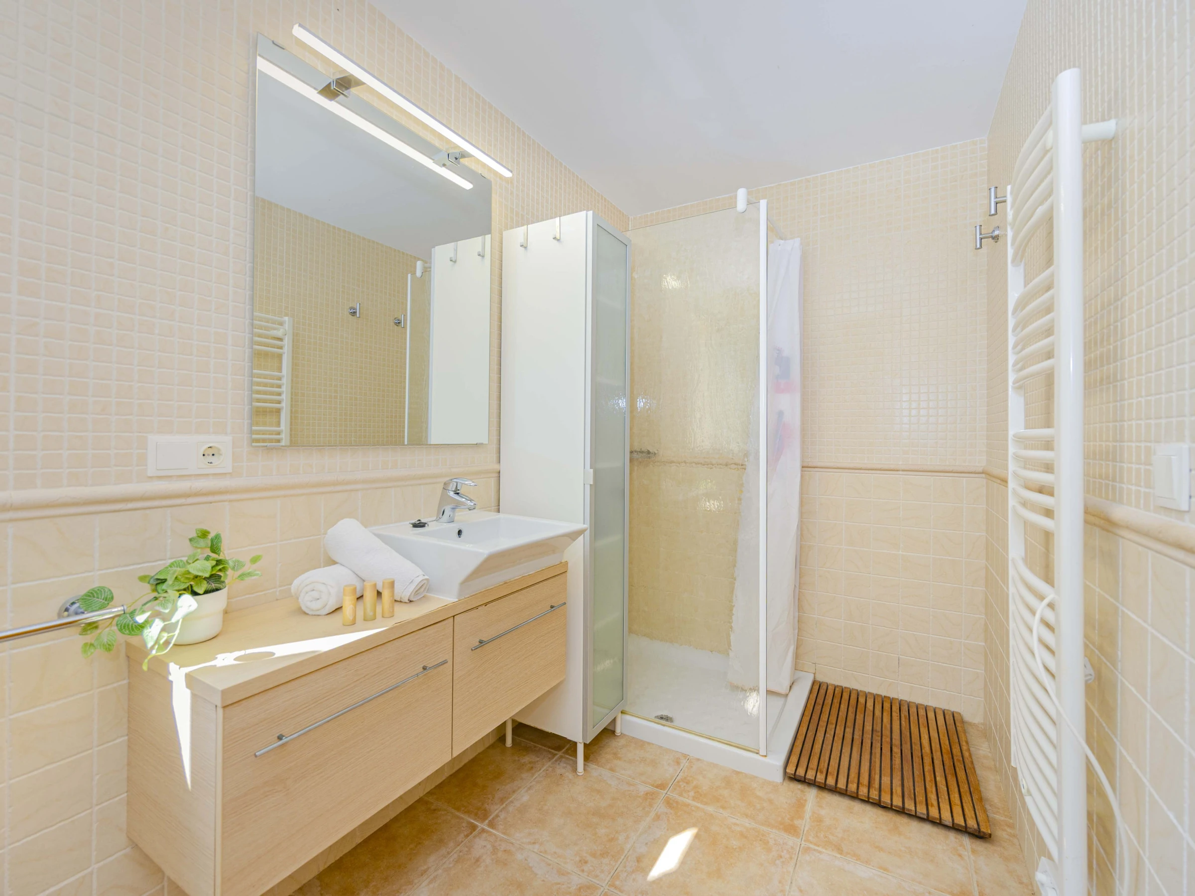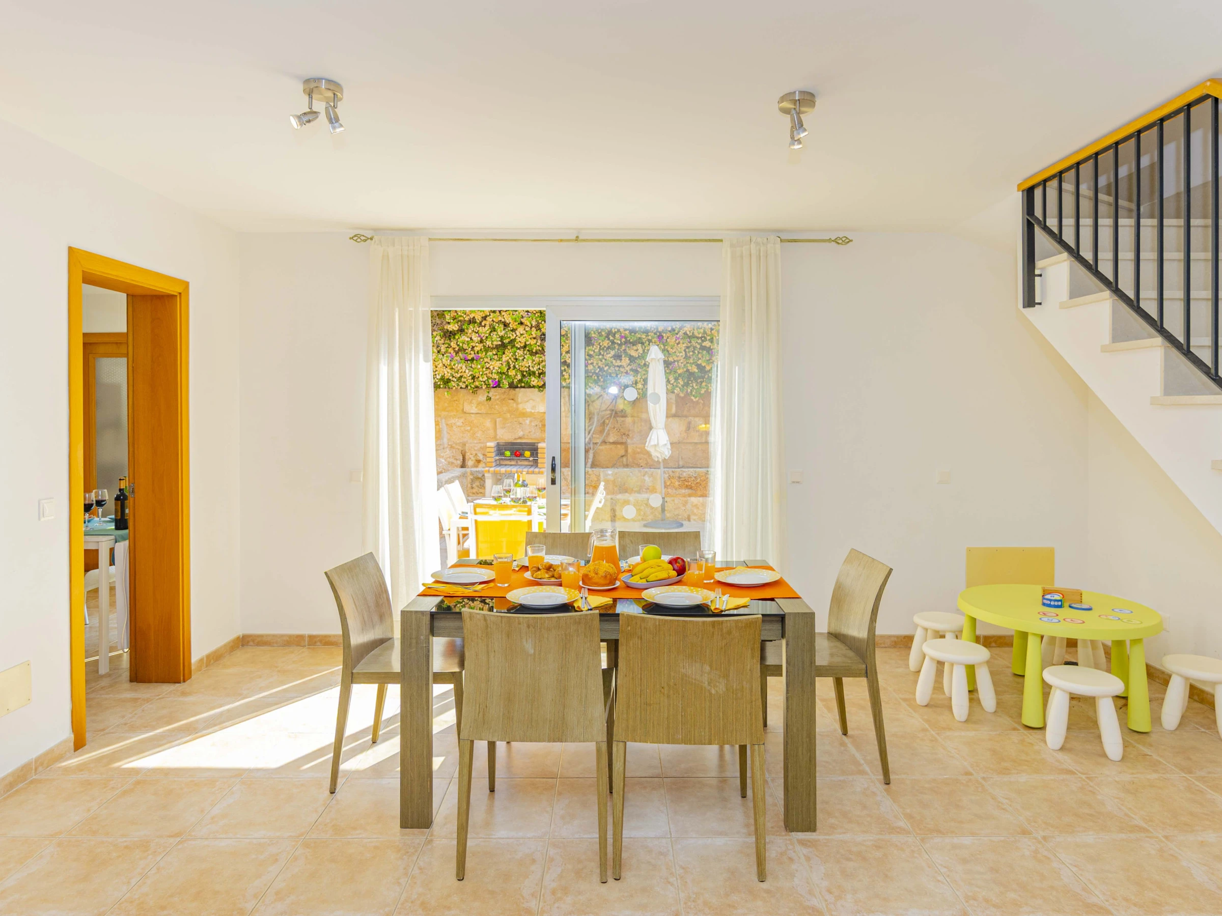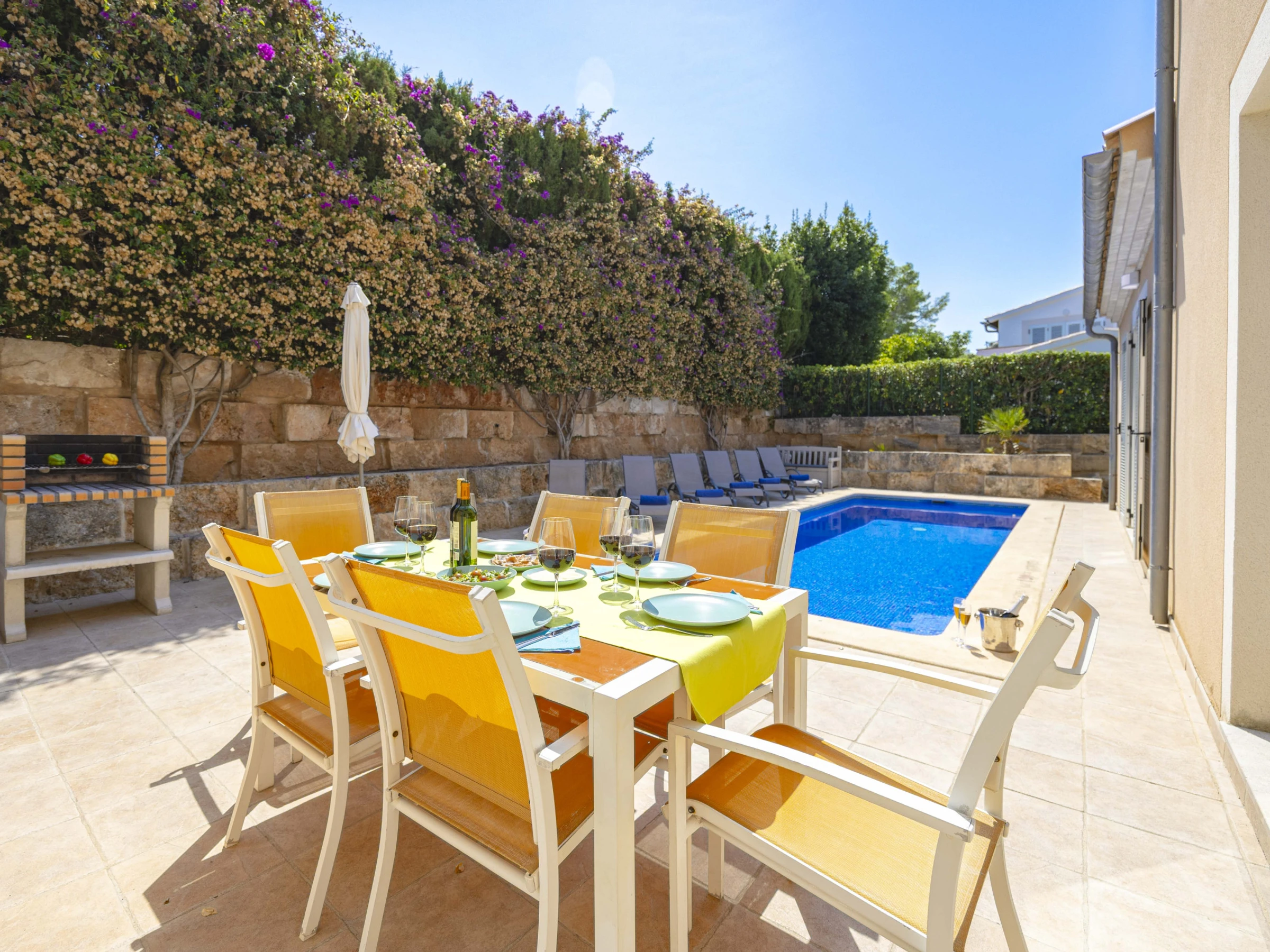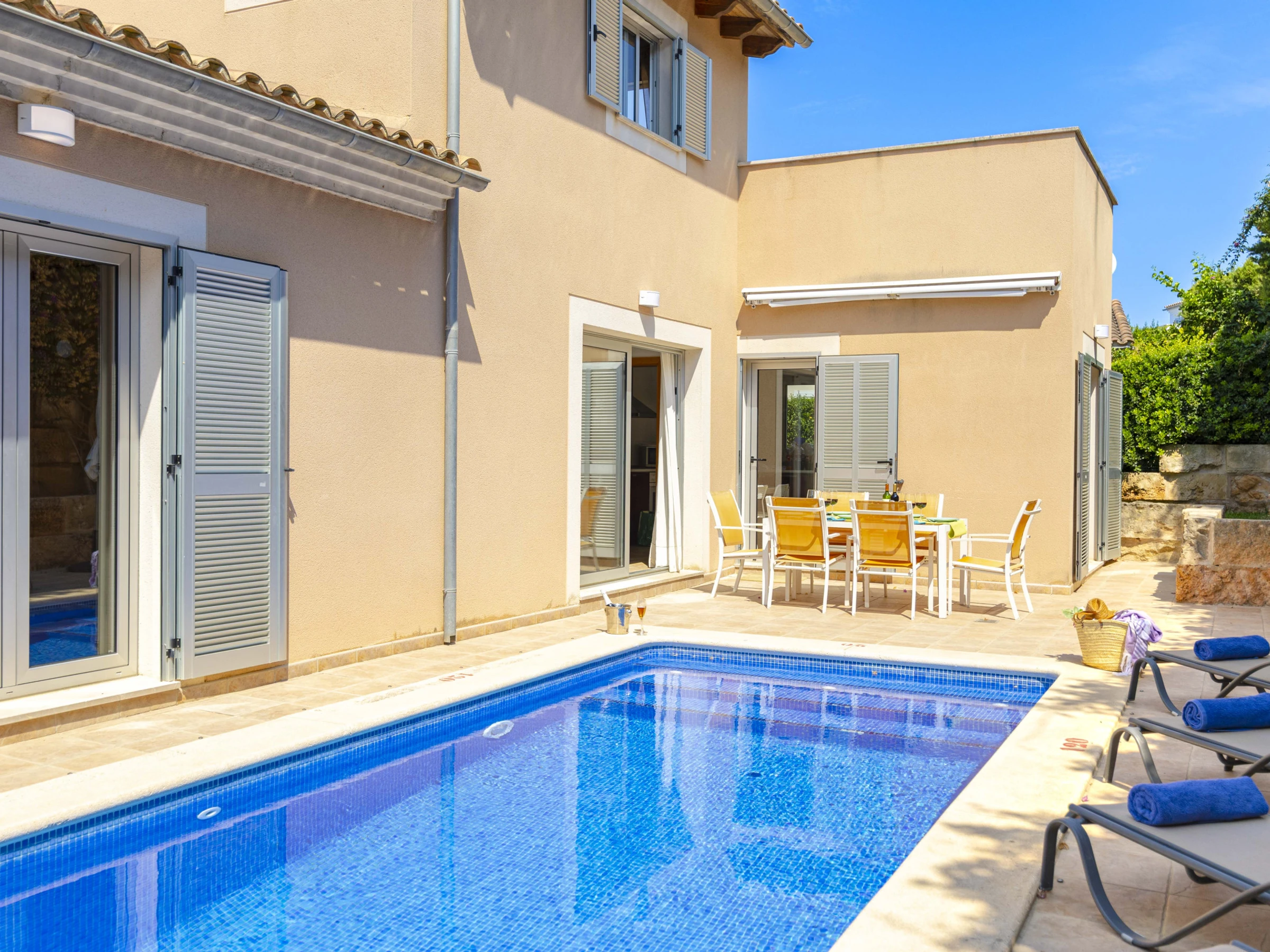 - Main floor: bright living-dining room, fully equipped independent kitchen, two double bedrooms (one with a double bed and one with two single beds), and two bathrooms with shower. Direct access to the garden and pool.