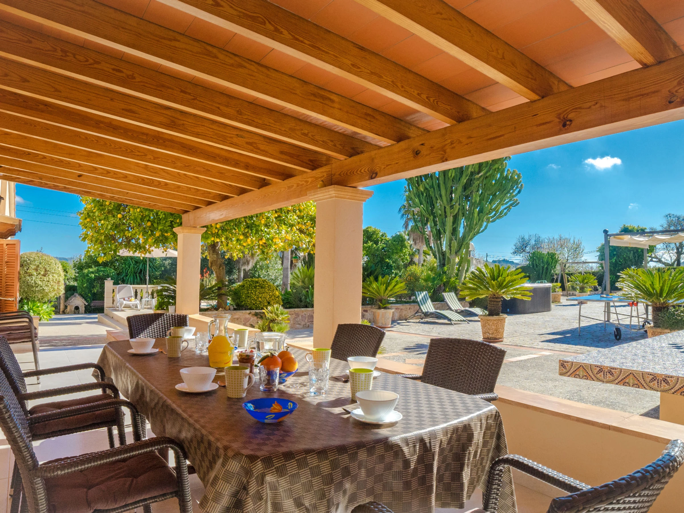 4 km from Alcúdia: Behind the house there is an enclosed area with direct access from the garden with 2 ponies. Rustic, comfortable farm estate "Ca Na Guerrera", 2 storeys, renovated in 2018, surrounded by trees and fields. Outside the resort, 4 km from the centre of Alcudia, in a quiet, sunny position, 7 km from the sea, located by a road. Private: property 13'000 m2 (fenced) with lawn and wildlife garden, orchard (fenced), beautiful garden to relax, swimming pool angular (9 x 4 m, seasonal availability: [hidden] - [hidden] Shower/WC in the pool area, outdoor shower, hot tub, patio (500 m2), pergola (15 m2), garden furniture, barbecue (swing). In the house: internet access, WiFi, air conditioning, washing machine. Narrow motor access. Parking at the house on the premises. Shop 6 km, grocery 6 km, restaurant 6 km, bus stop "Alcudia" 6 km, railway station 10 km, sandy beach "Bahia de Alcudia" 7 km pebble beach 8 km, rocky beach 8 km. Sports harbour 6 km, marina 6 km, golf course (18 hole) 6 km, tennis 8 km, riding stable 5 km. Please note: car recommended. Suitable for families, suitable for seniors. Object suitable for 7 adults groups of teenagers on request only. Loading and unloading of baggage is possible at the holiday house.