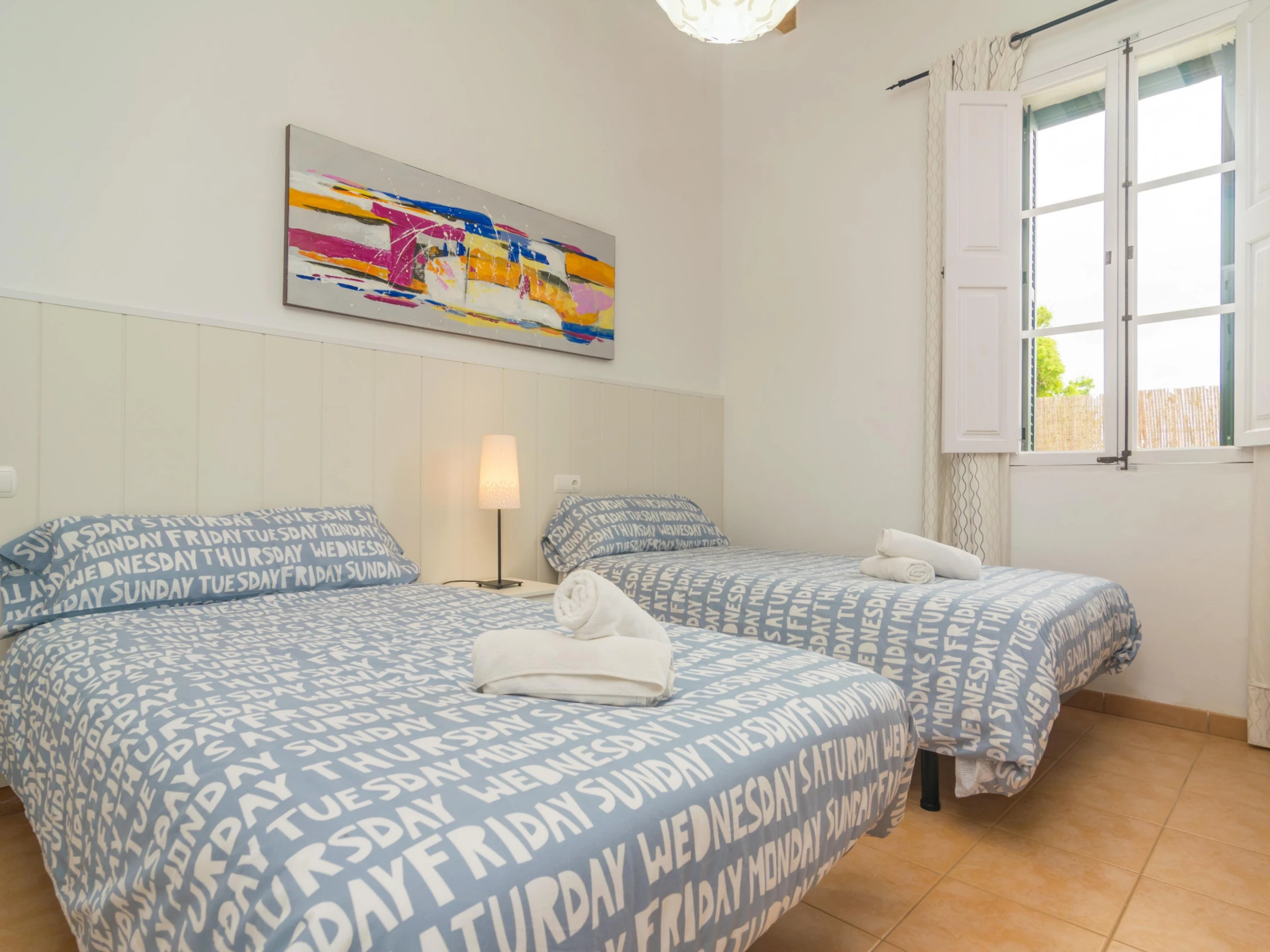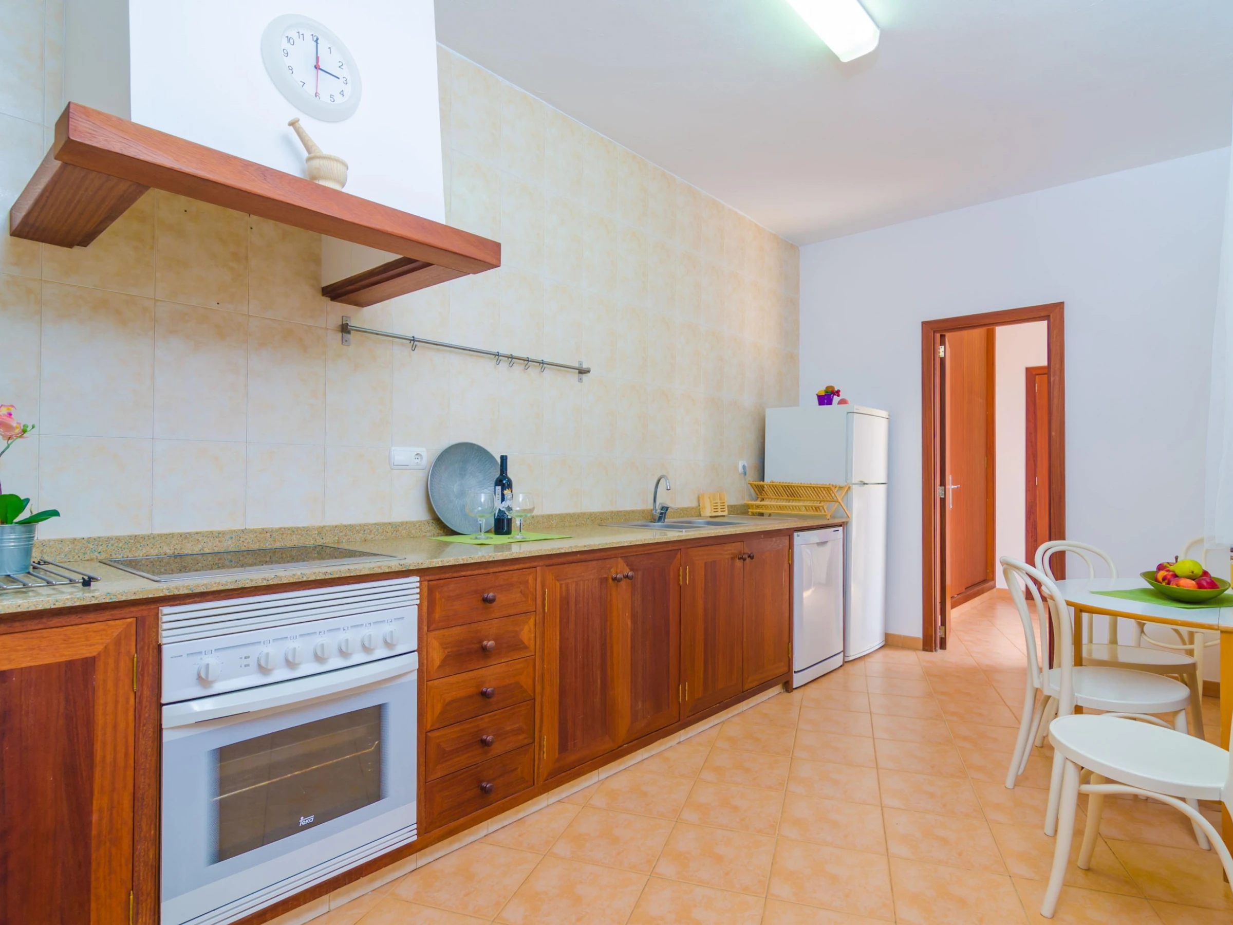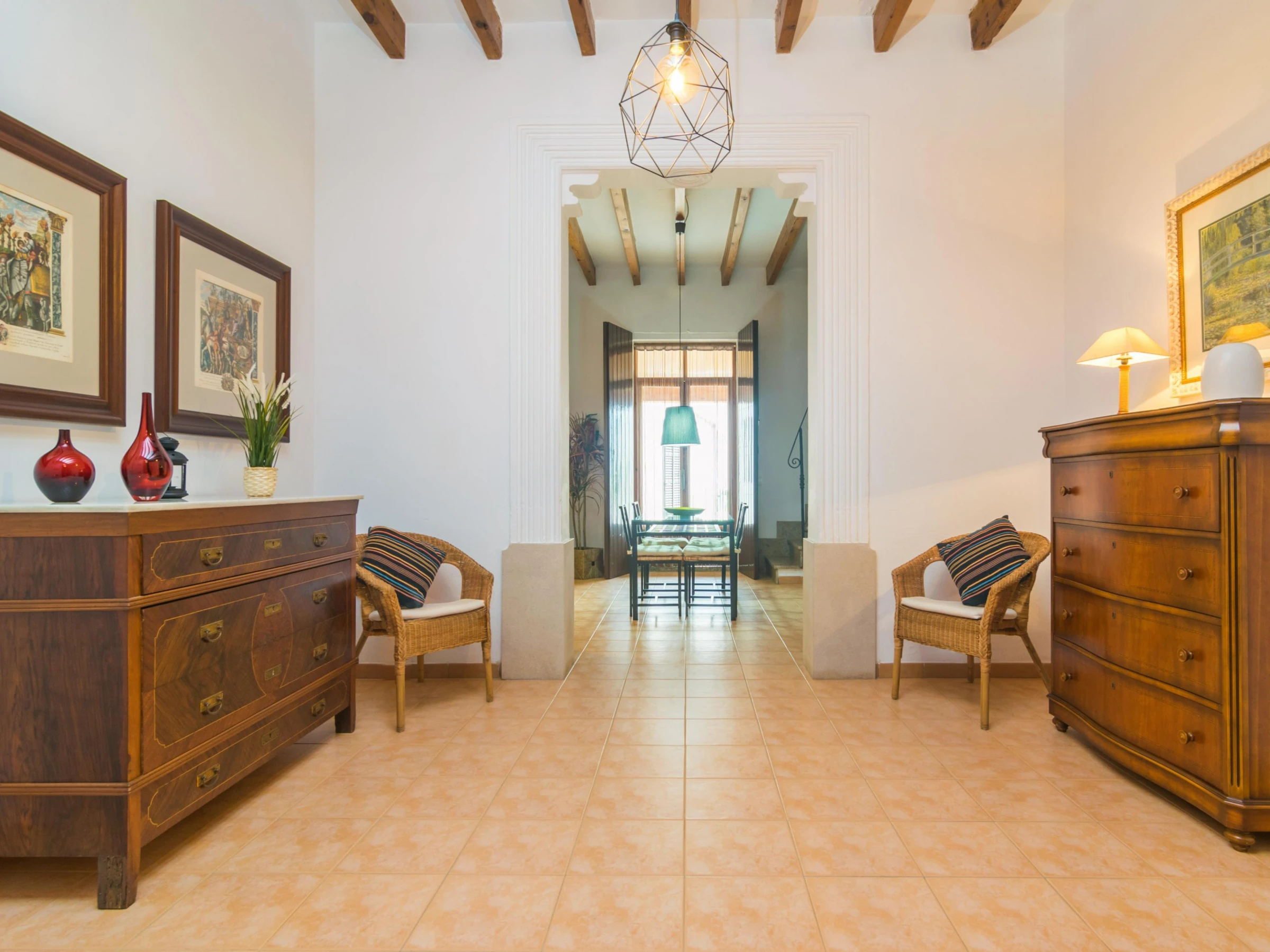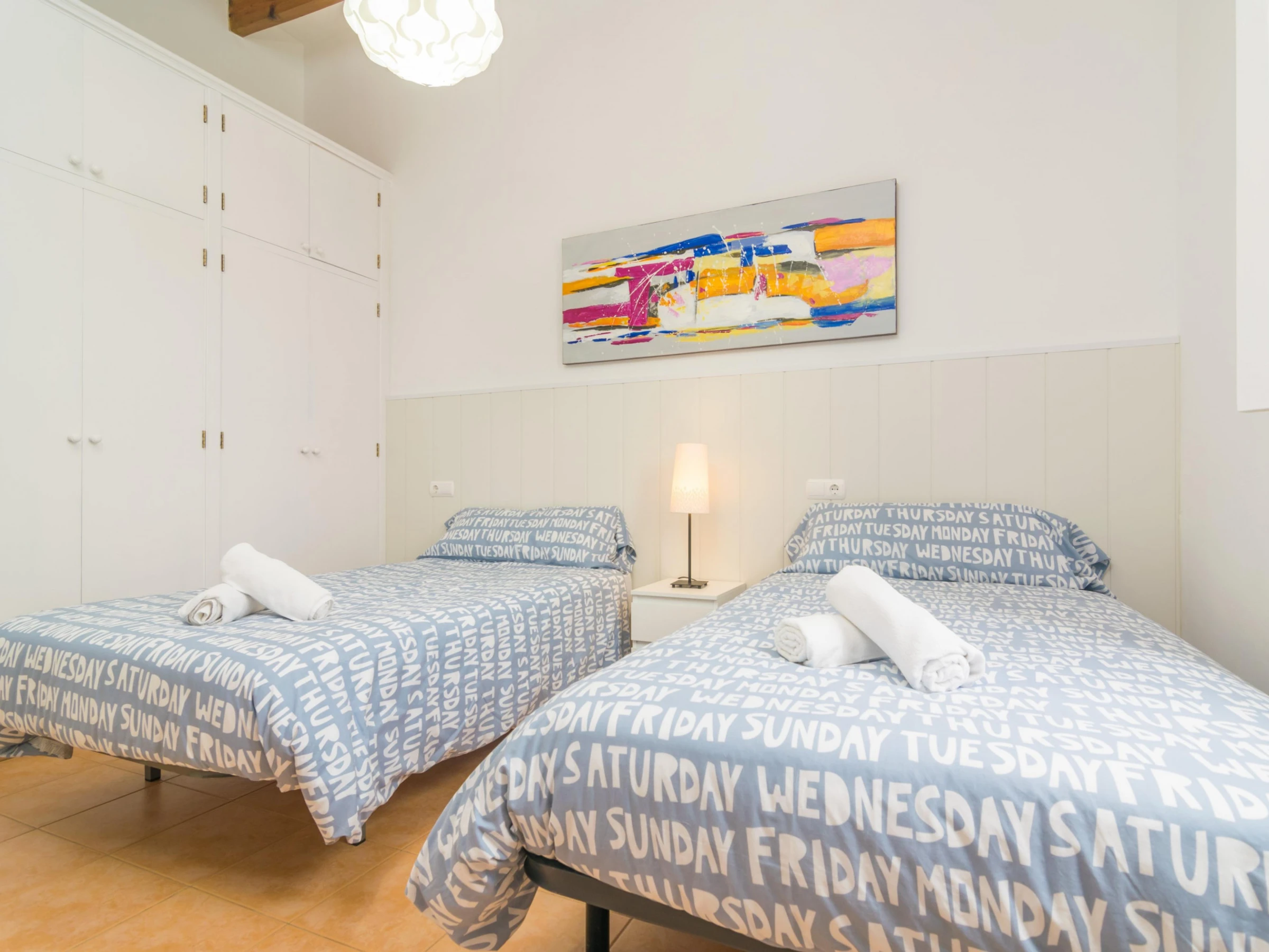 The 130 m2 two storey house has been restored so that you will enjoy all comforts during your stay. In the living room you can have a rest on one of the sofas, watch TV or take a little siesta. Then the dining area suitable for 4 people. Finally the kitchen, basically equipped to cook during your vacation, including a ceramic hob, a dishwasher and a little table for morning breakfasts. The laundry is located by the kitchen and it features a washing machine, an iron and an ironing board. Two of the three bedrooms are also on the ground floor. One with a double be and the other with twin beds, and both with a fan and a closet. Two bathrooms complete this floor, one with a shower and the other with a bathtub, for the whole accommodation. Going upstairs you will find the last twin bedroom which also presents a fan and a closet. If you are travelling with a baby, we can prepare a cot and a high chair too.