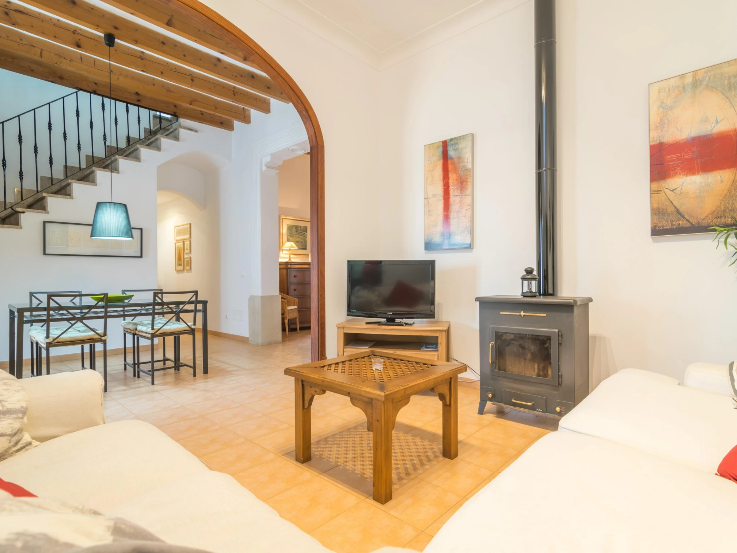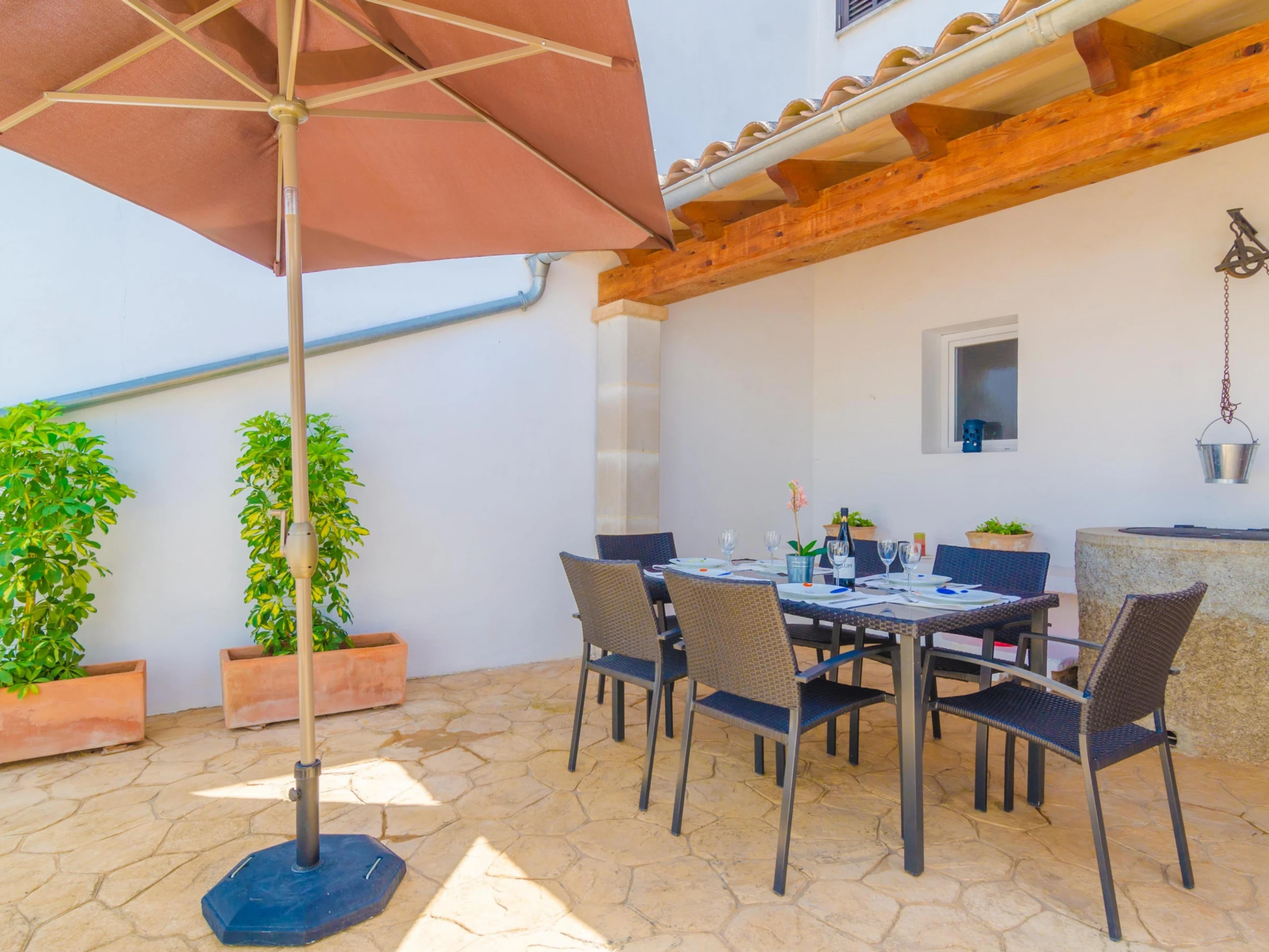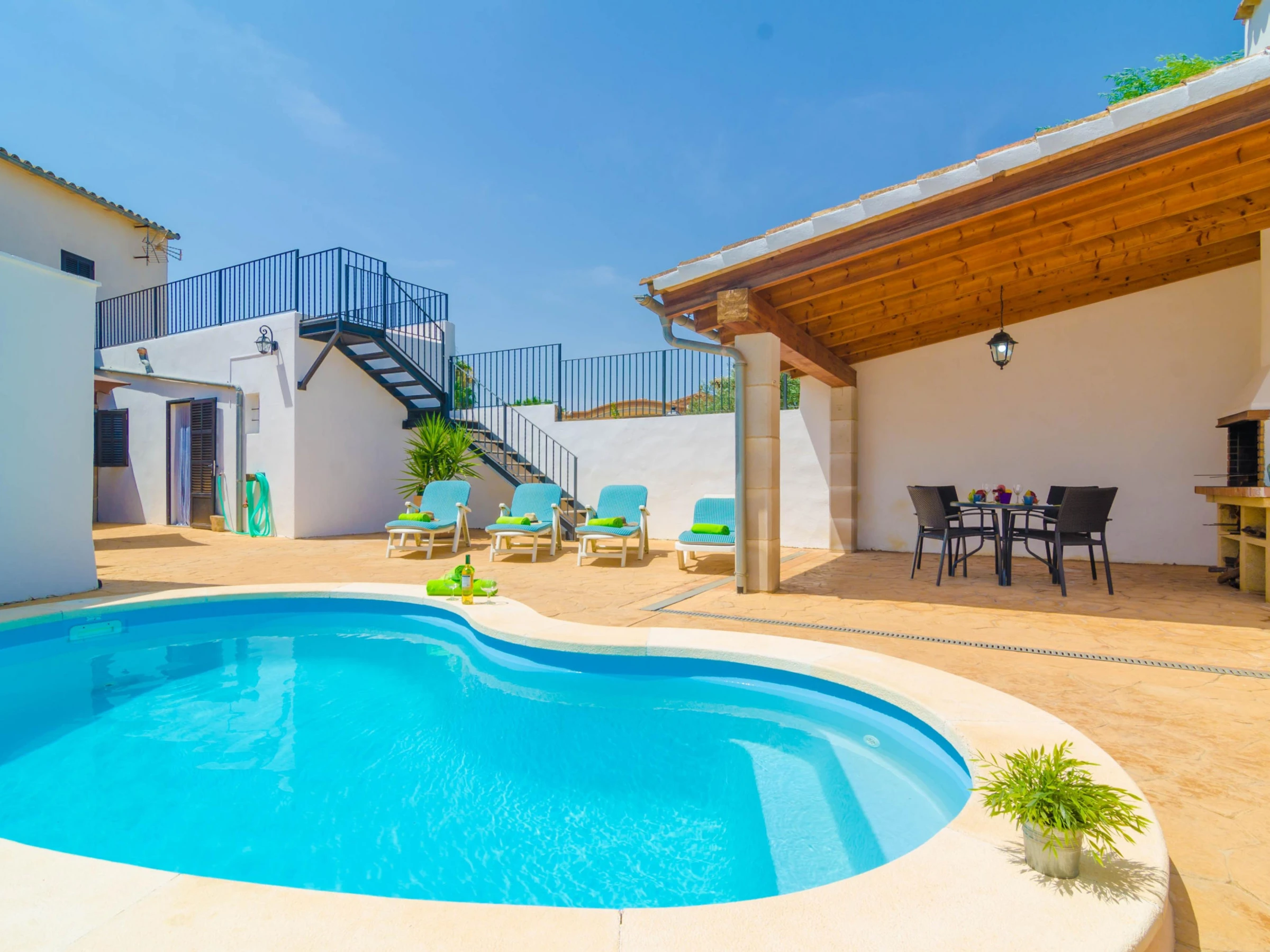 In this beautiful and comfortable house you will enjoy the peace of being in the outskirts of an interior village but with all comforts. Outside you can refresh in the beautiful swimming pool sizing 5 x 3 metres and with a 1.5 metres depth. After the dip, nothing like sunbathing on one of the sunbeds or having a drink under the porch while cooking the barbecue. By the house entrance there is another sitting area to have lunch or dinner with your loved ones enjoying the amazing Majorcan weather. The property is within the village and it has direct neighbours.