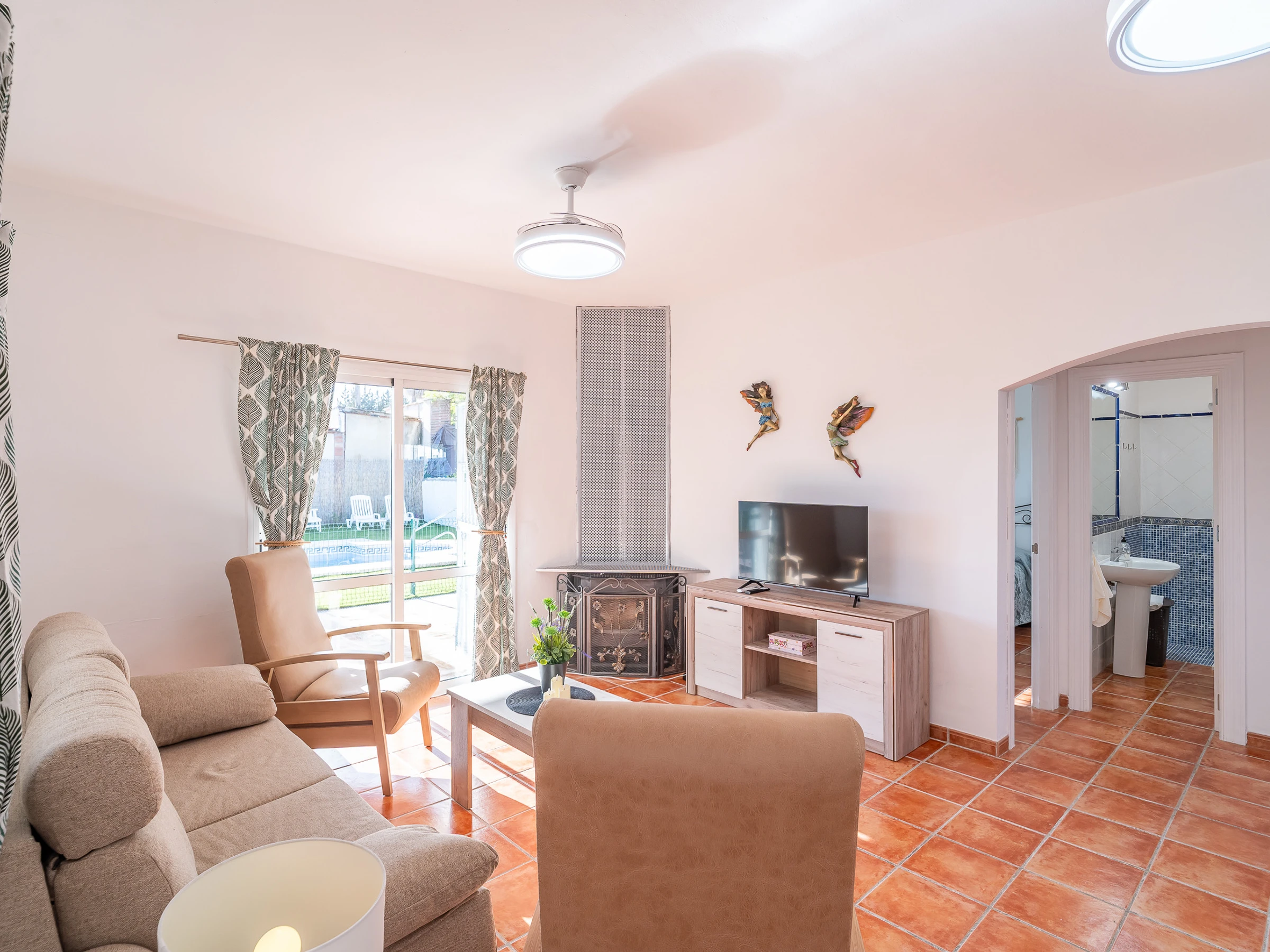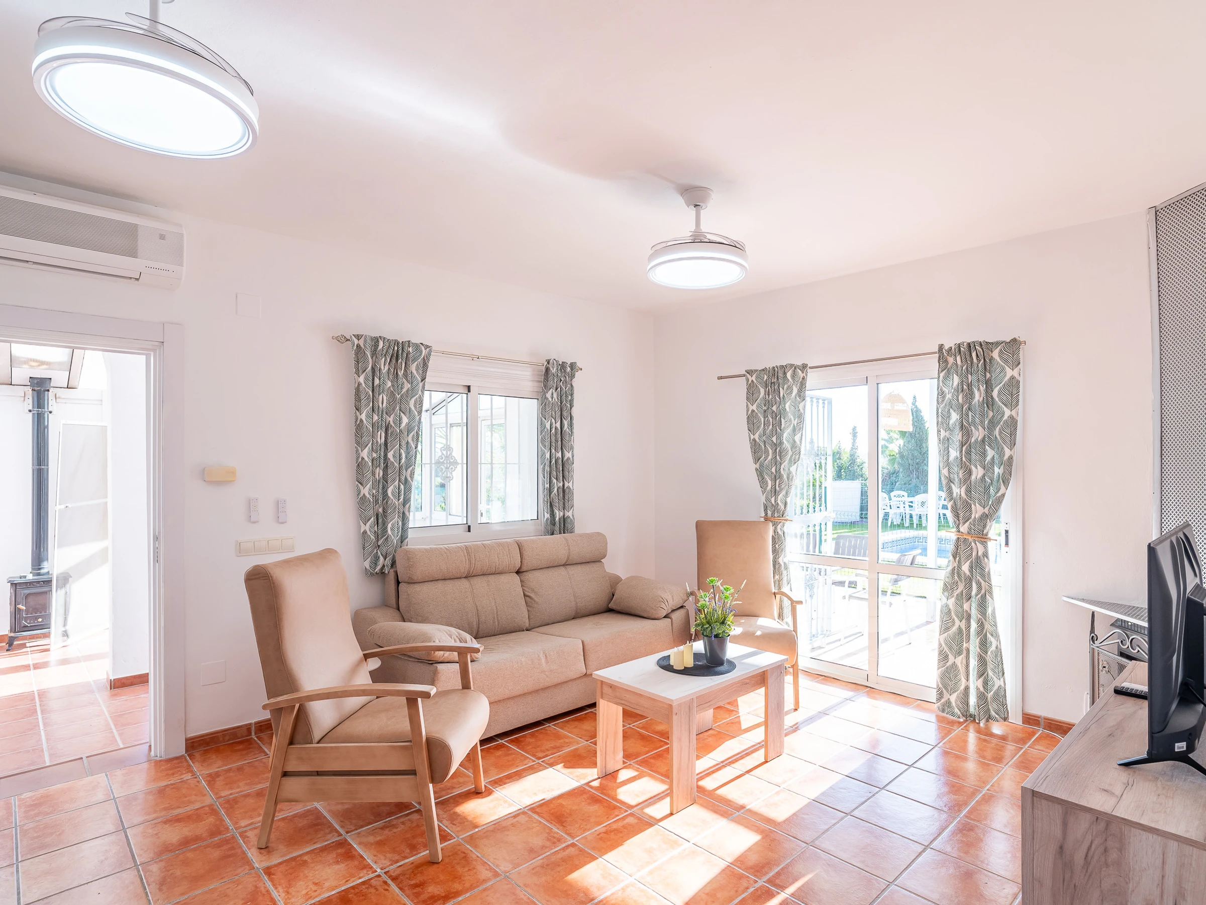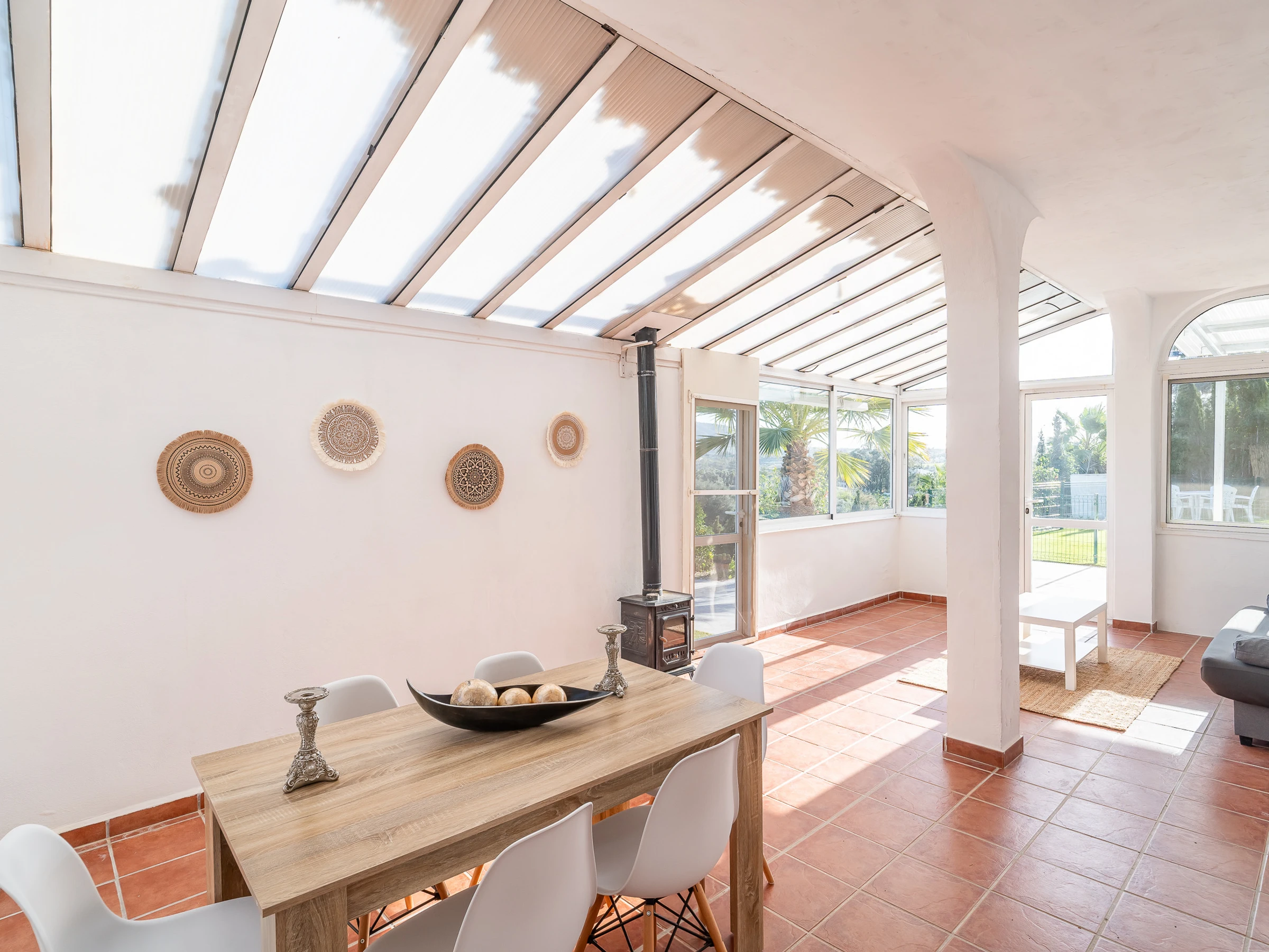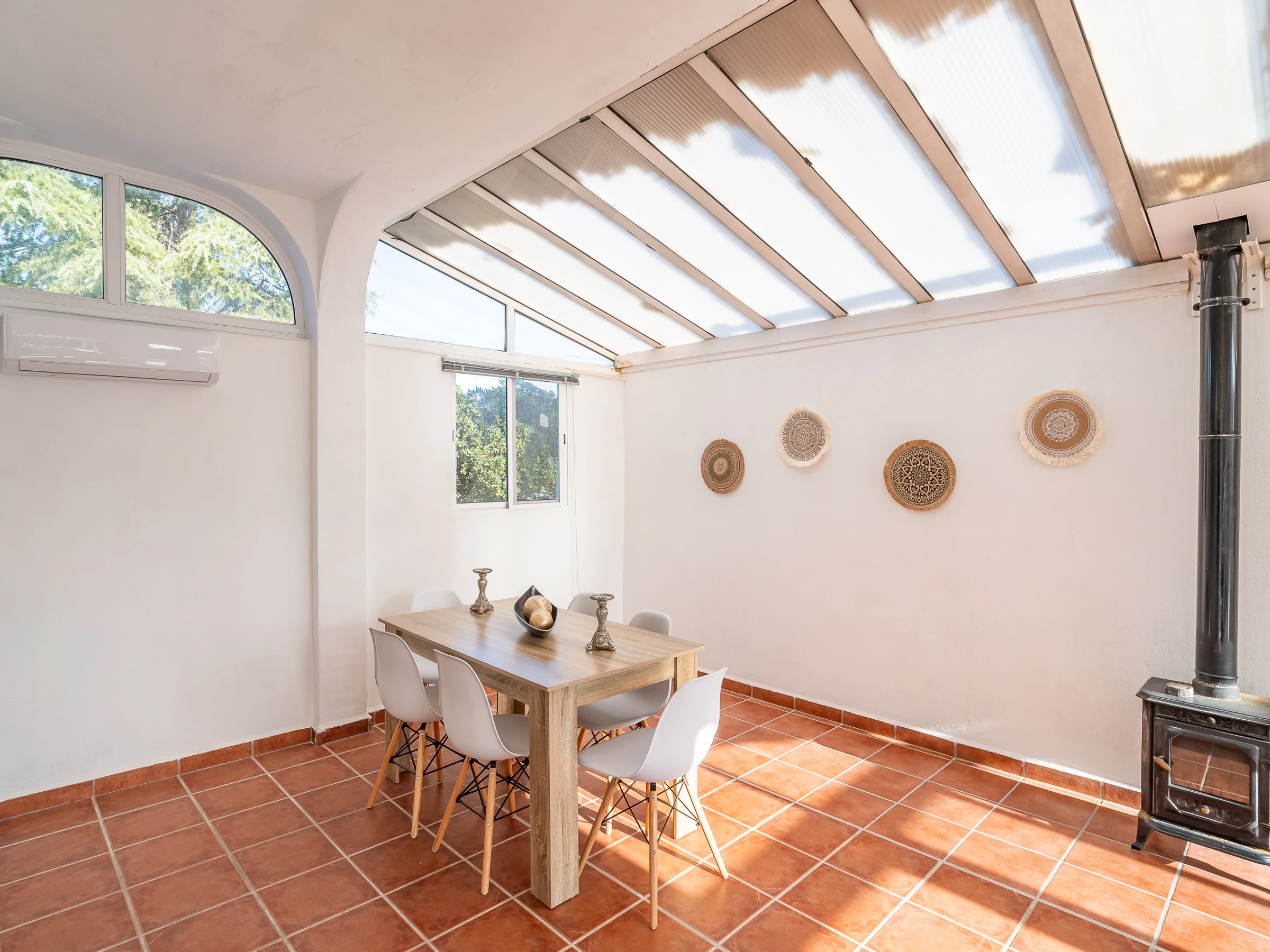 The interior combines comfort and functionality: living room with air conditioning, glazed winter terrace with A/C and fireplace, 4 fans, heat pump heating, wifi, Smart TV, mosquito nets throughout the dwelling and a very cosy rest area for any time of the year.