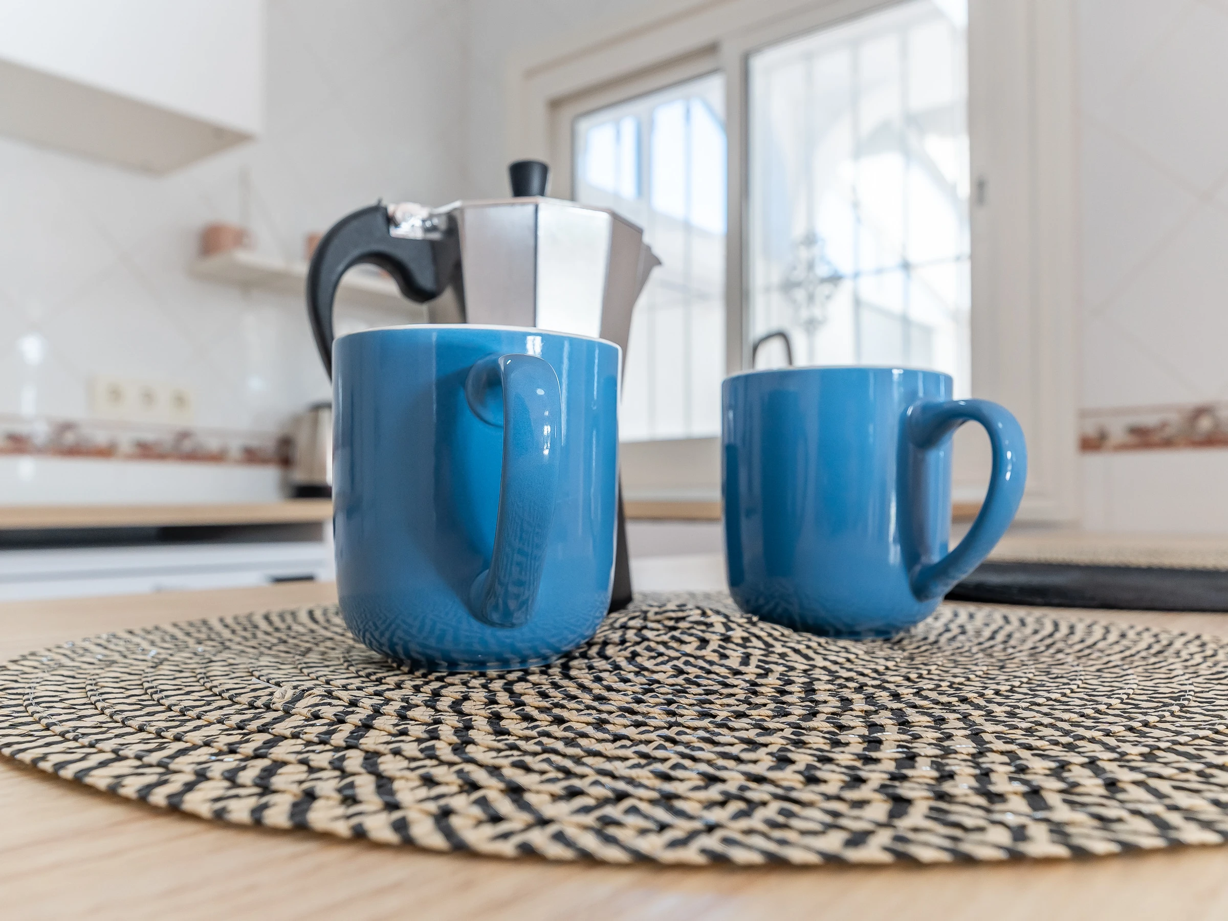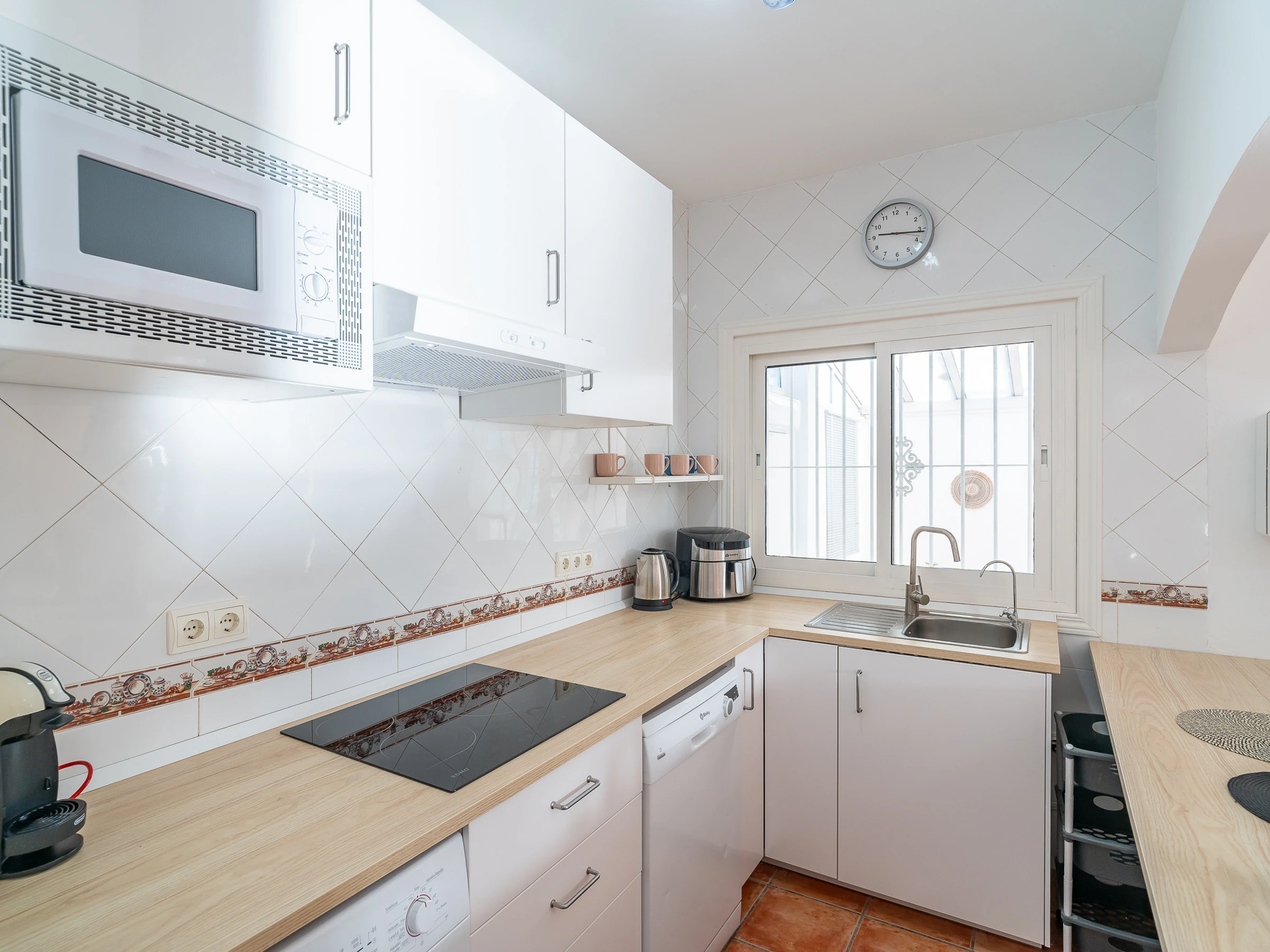 The American kitchen is fully equipped with a ceramic hob, dishwasher, microwave, air fryer, Dolce Gusto and Italian coffee machine, toaster, kettle and juicer, designed for both short and long stays.