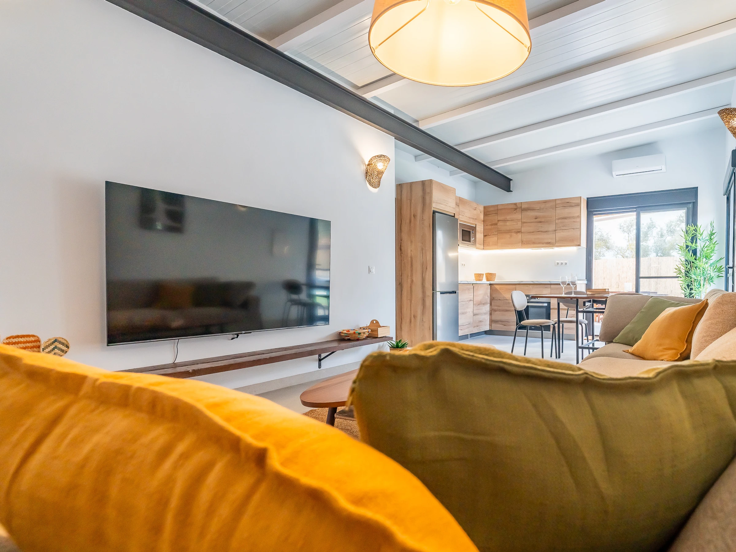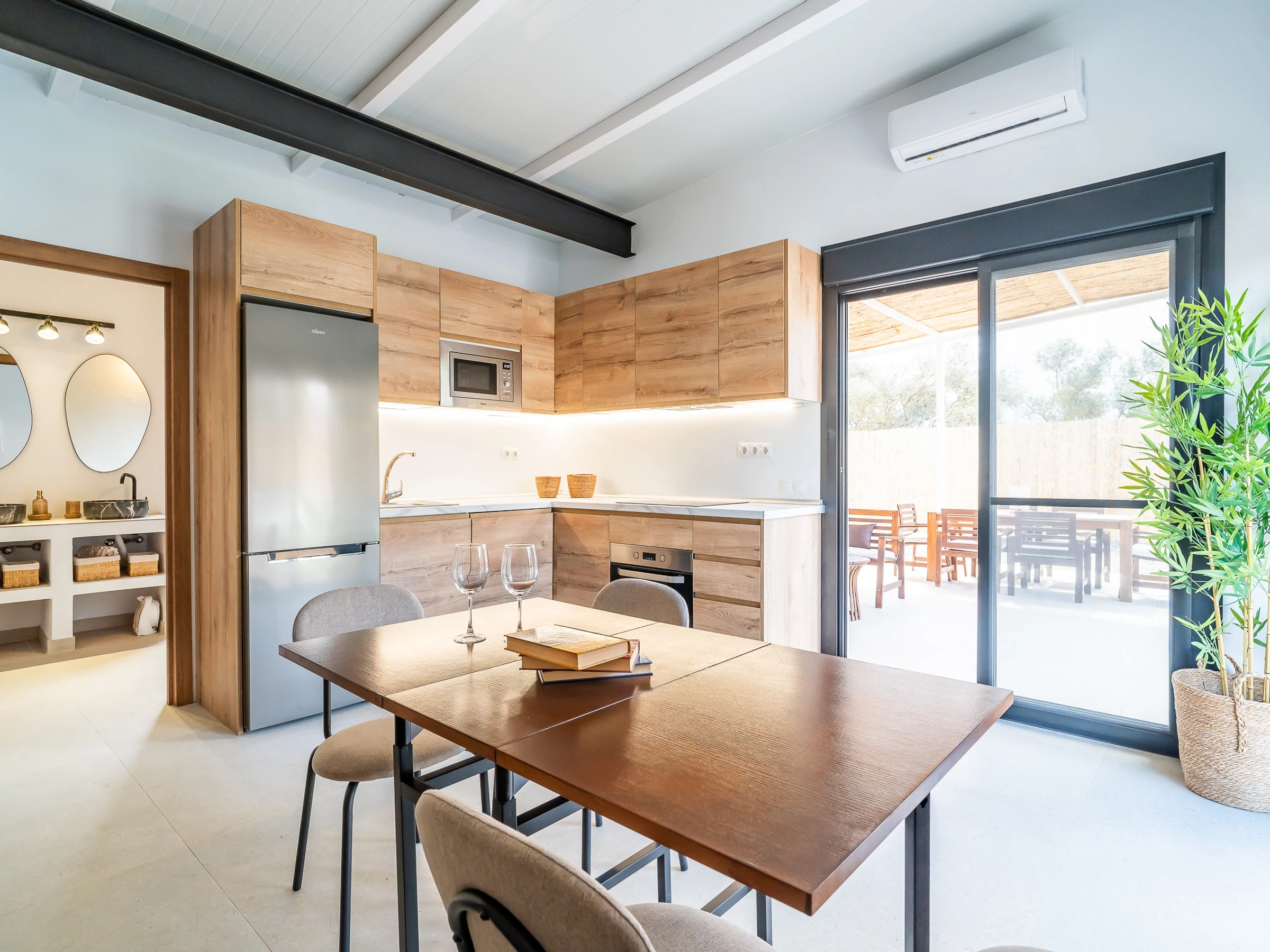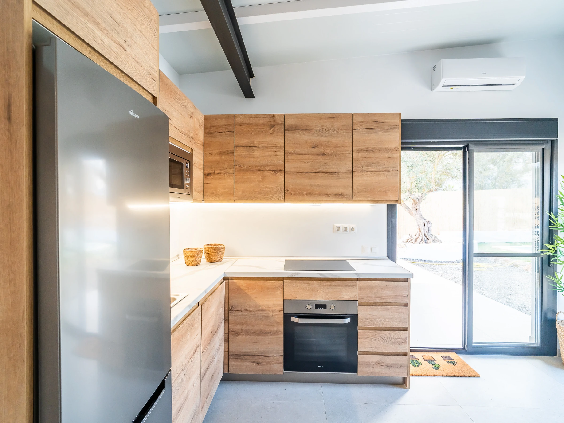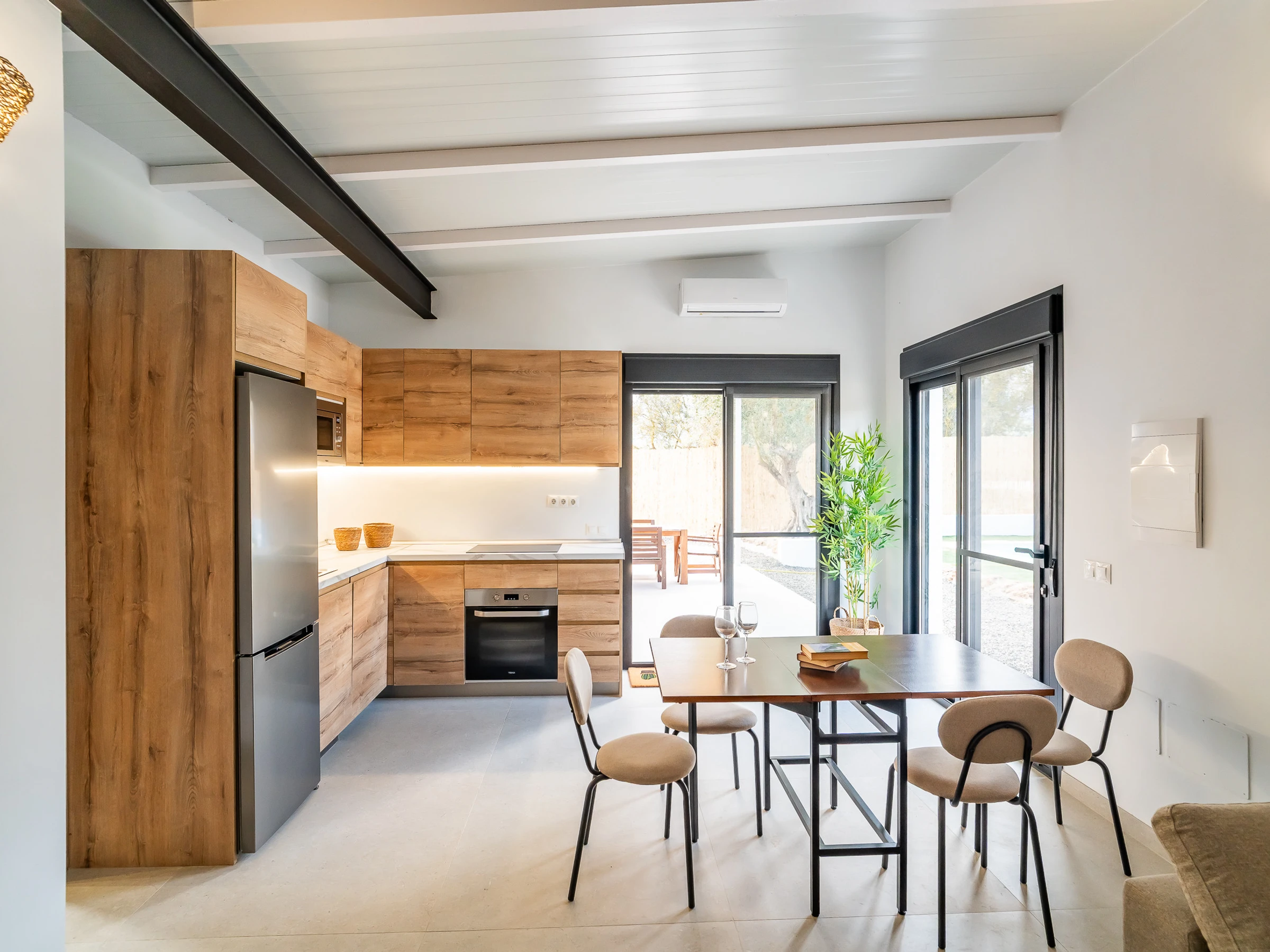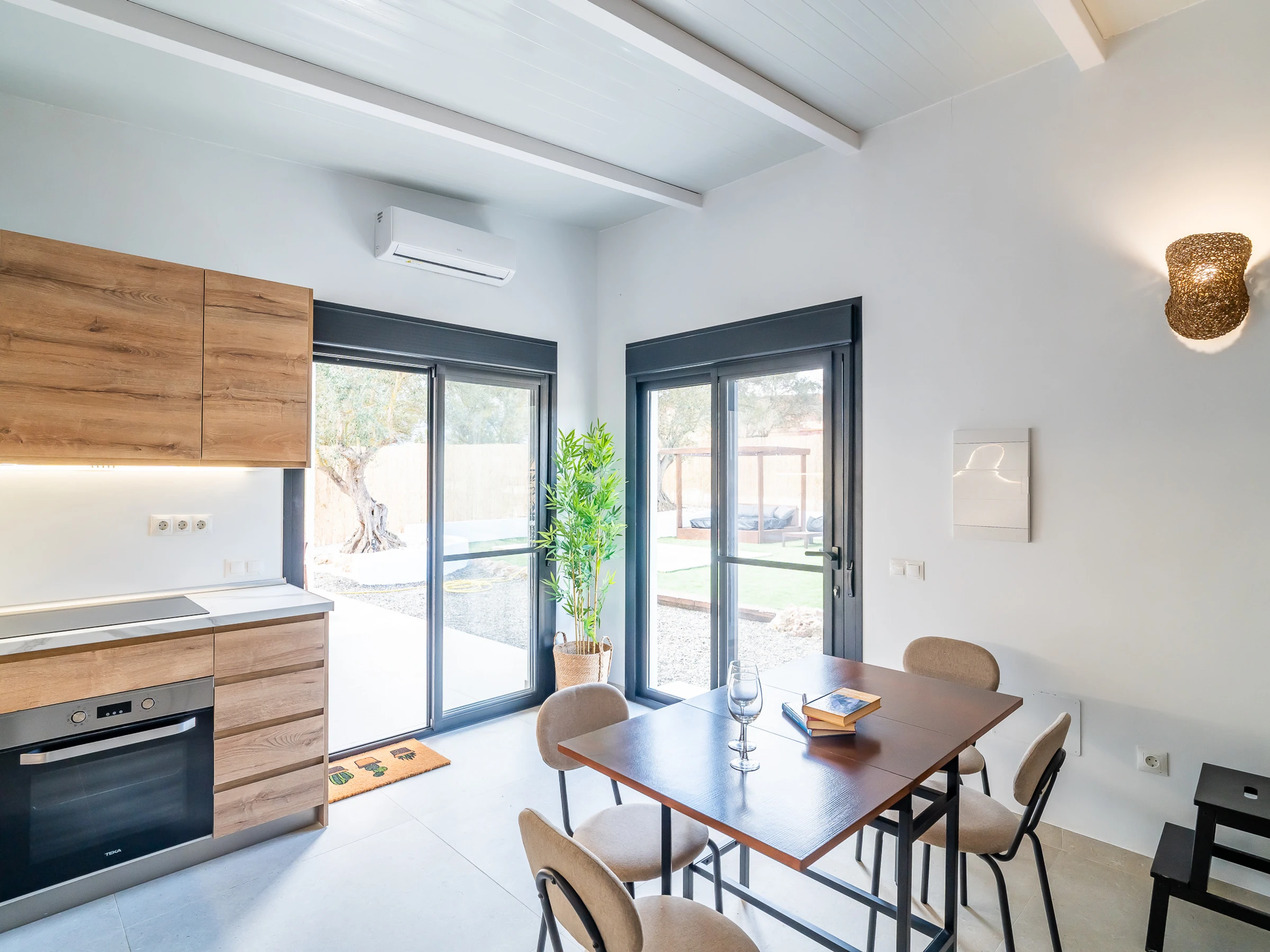 The interior is designed to enjoy in any season of the year, with air conditioning throughout the accommodation, wifi, Smart TV, mosquito nets throughout the house and heat pump heating. The American induction kitchen is fully equipped with oven, microwave, dishwasher, fridge, freezer, Italian coffee maker, toaster, kettle and juicer, offering everything necessary for short or long stays. It also has a cot and high chair, ideal for families with babies.