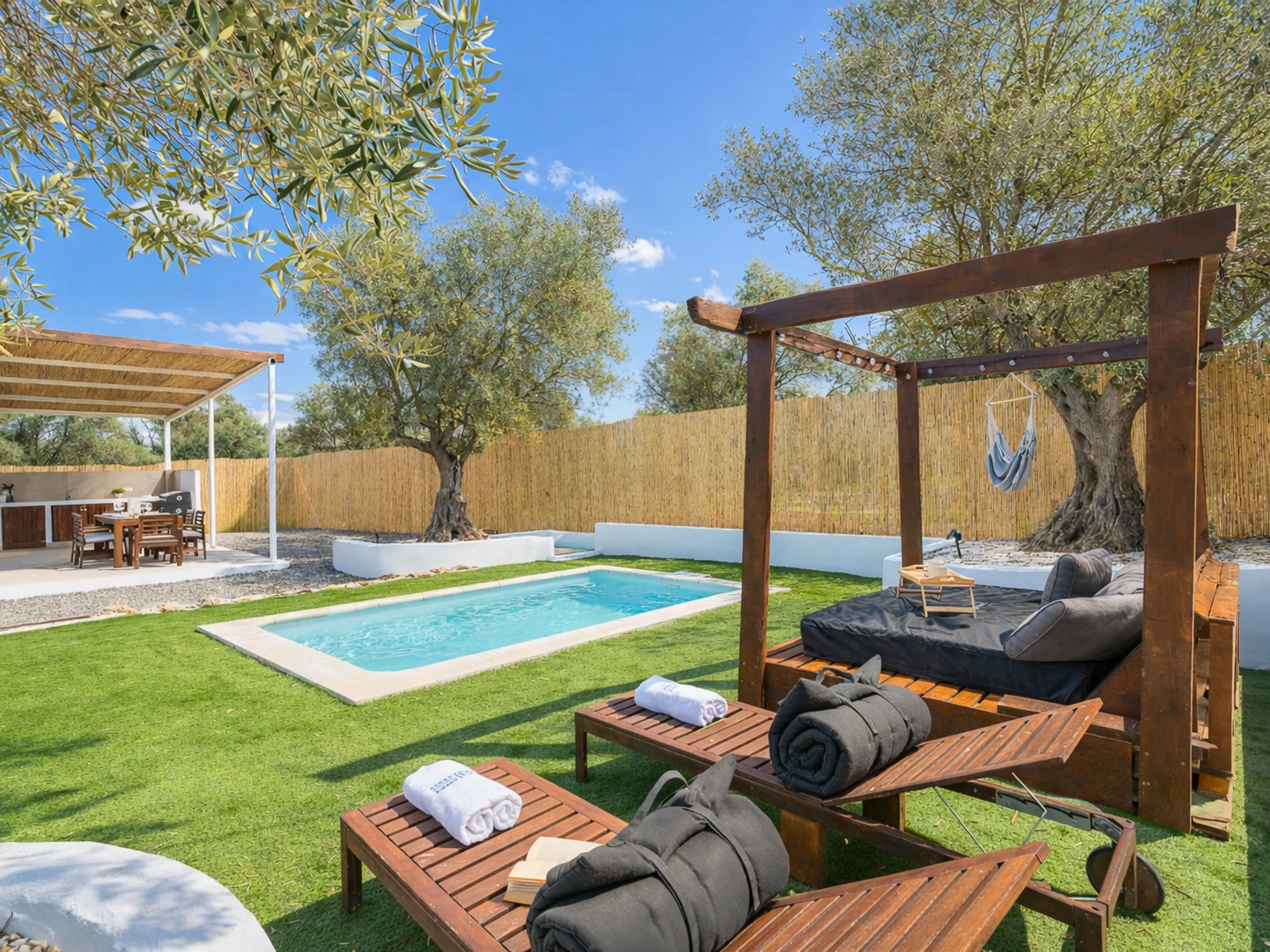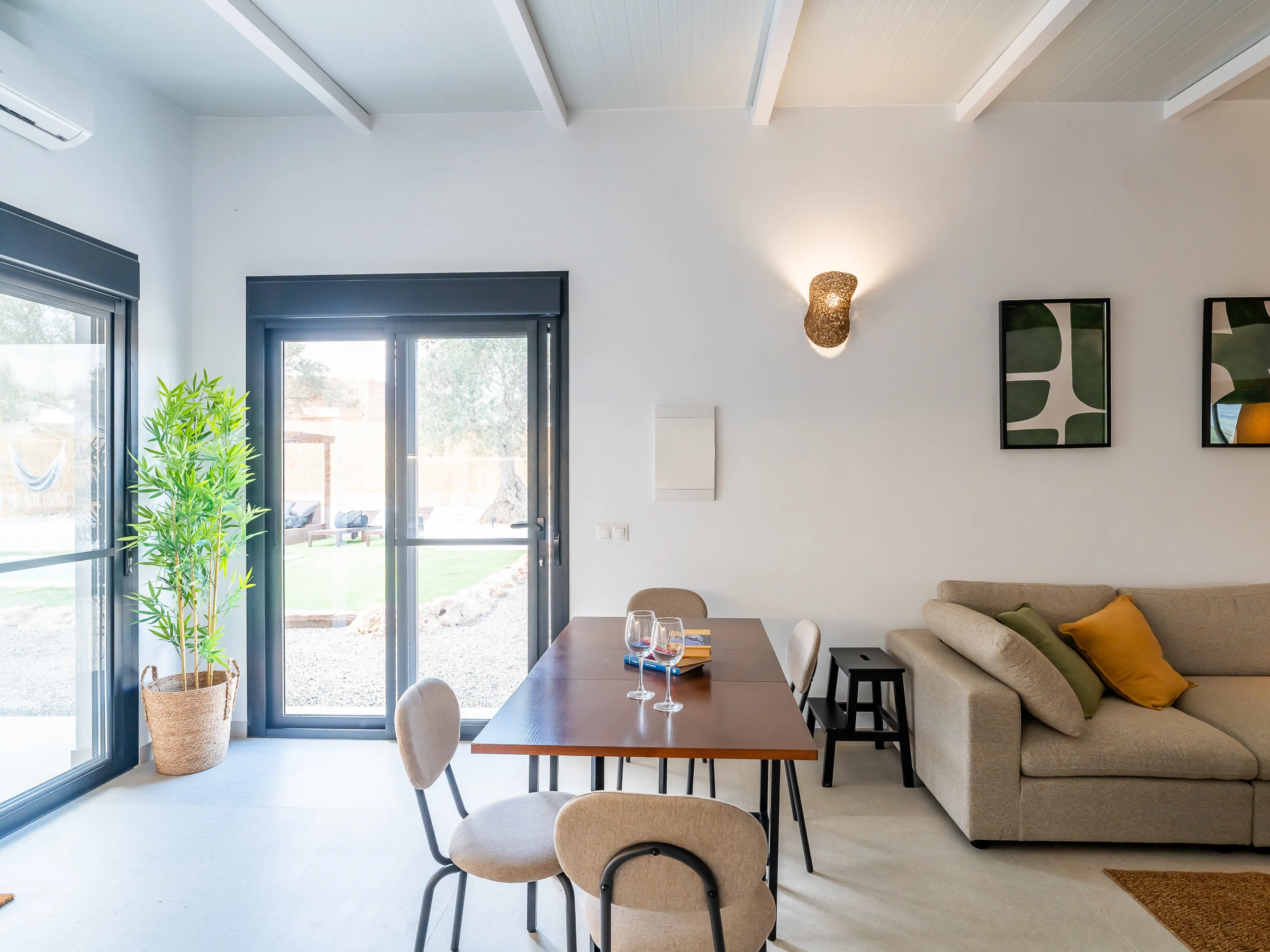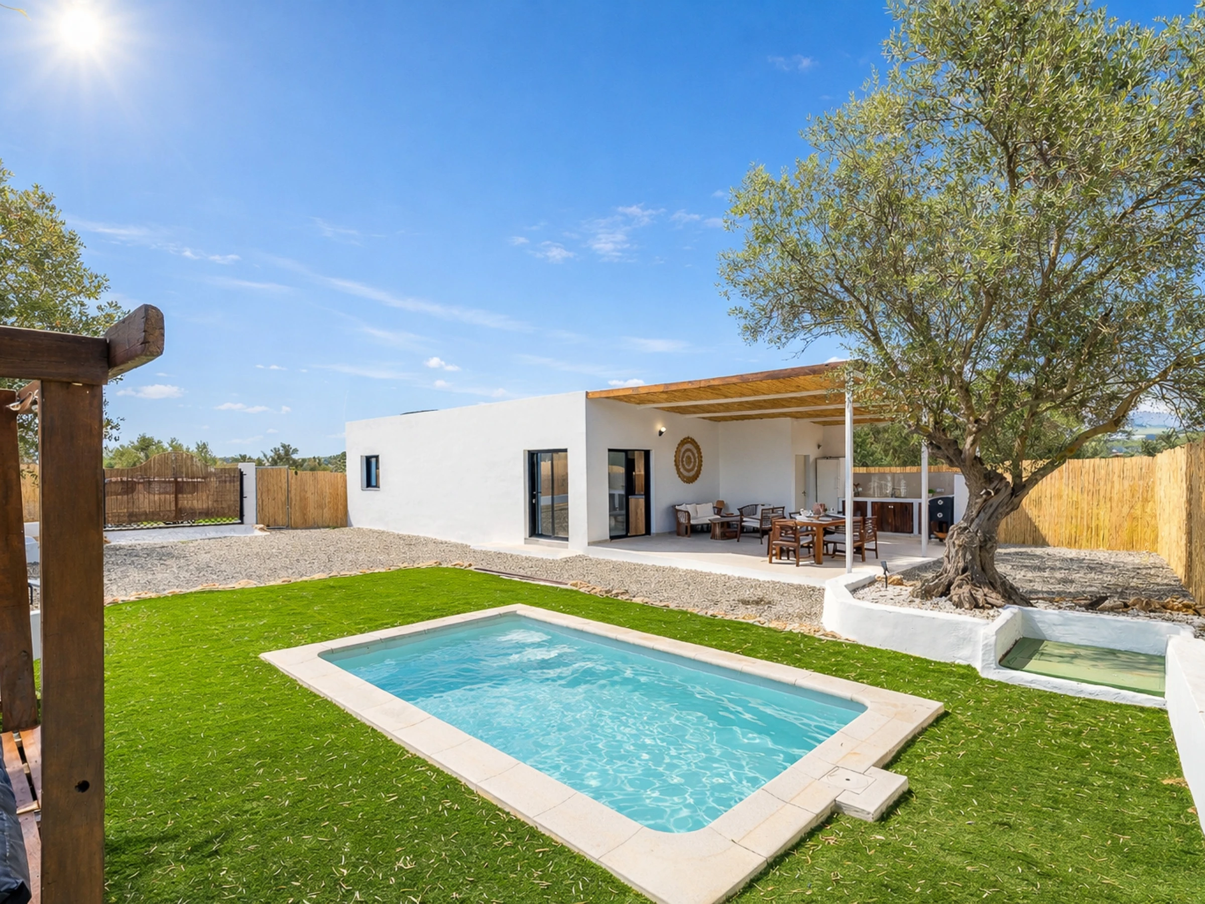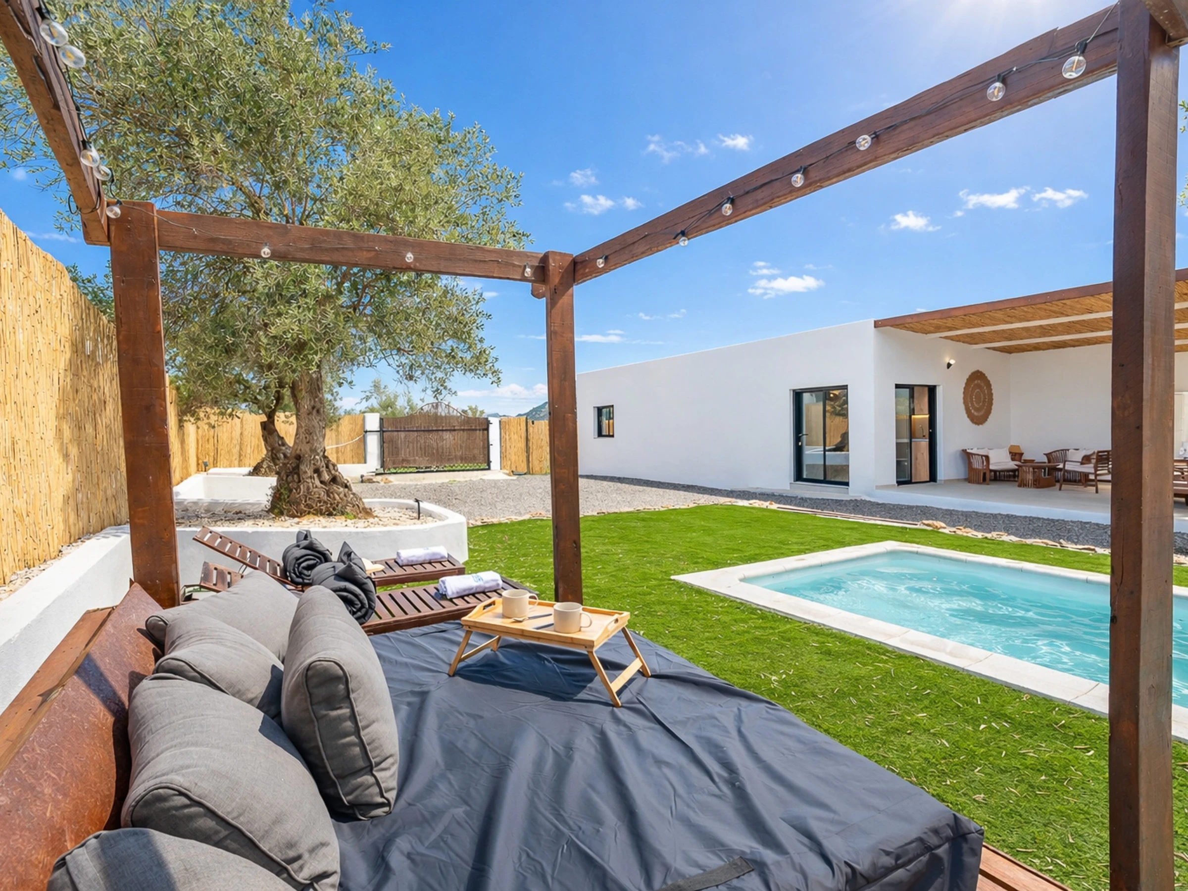 The interior is designed to enjoy in any season of the year, with air conditioning throughout the accommodation, wifi, Smart TV, mosquito nets throughout the house and heat pump heating. The American induction kitchen is fully equipped with oven, microwave, dishwasher, fridge, freezer, Italian coffee maker, toaster, kettle and juicer, offering everything necessary for short or long stays. It also has a cot and high chair, ideal for families with babies.