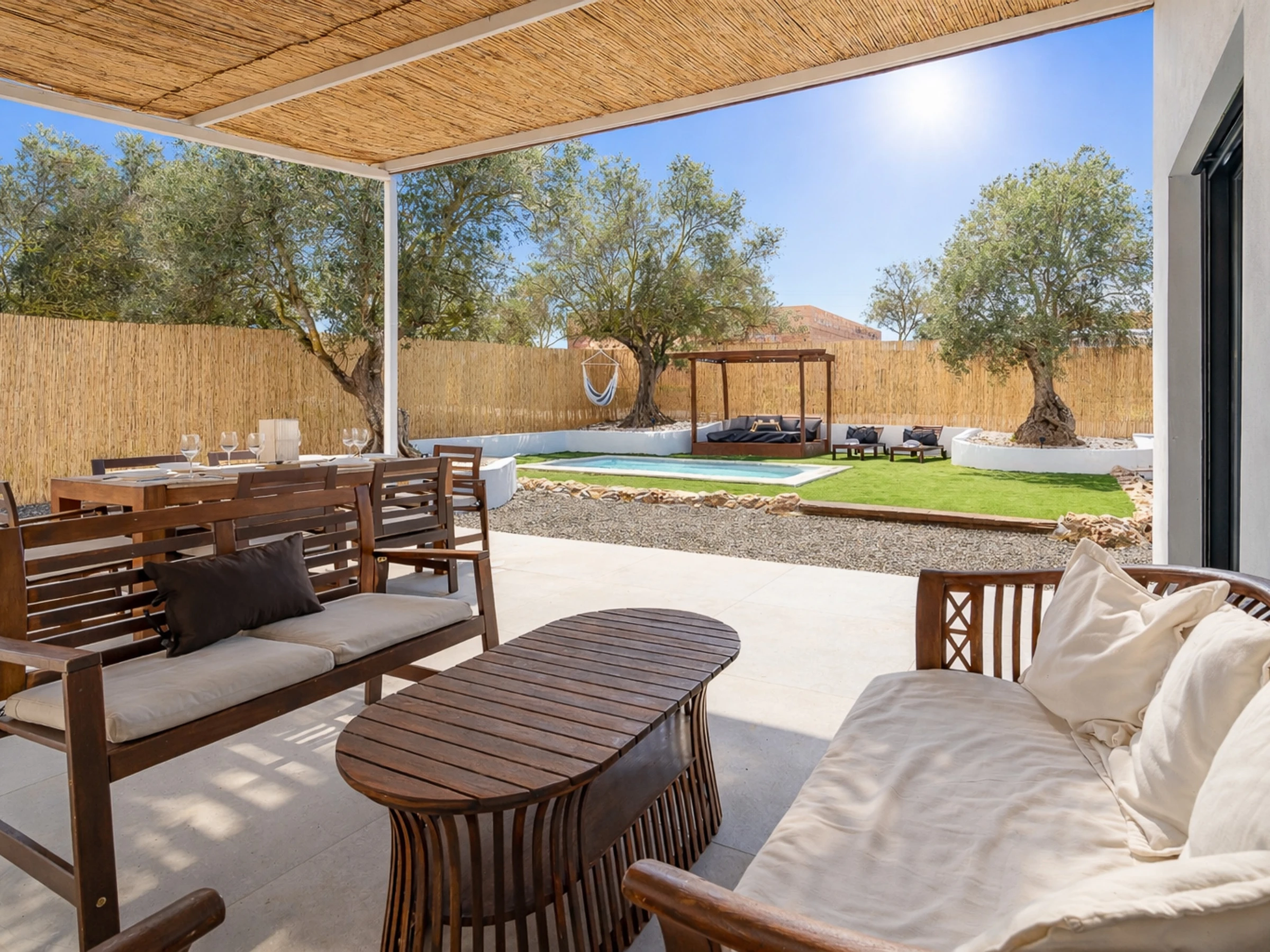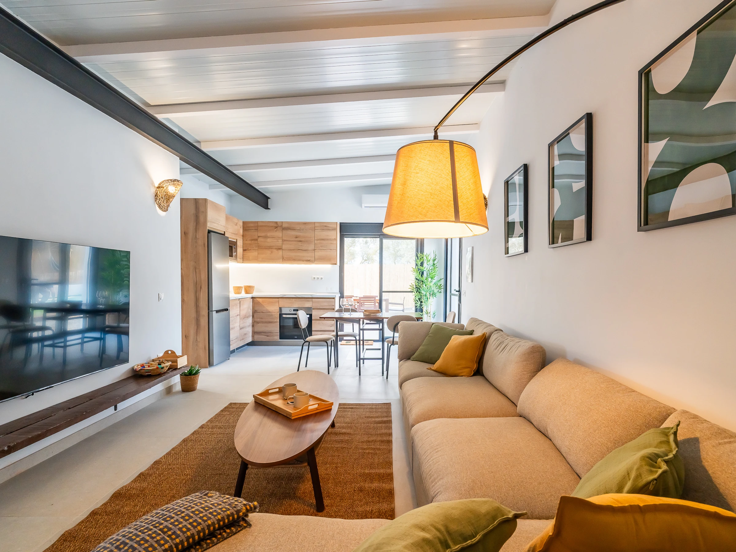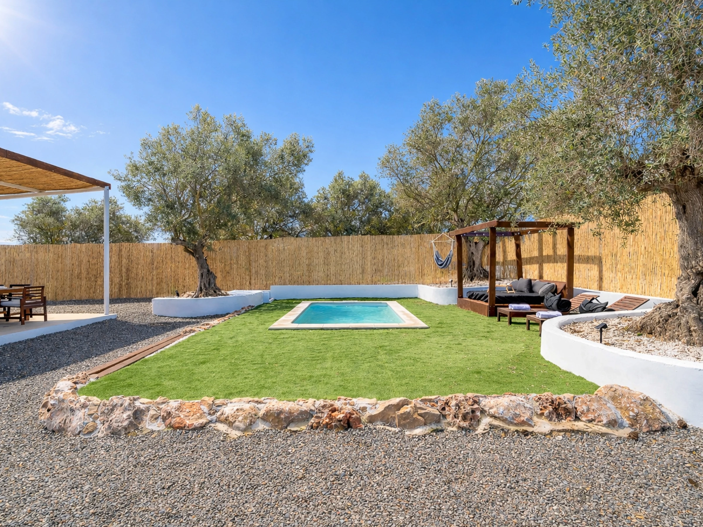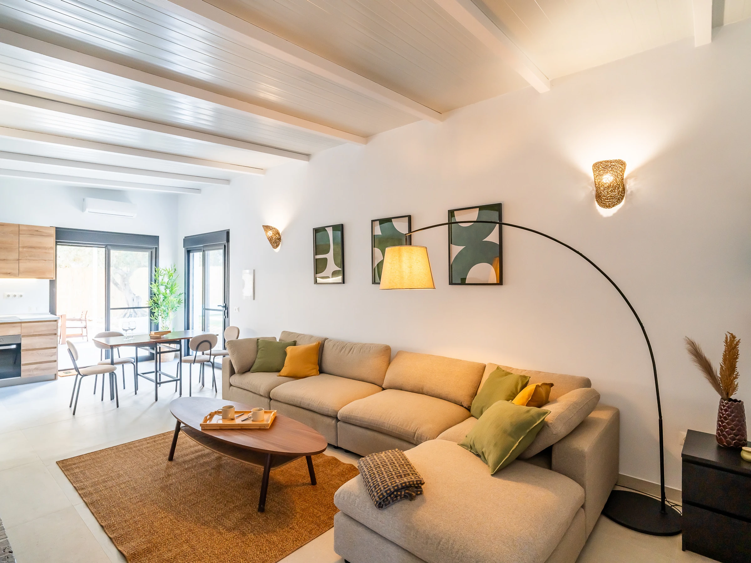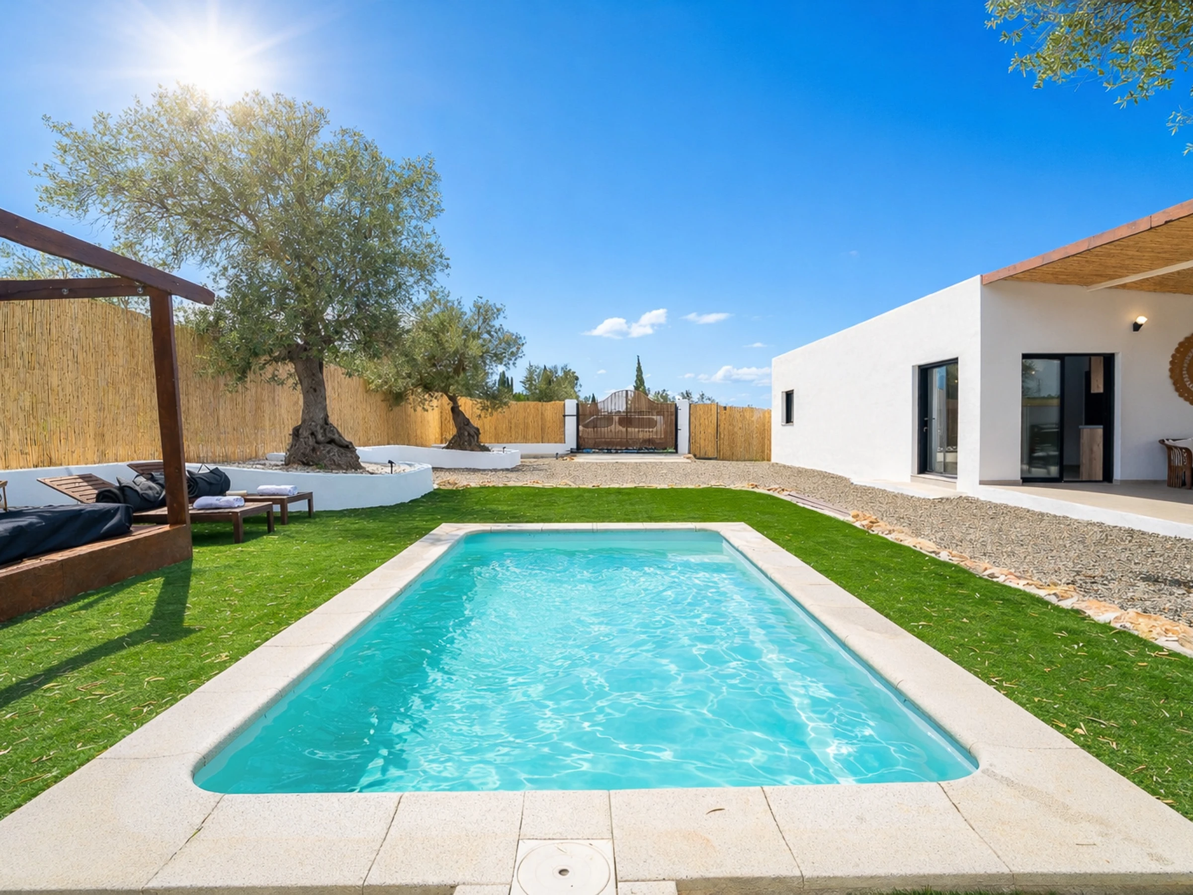 The interior is designed to enjoy in any season of the year, with air conditioning throughout the accommodation, wifi, Smart TV, mosquito nets throughout the house and heat pump heating. The American induction kitchen is fully equipped with oven, microwave, dishwasher, fridge, freezer, Italian coffee maker, toaster, kettle and juicer, offering everything necessary for short or long stays. It also has a cot and high chair, ideal for families with babies.