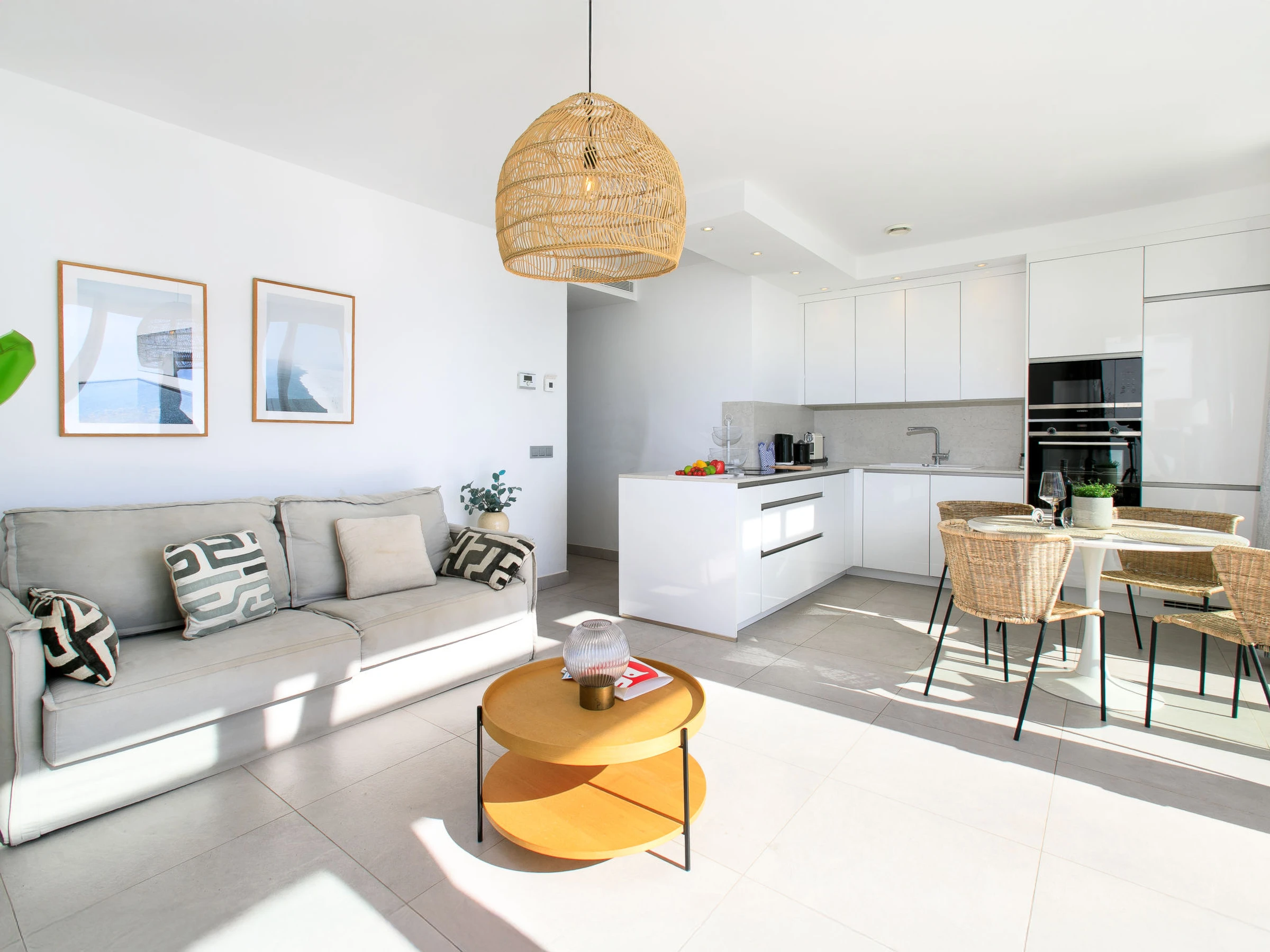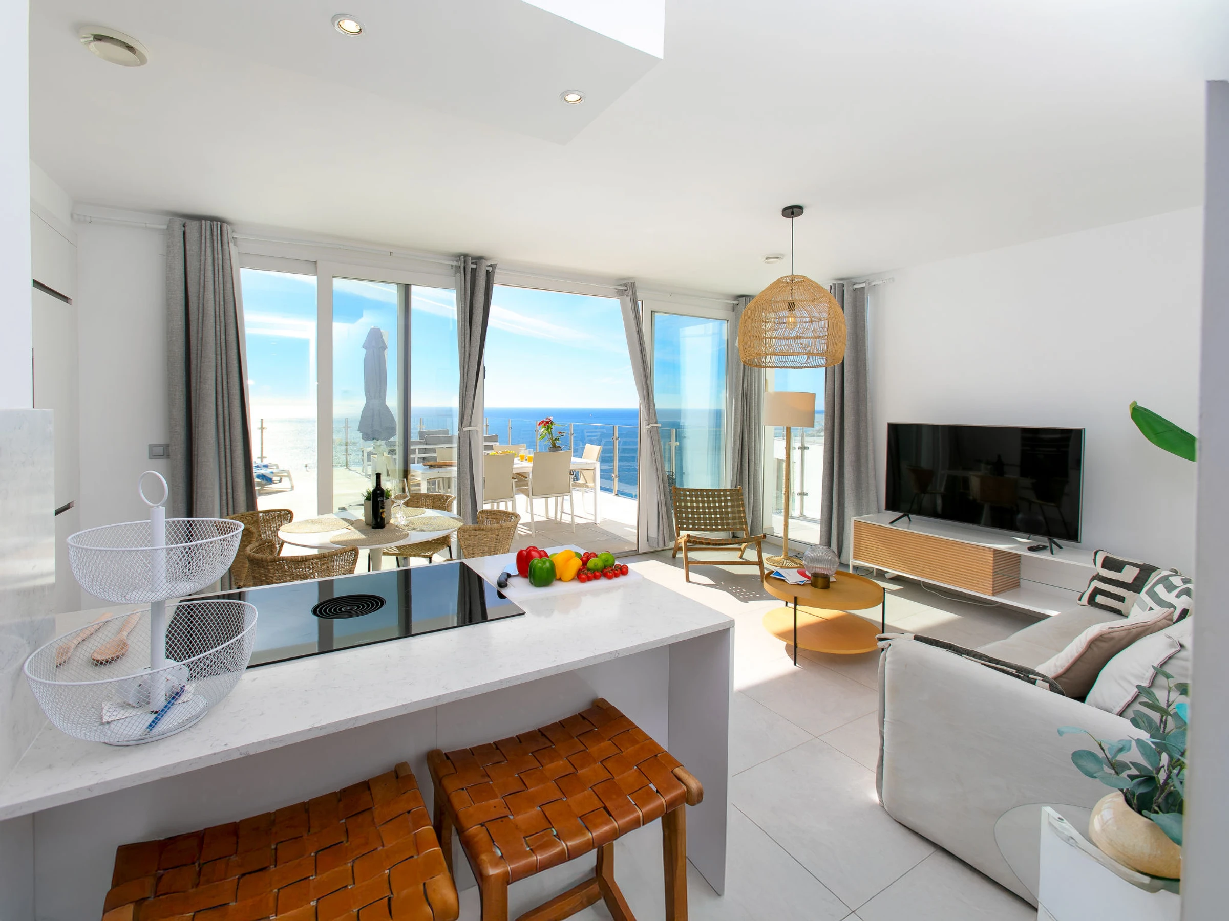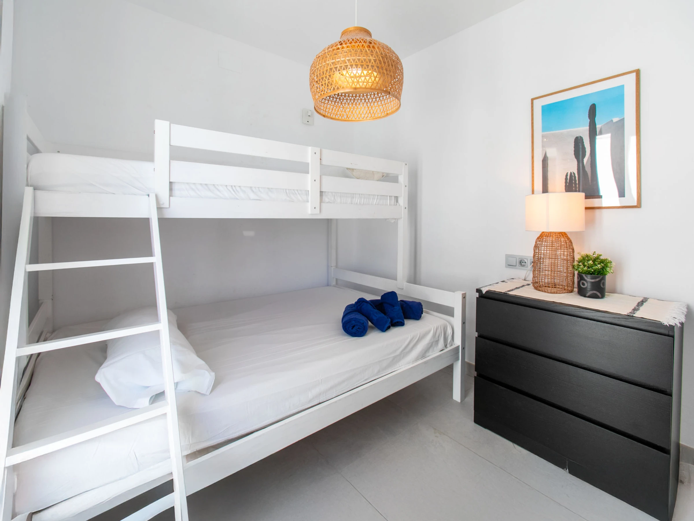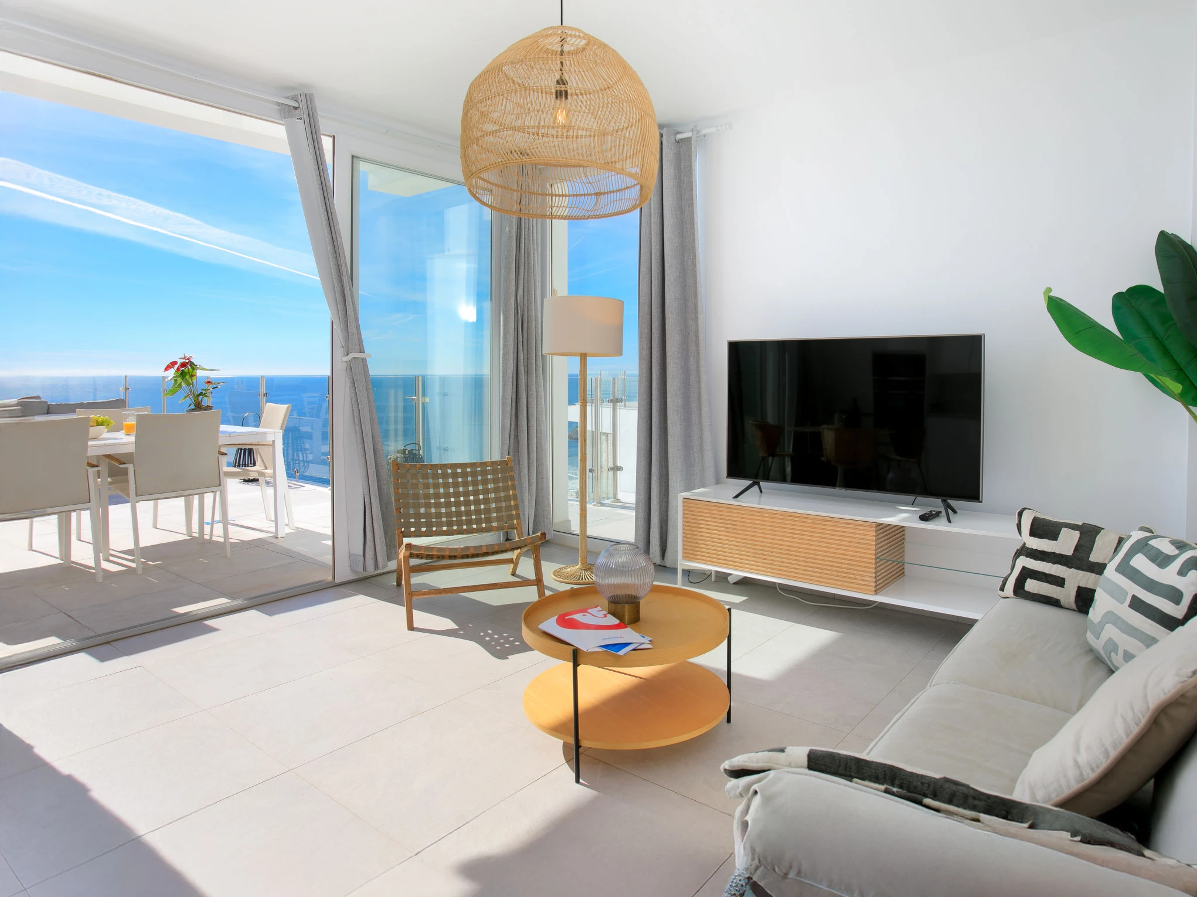 "Ocean view Sauna & Spa", 3-room apartment 66 m2. Spacious and bright, comfortable and beautiful furnishings: living/dining room with digital TV, air conditioning and forced-air heating. Exit to the terrace. 1 room with 1 french bed (160 cm, length 200 cm), shower/WC, air conditioning and forced-air heating. Exit to the terrace. 1 room with 1 x 2 bunk beds (140 cm, length 200 cm), air conditioning and forced-air heating. Exit to the terrace. Open kitchen (oven, dishwasher, 4 ceramic glass hob hotplates, toaster, kettle, microwave, freezer, electric coffee machine). Shower/WC. Terrace furniture, barbecue, deck chairs. Panoramic view of the sea, the mountains and the resort. Facilities: washing machine, safe, iron, children's high chair, baby cot for up to 3 year olds, hair dryer. Internet (WiFi, free). [hidden] // Reg. Nr.: ESFCTU000029013001087333000000000000000[hidden]6