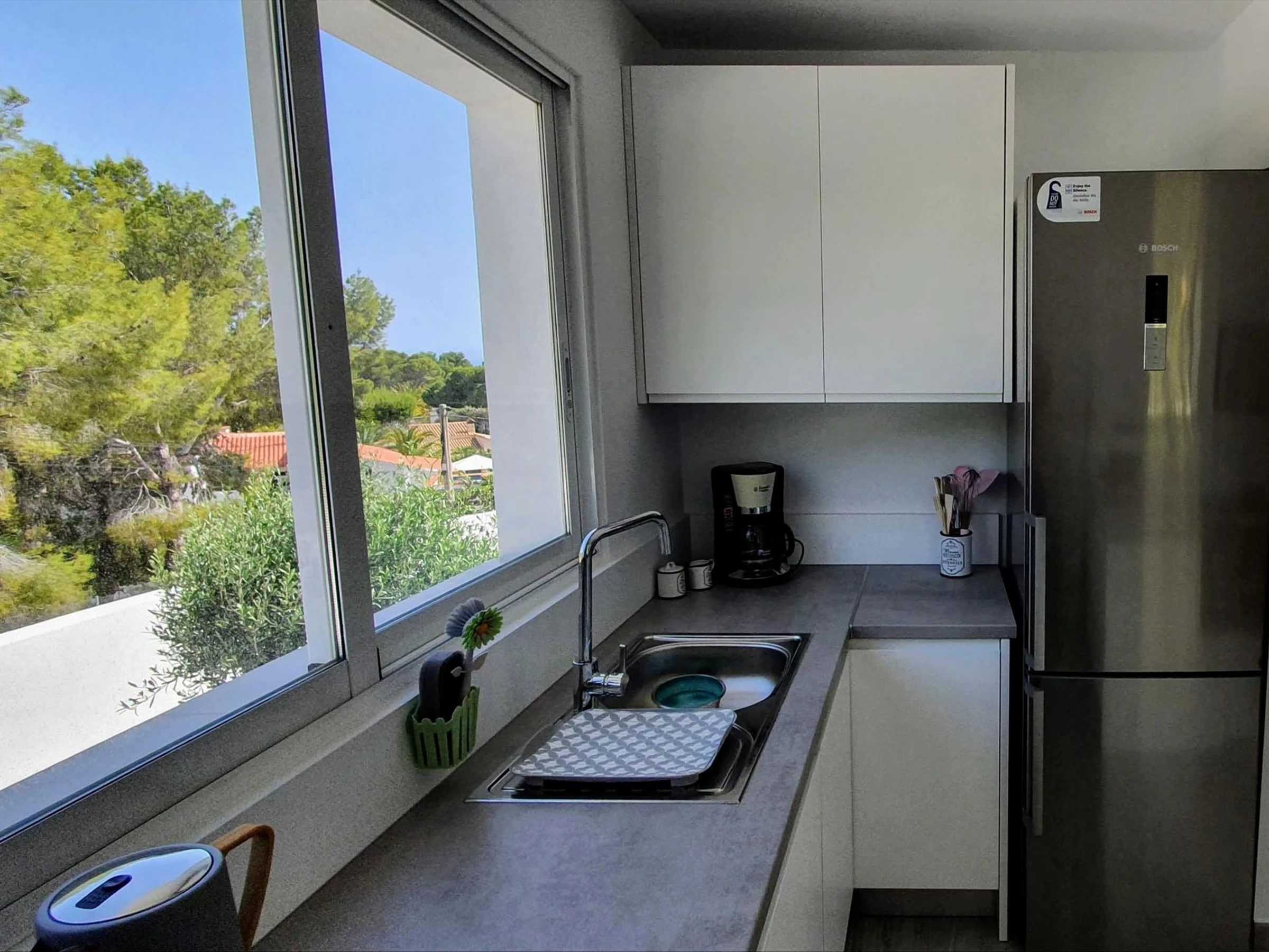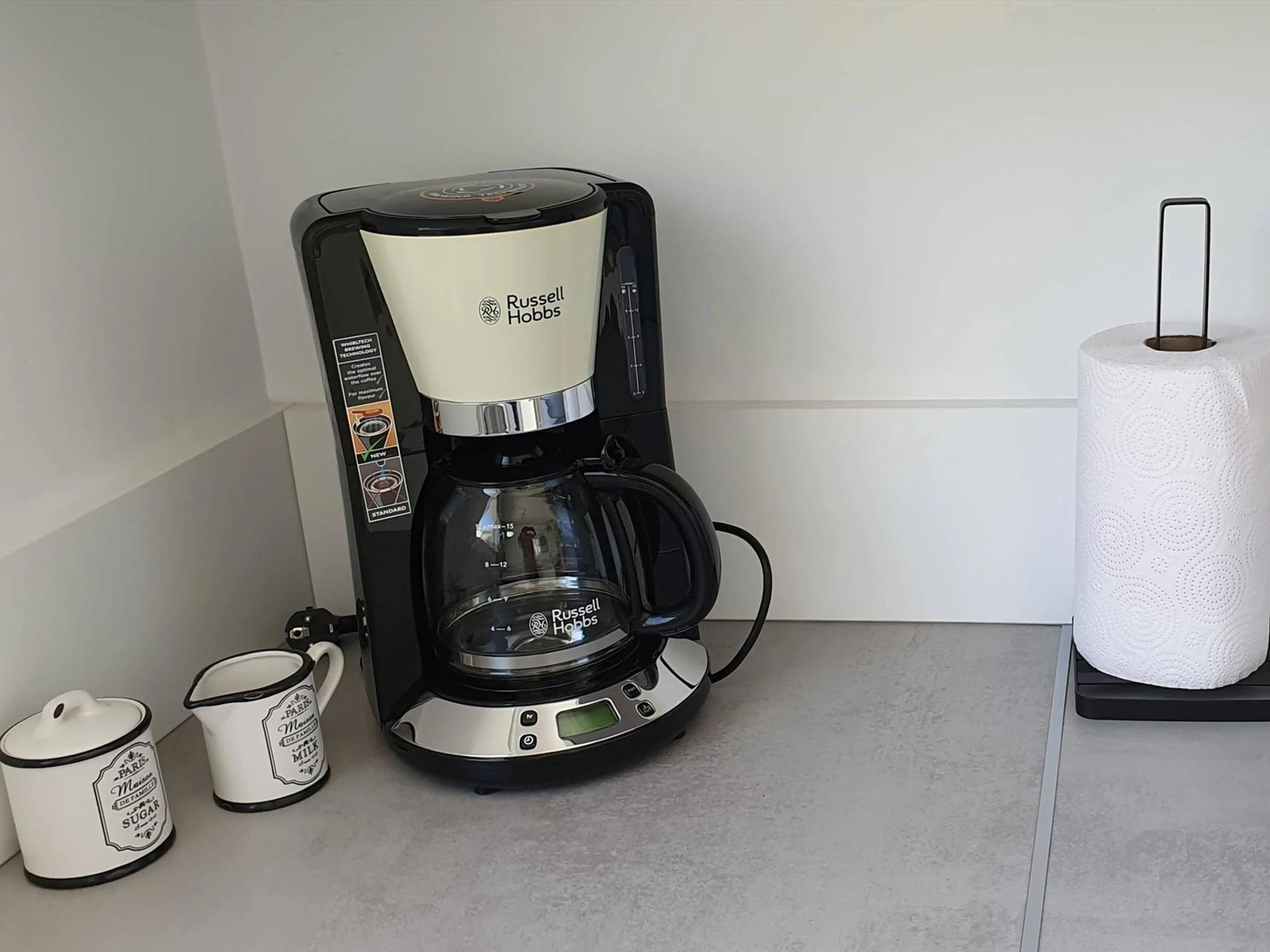 refrigerator-freezer, coffee machine, electric kettle, toaster, and juicer