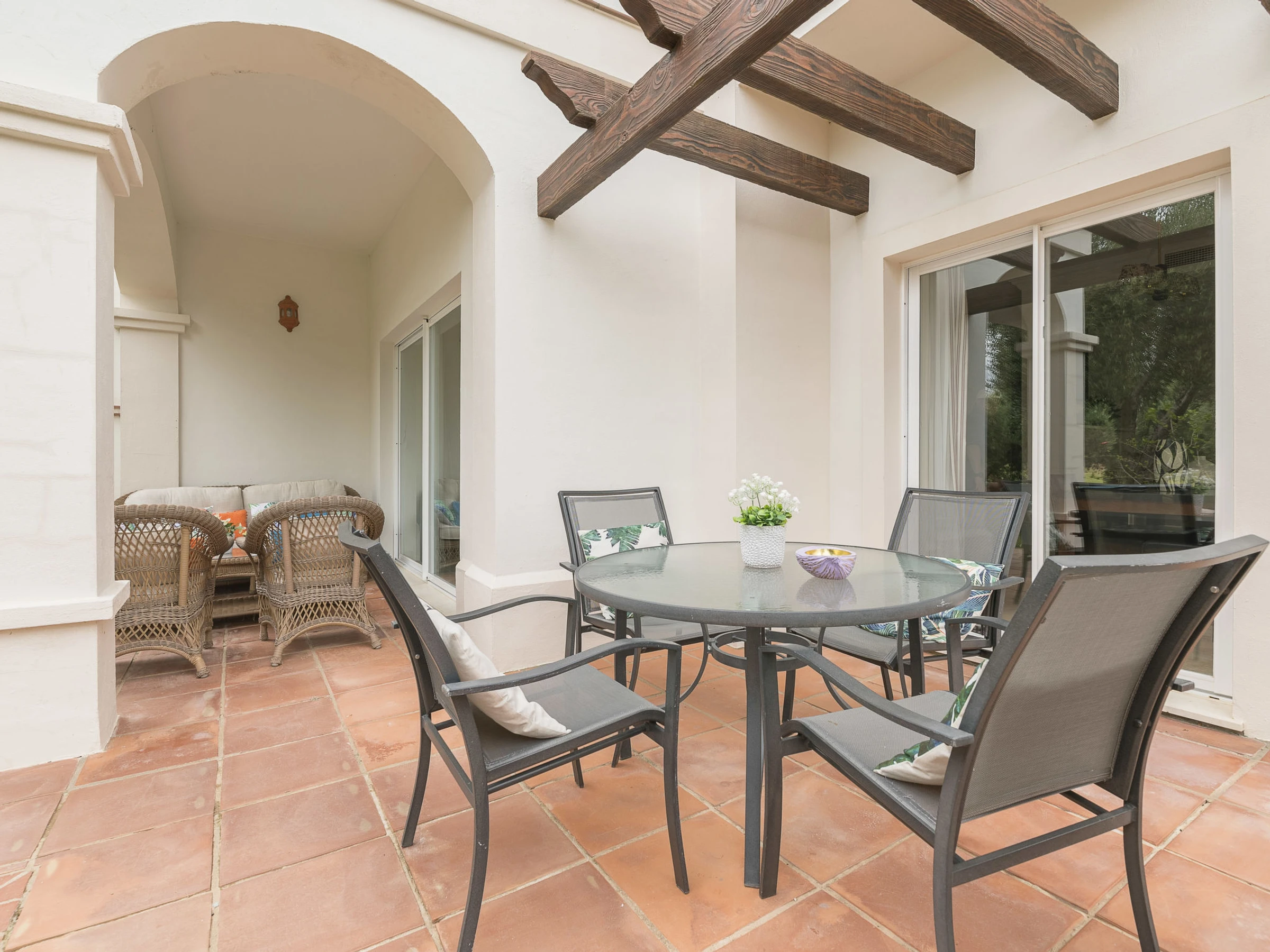 Paddle tennis courts. Comfortable resort "Arcos Gardens Golf". In a quiet, sunny position, on the golf course. For shared use: garden with lawn, swimming pool (18 x 9 m, depth [hidden] - [hidden] cm, seasonal availability: [hidden] - [hidden] Children's pool, tennis (extra), parking. Bus stop 6 km, railway station 38 km. Golf course (18 hole) 20 m. Hiking paths: Sierra de Grazalema 18 km. The owner does not accept any youth groups. Please note: airfield 40 km from the property. Neighbourhood highly sensitive to noise. Quietness and good behaviour expected.