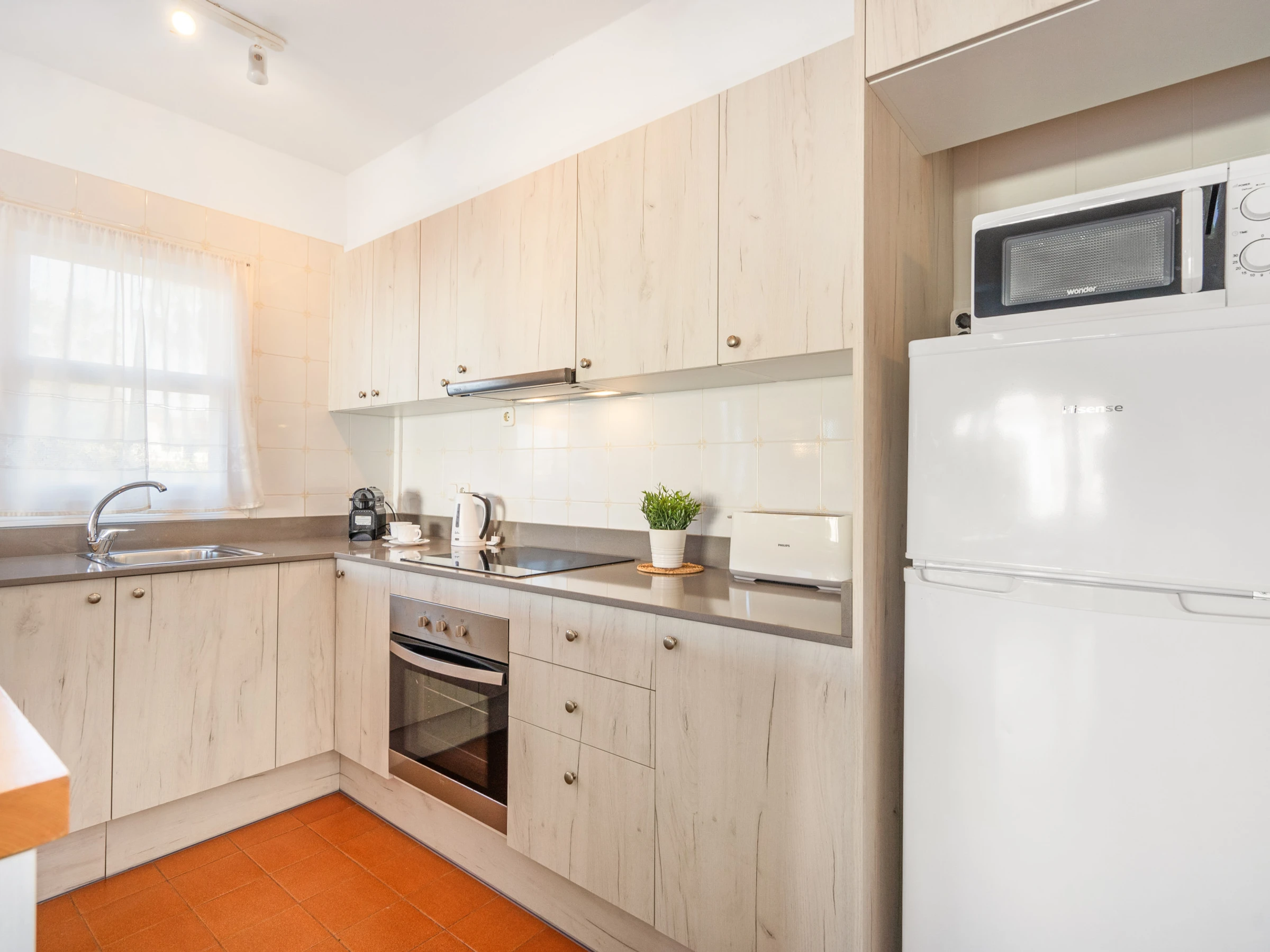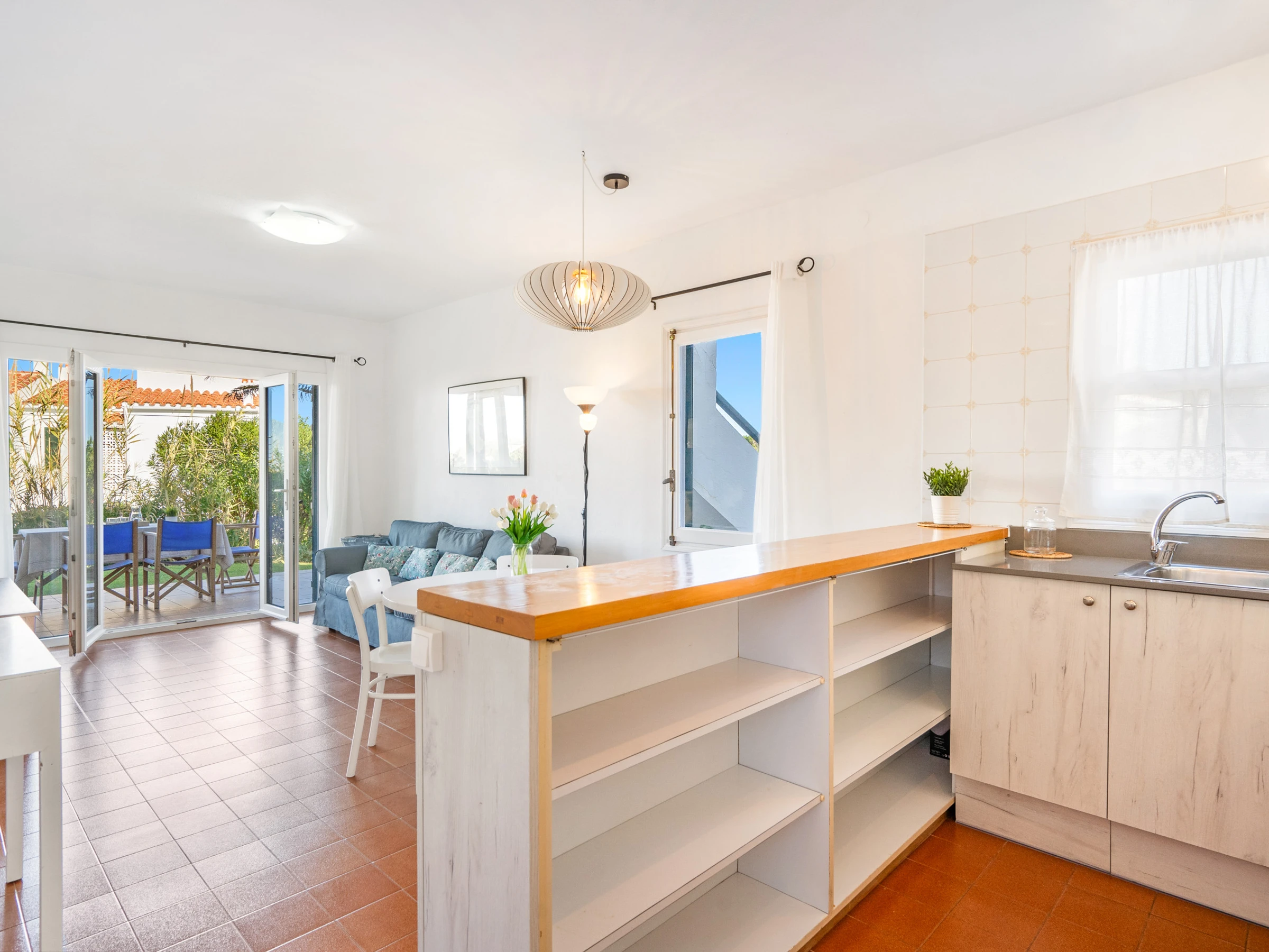 It consists of a living room with air conditioning, an open kitchen with a breakfast bar, fully equipped with a microwave, fridge, electric oven and hob, kettle, Italian coffee maker and a toaster.