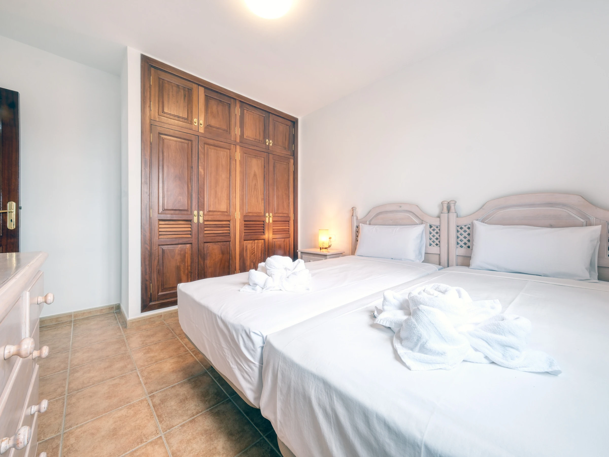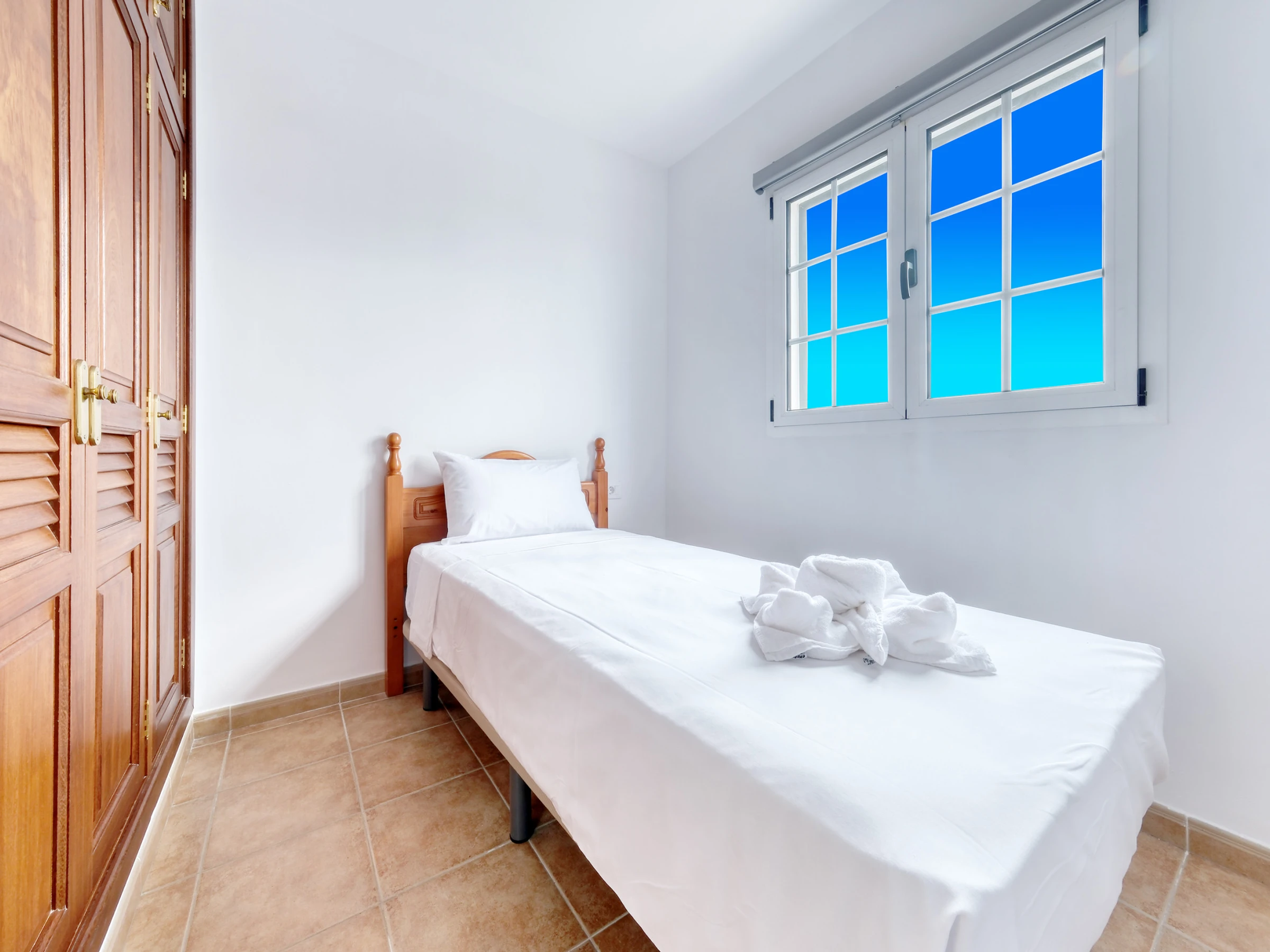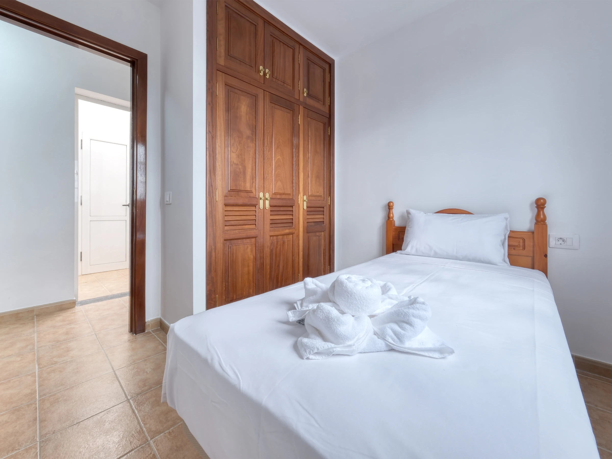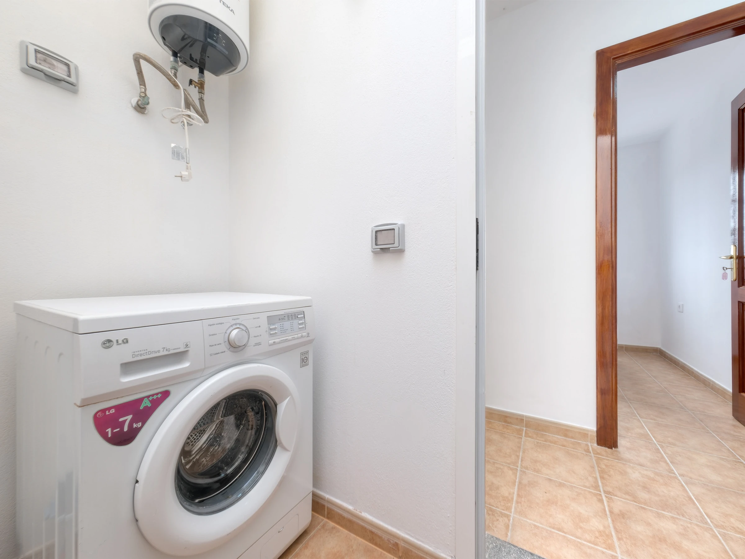 The distribution includes 2 bright bedrooms: one with a single bed and another with two single beds that, upon request, can be converted into a double bed. Both have built-in wardrobes. Additionally, the property has a bathroom with a shower and washing machine for greater comfort.