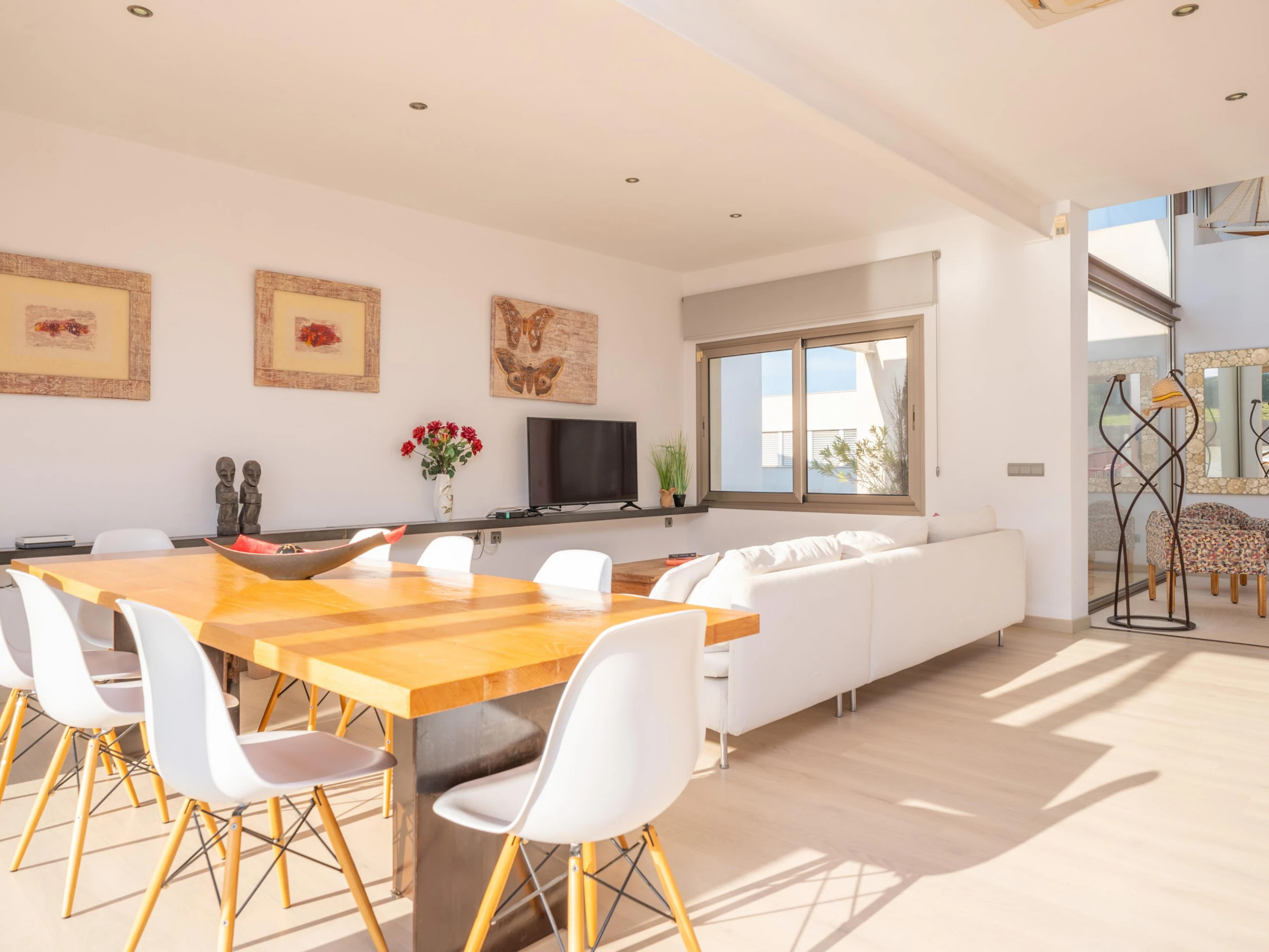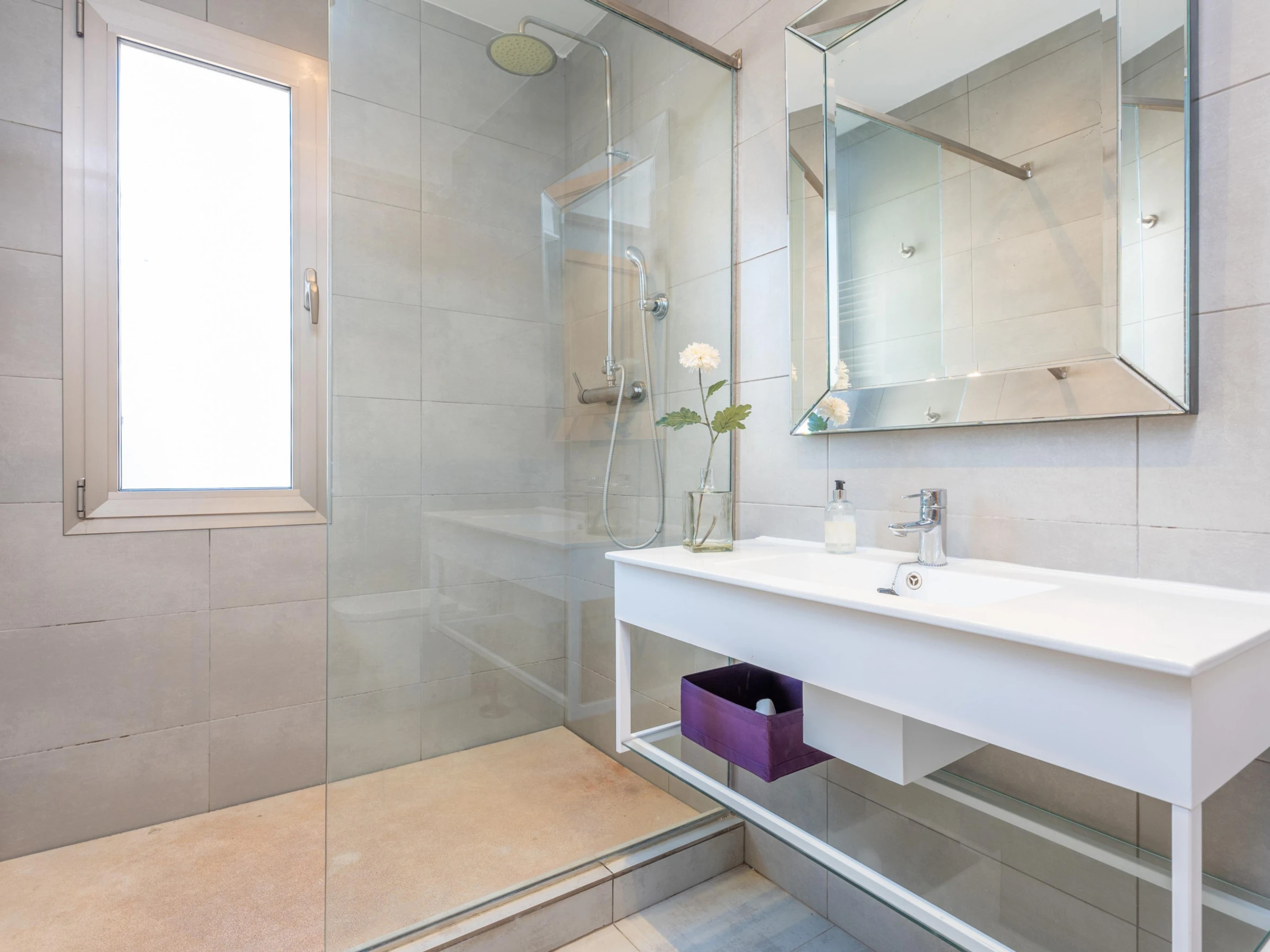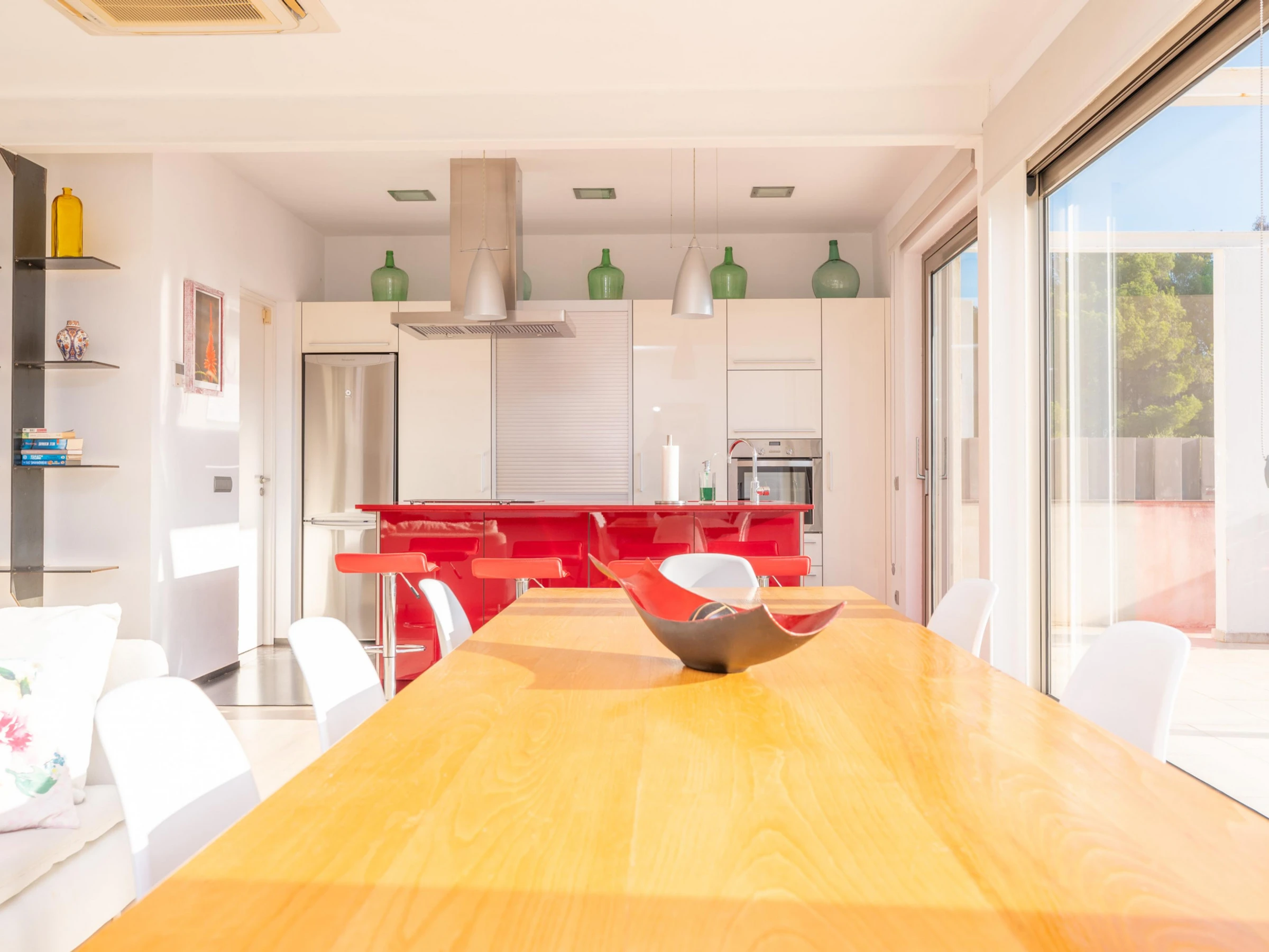 Moving into the modern interior of the house, you will find a large and bright space that combines the living room, dining room and kitchen. The living room, equipped with Smart TV and a sofa for the whole family, is perfect for relaxing after a day of sightseeing. The kitchen, integrated in the dining room, has an induction hob and everything you need to prepare delicious meals. The house has three bedrooms: one with a double bed and air conditioning, and two bedrooms with twin beds, both with air conditioning. The two bathrooms, one of them en suite, are fully equipped and have showers. If you are travelling with a baby, a cot and high chair will be provided. A laundry area with tumble dryer, iron and ironing board completes the amenities of the house.