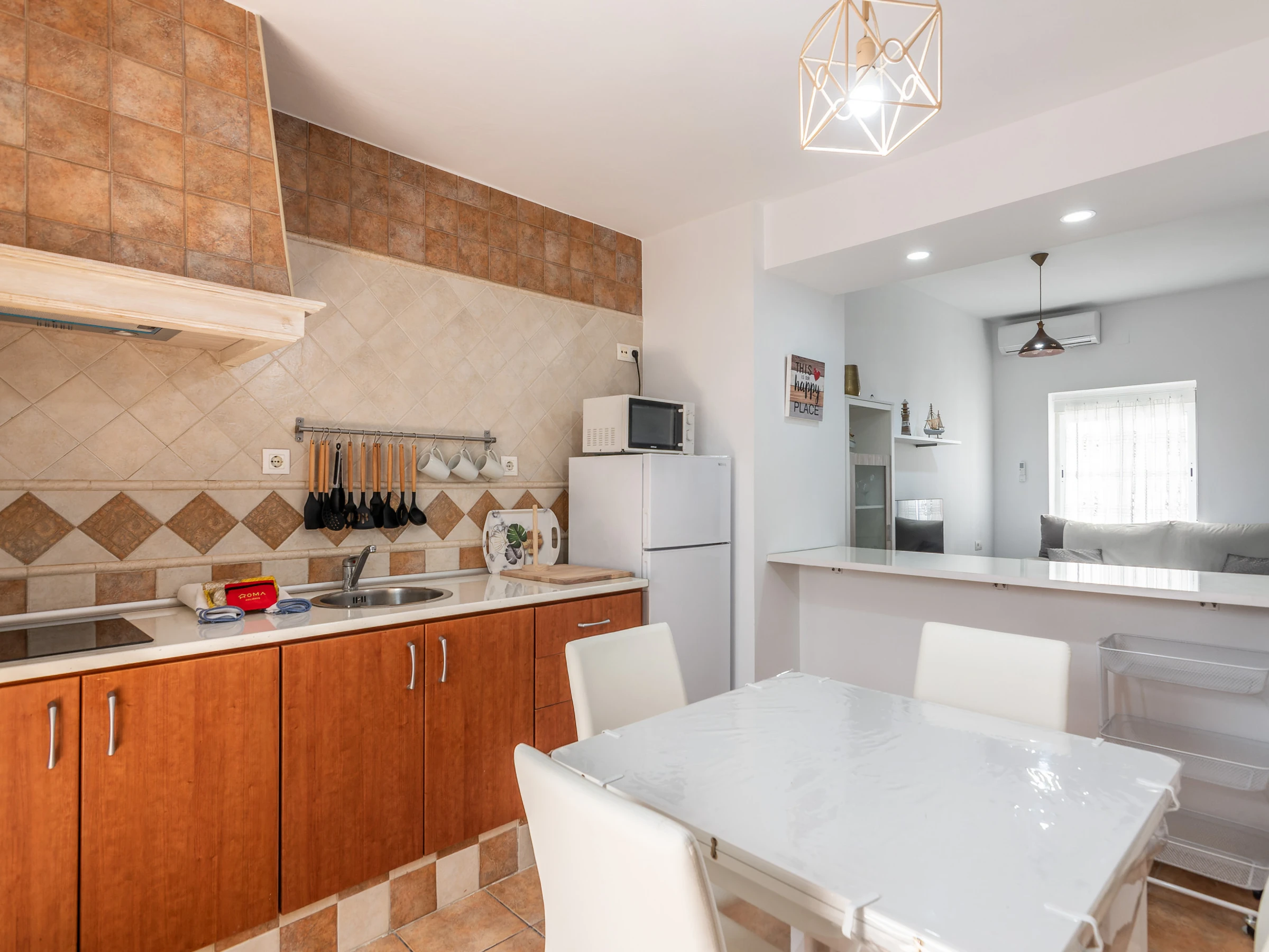 The open plan kitchen, of hotplate of glass ceramics, is equipped with refrigerator, microwave, freezer, dishes/cutlery, kitchen utensils, coffee machine, toaster, kettle and juicer.
