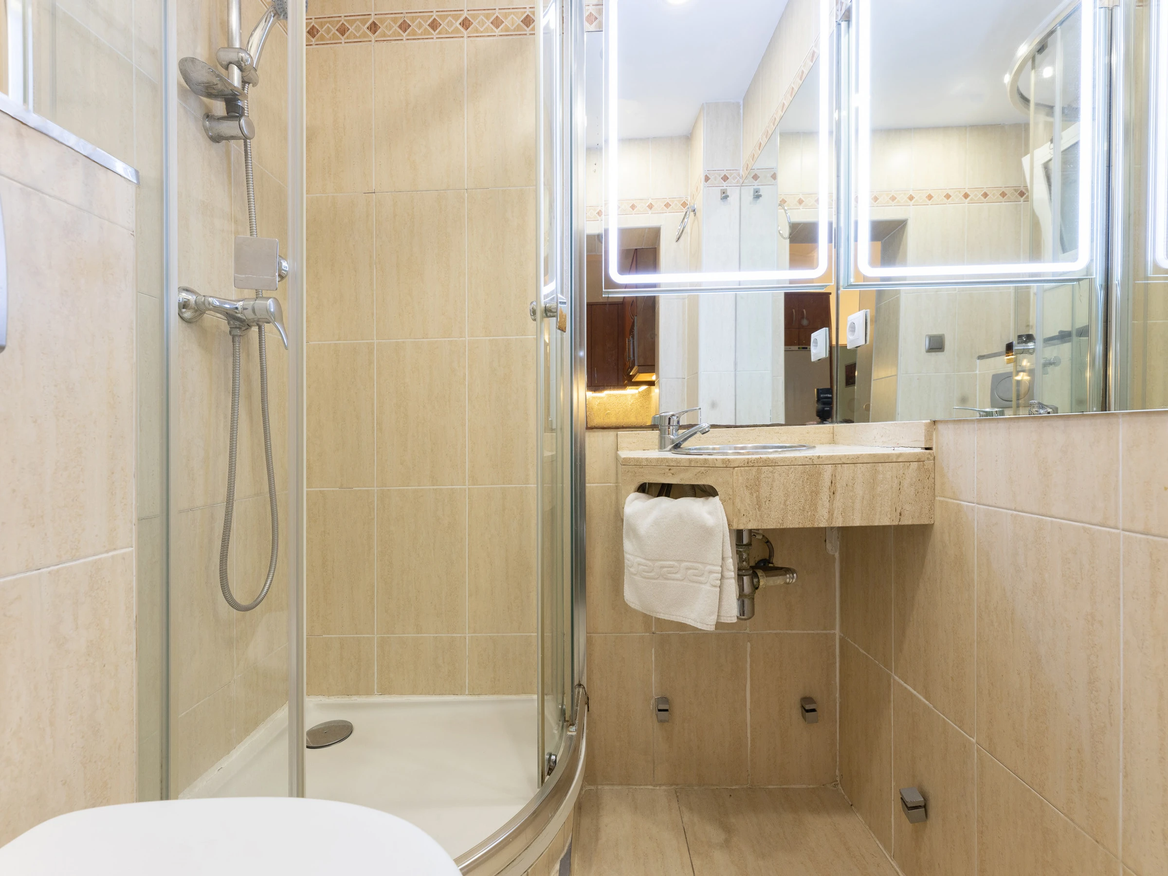 The studio has 1 double sofa bed (in the living room) and 1 single bed (in the kitchen), the apartment's capacity is up to 3 people. There is a kitchen and 1 full bathroom with a shower. The apartment has air conditioning, heating, free WIFI and TV. The kitchen is fully equipped with appliances (fridge/freezer, coffee maker, water boiler, ceramic hob and microwave) and kitchen utensils. Towels, bed sheets, iron and hairdryer are included.