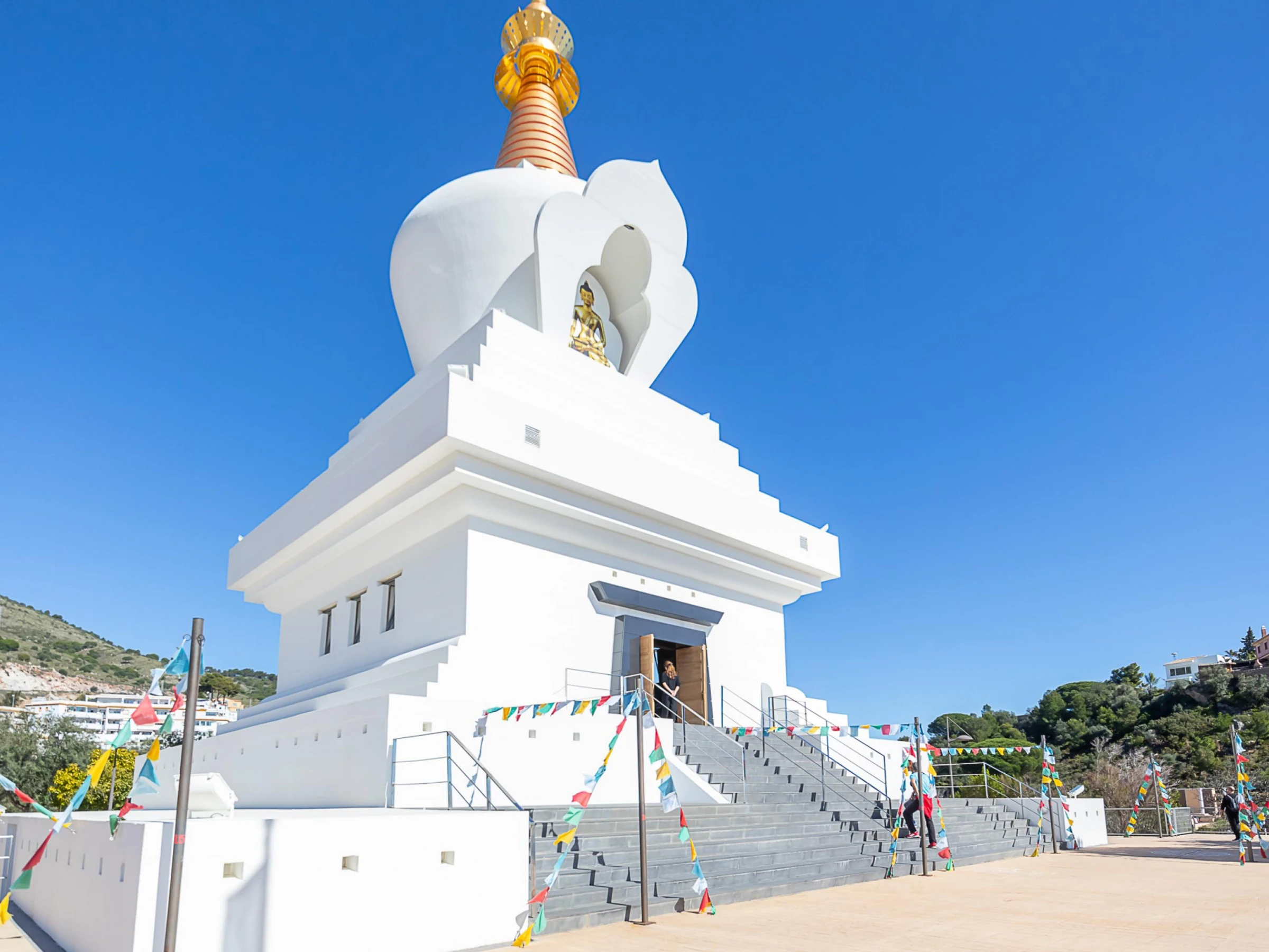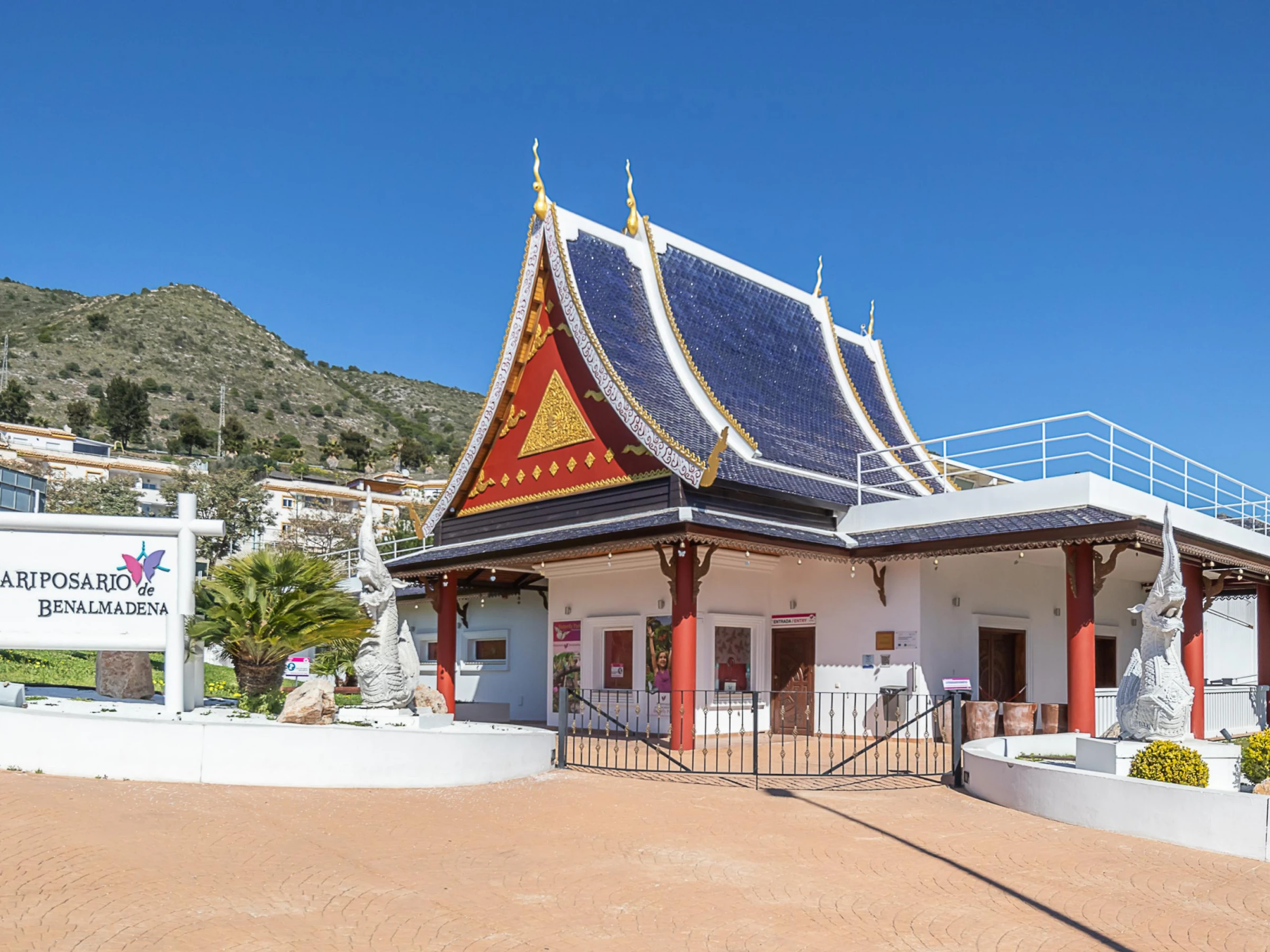 This exclusive villa is strategically located for a fun and memorable holiday experience. It's just a short walk from the nearest shops, restaurants, and supermarket. A golf course is just a 10-minute drive away. The villa is also close to the Benalmádena Buddhist Stupa, a unique attraction in Spain. The nearby Butterfly Park is a favorite with children. Guests can reach the sea in about 10 minutes, where they can enjoy various beach activities such as jet skiing and kitesurfing. An Aqualand water park is also nearby.