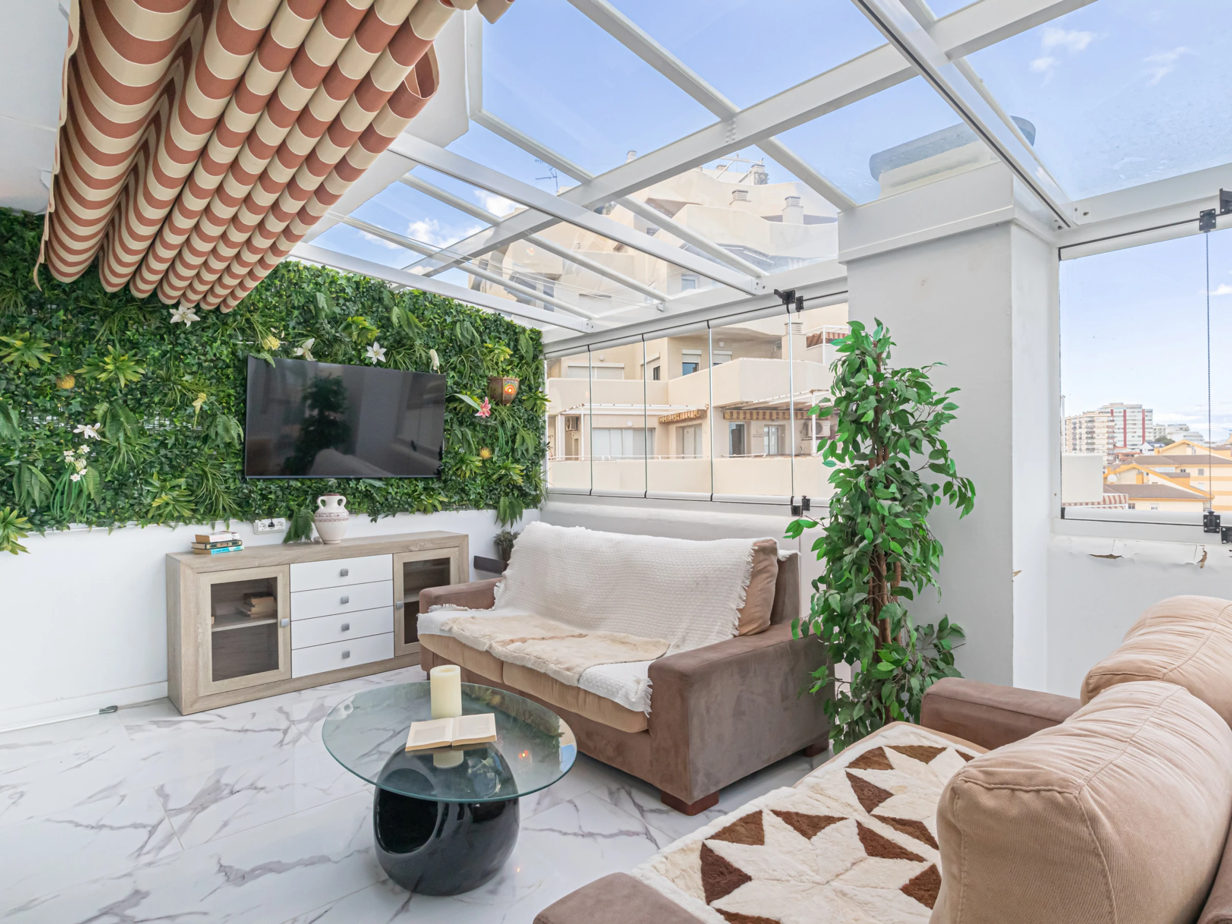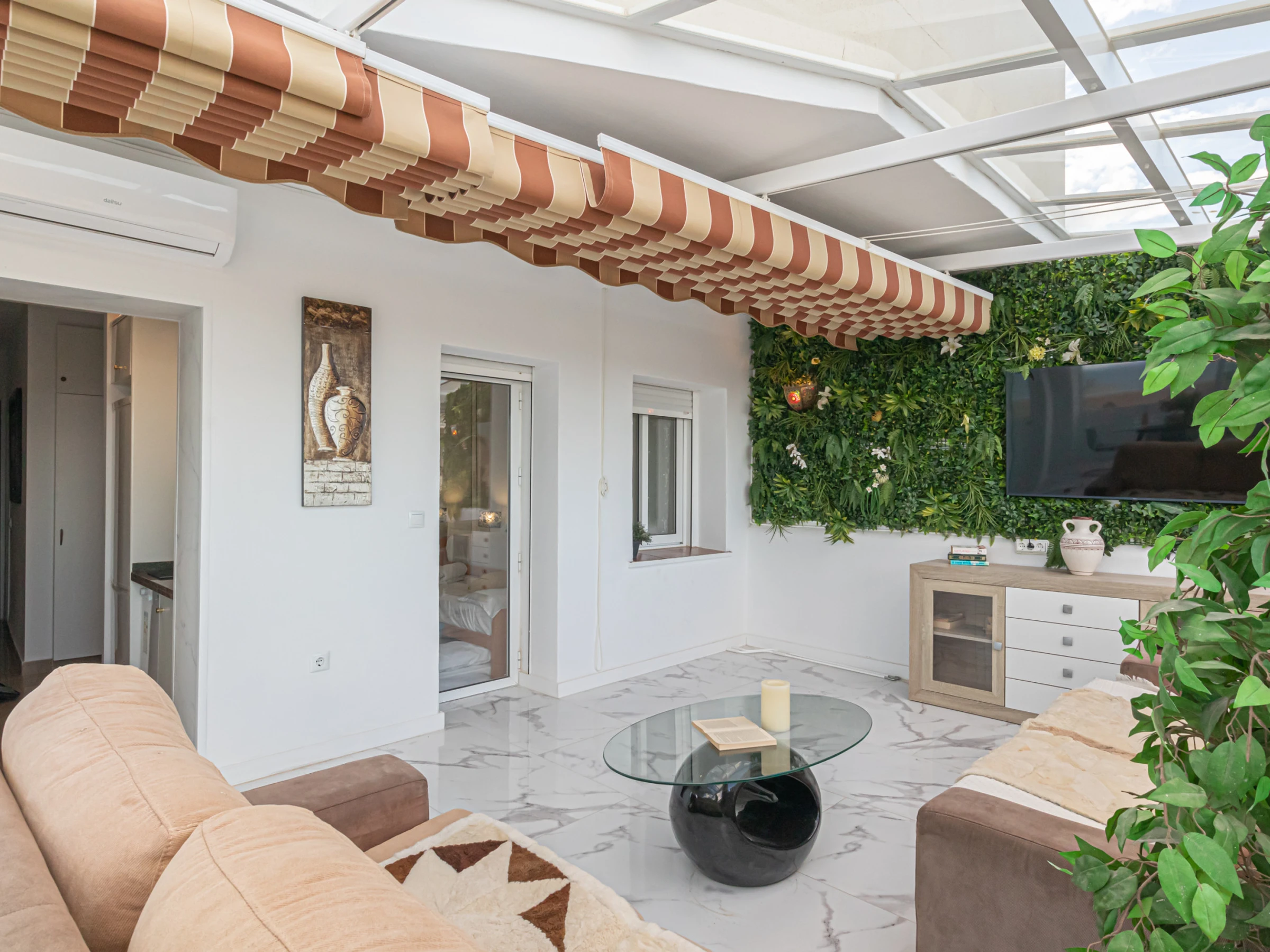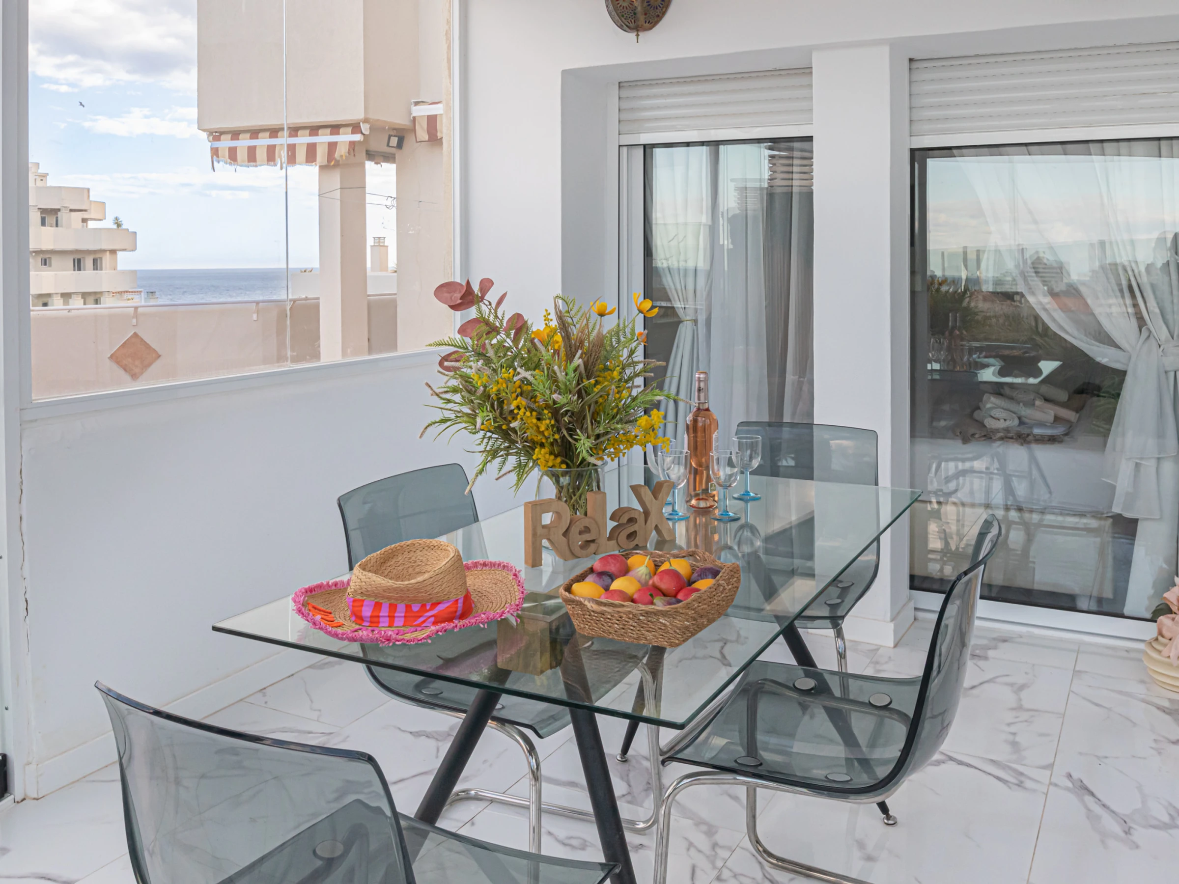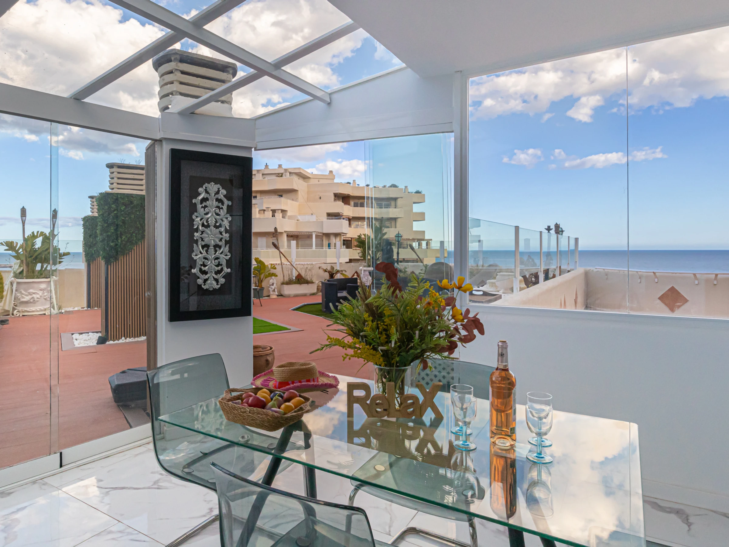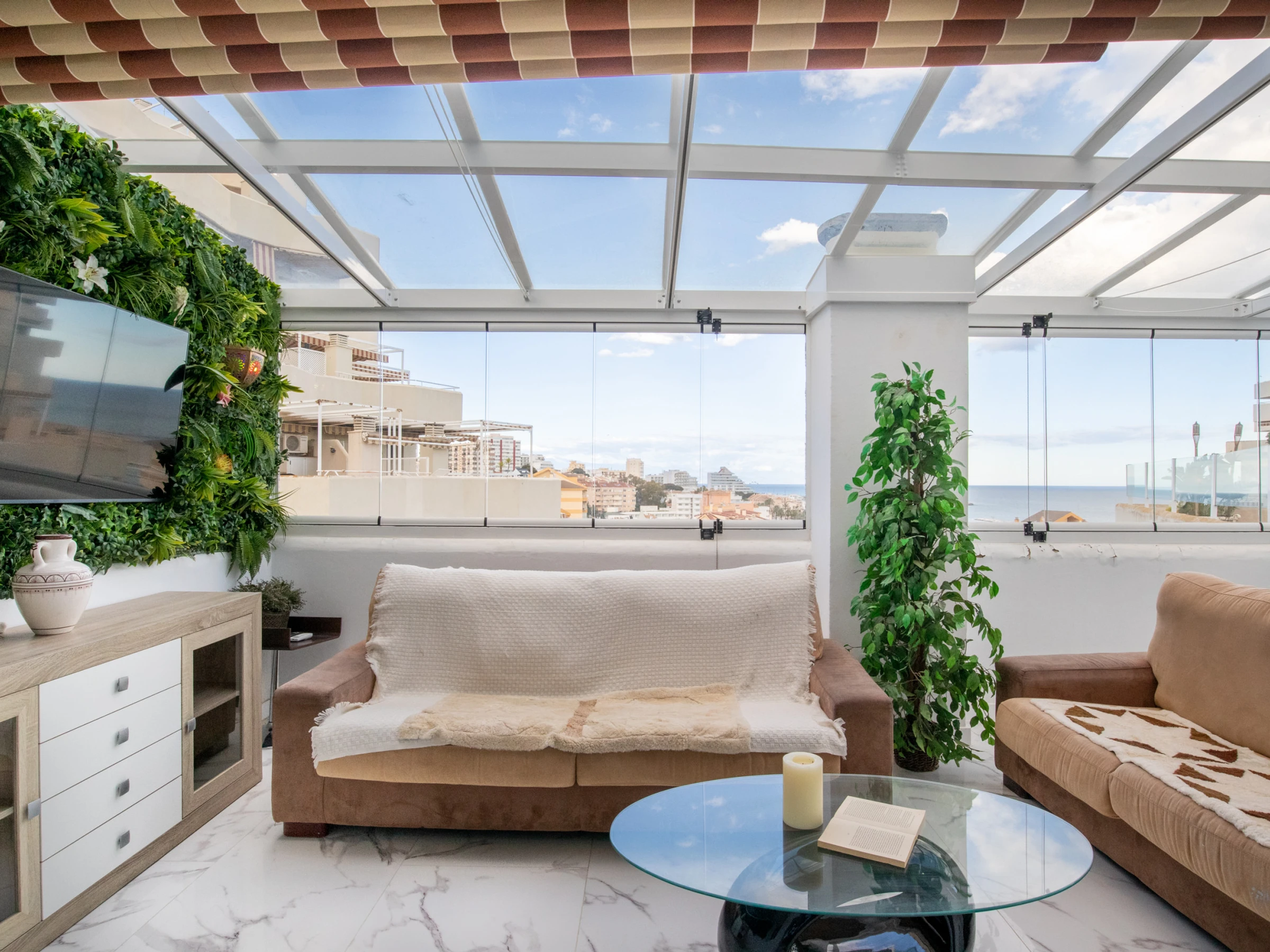 Step into a bright and stylish living area with plush, comfortable seating, a flat-screen TV, and floor-to-ceiling glass walls that fill the room with natural light and frame breathtaking panoramic views. The cosy lounge flows effortlessly into the dining space, where you can savour meals surrounded by lush greenery and beautiful coastal vistas. The well-equipped kitchenette offers a coffee machine, electric kettle, toaster, fridge, and induction hob. Both the bedrooms and the living area open onto a terrace with an outdoor dining space — perfect for enjoying drinks as you watch the sunset.