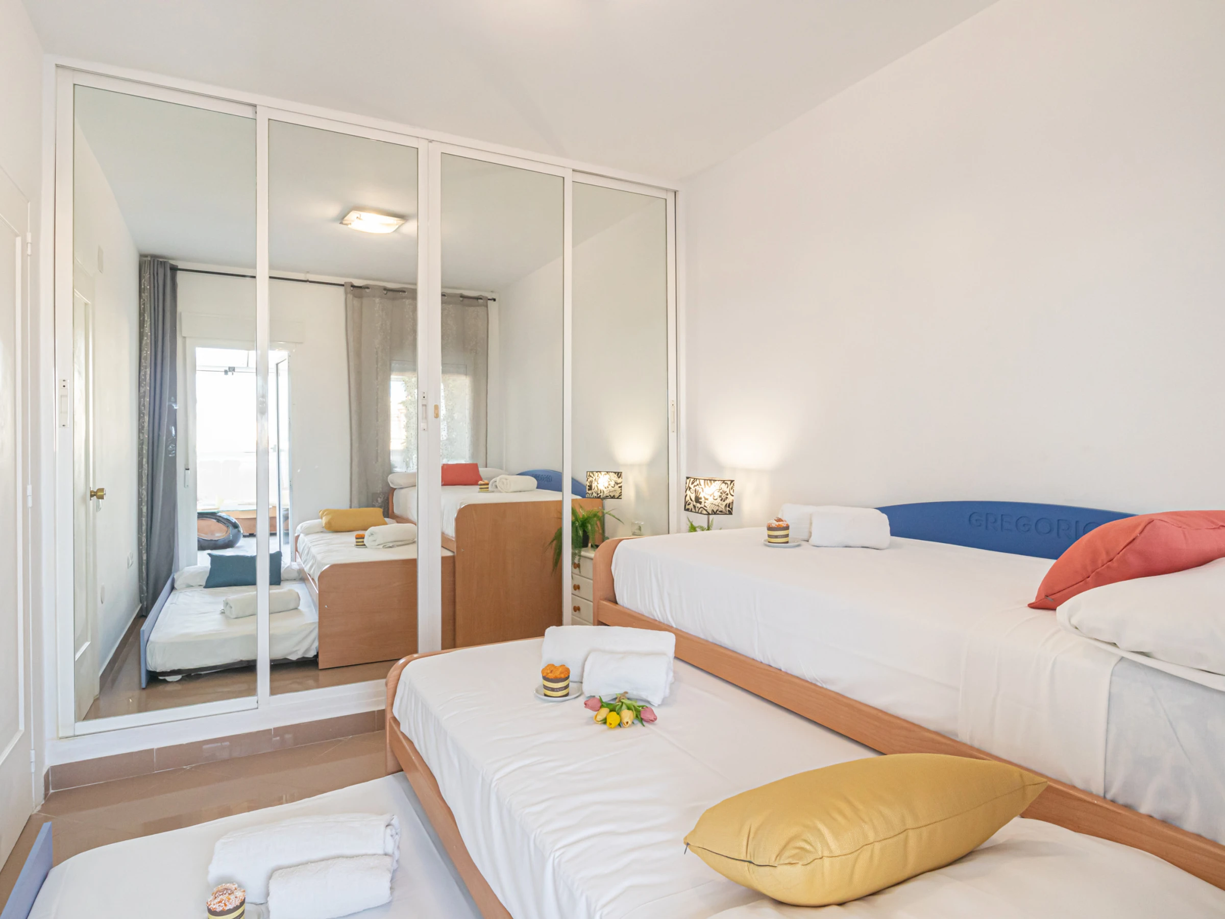 Bedroom 2: This bedroom has three single beds, a wardrobe and terrace access.