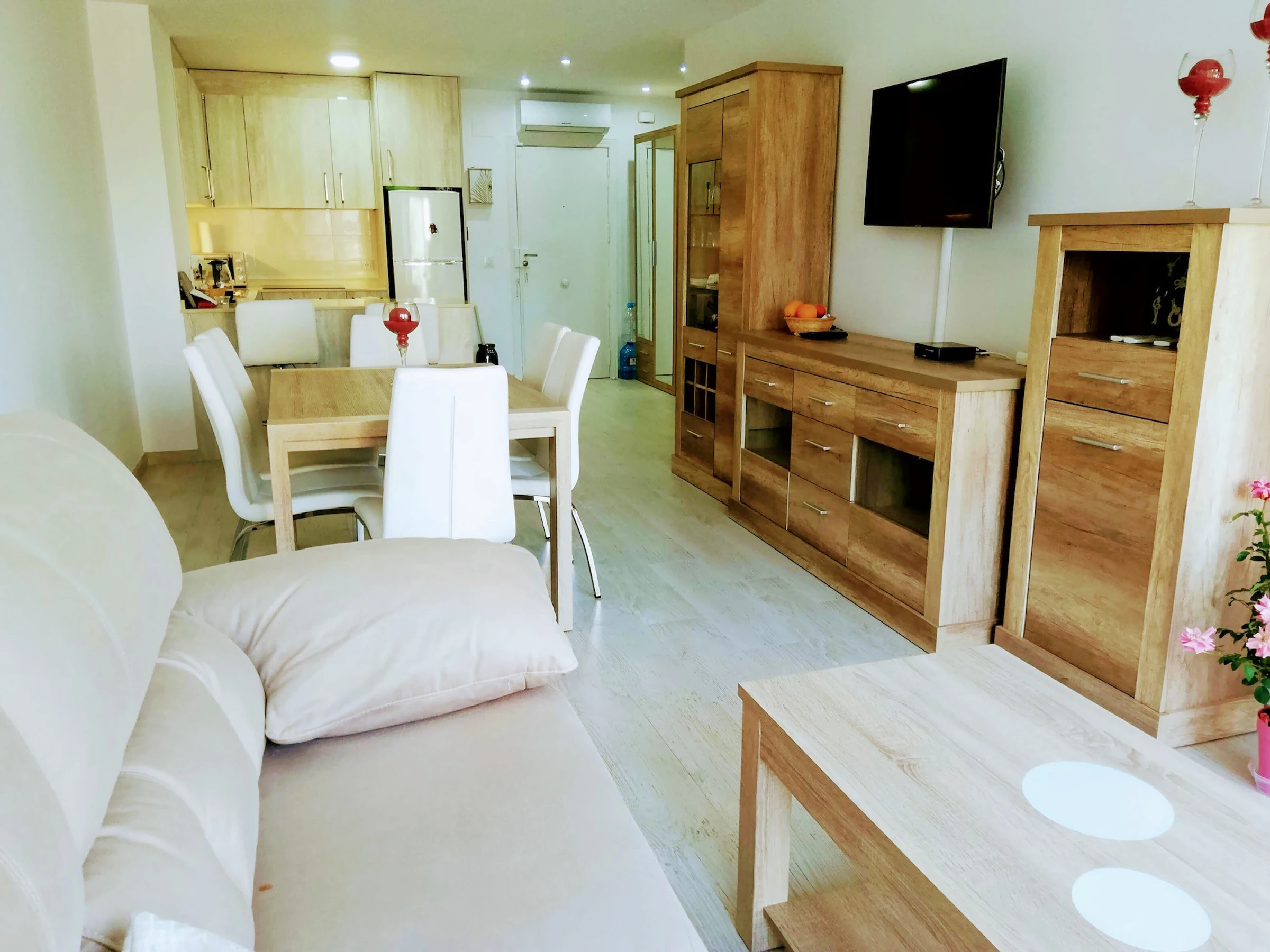 In a large, well-maintained urbanisation with a communal swimming pool, extensive common green areas, tennis court and communal parking. It has 64 m2 built, distributed in 1 double bedroom with built-in wardrobe, living-dining room, glazed terrace, fully equipped kitchen and 1 complete bathroom with shower. Originally the terrace was open and has been glazed to give more space to the living-dining room. The bedroom has direct access to the glazed terrace. It has air conditioning for cold and heat. It would be fully furnished, ready to move in.