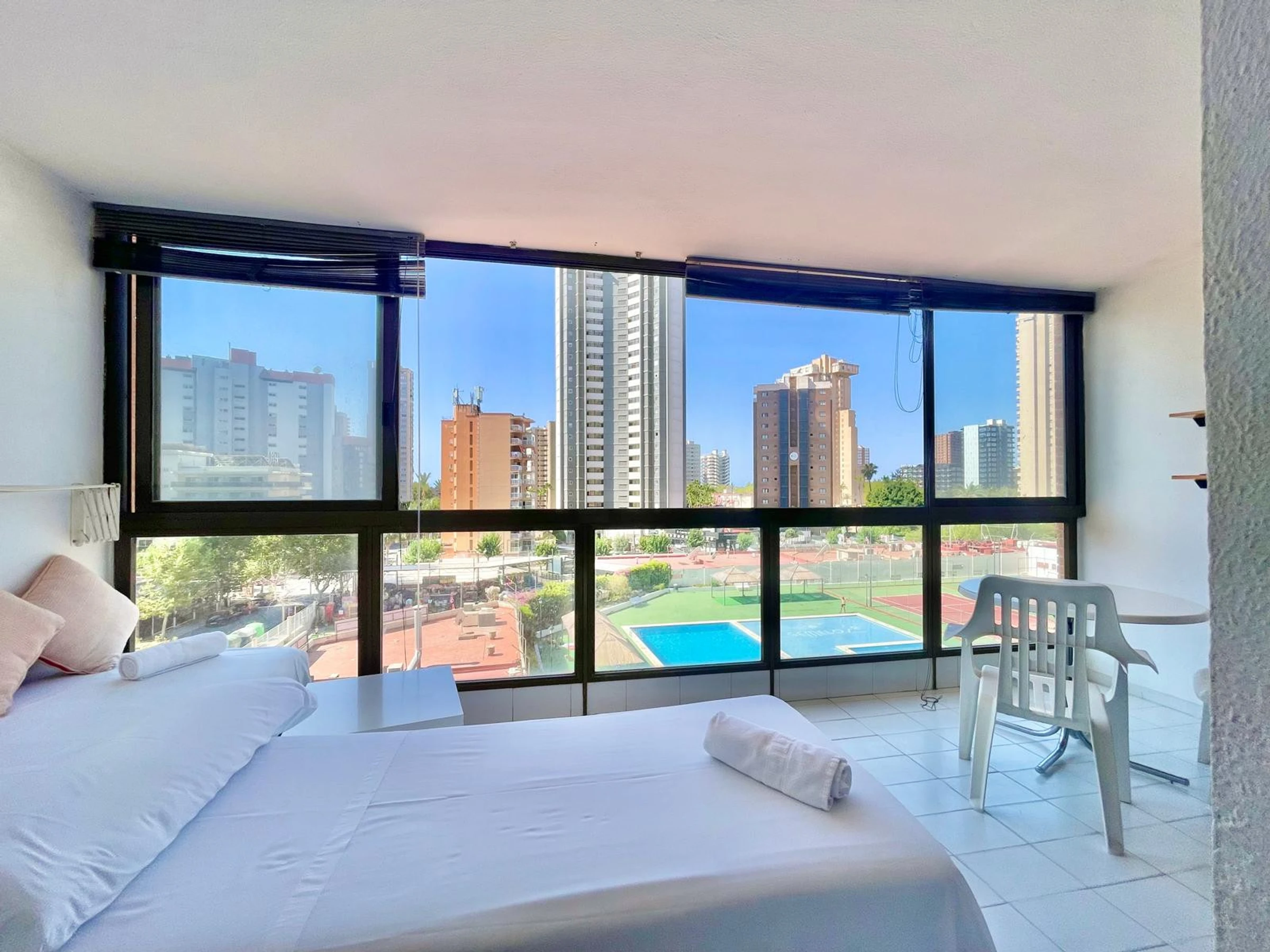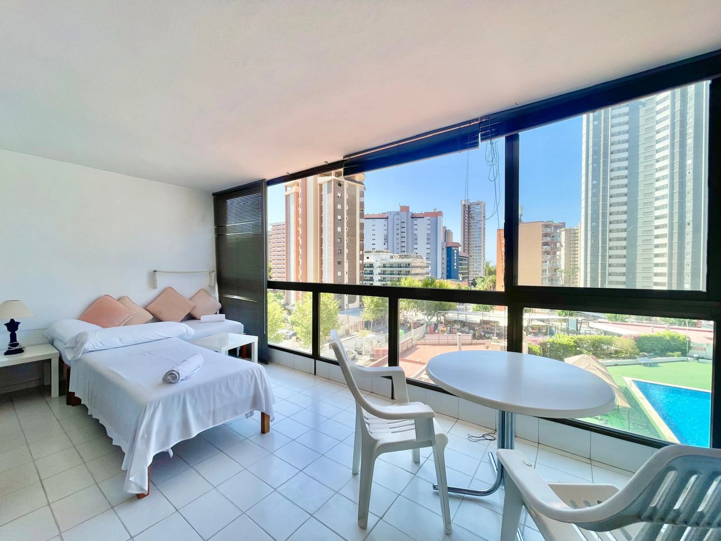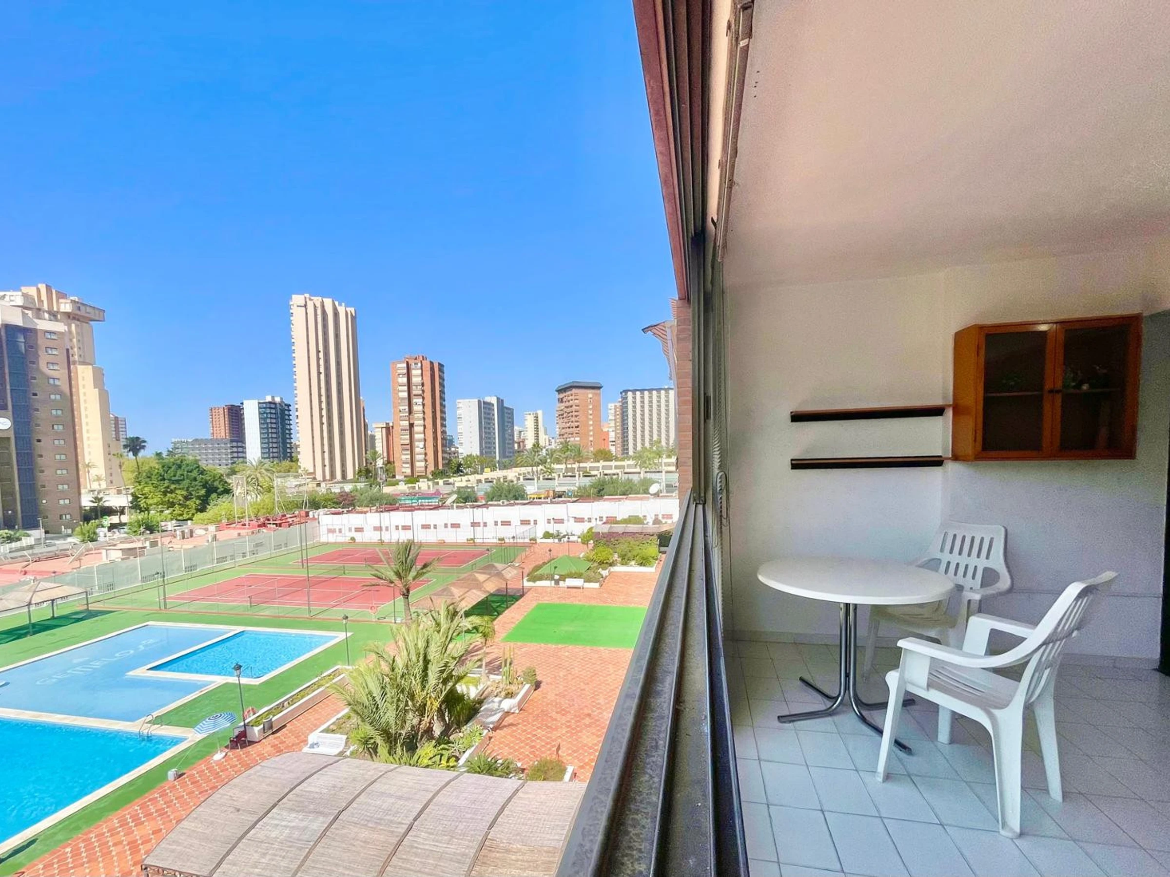 The apartment in Benidorm has 1 bedroom(s) and capacity for 4 people. Accommodation of 50 m² comfortable and exterior, with views of the swimming pool. It is located 50 m from the restaurant, 300 m from the supermarket, 500 m from the sandy beach "Playa de Levante", 1 km from the city "Casco Antiguo Benidorm", 1 km from the bus station "Benidorm", 2 km from the water park "Aqualandia", 5 km from the theme park "Terra Mítica", 65 km from the airport "Alicante", 65 km from the train station "Alicante" and is located in an ideal area for families and within a residential complex. It has a lift, 8 m² terrace, washing machine, iron, communal swimming pool, covered parking in the same building, Television. The independent kitchen, with ceramic hob, is equipped with fridge, microwave, crockery/cutlery, utensils/kitchen, coffee maker, toaster and kettle.