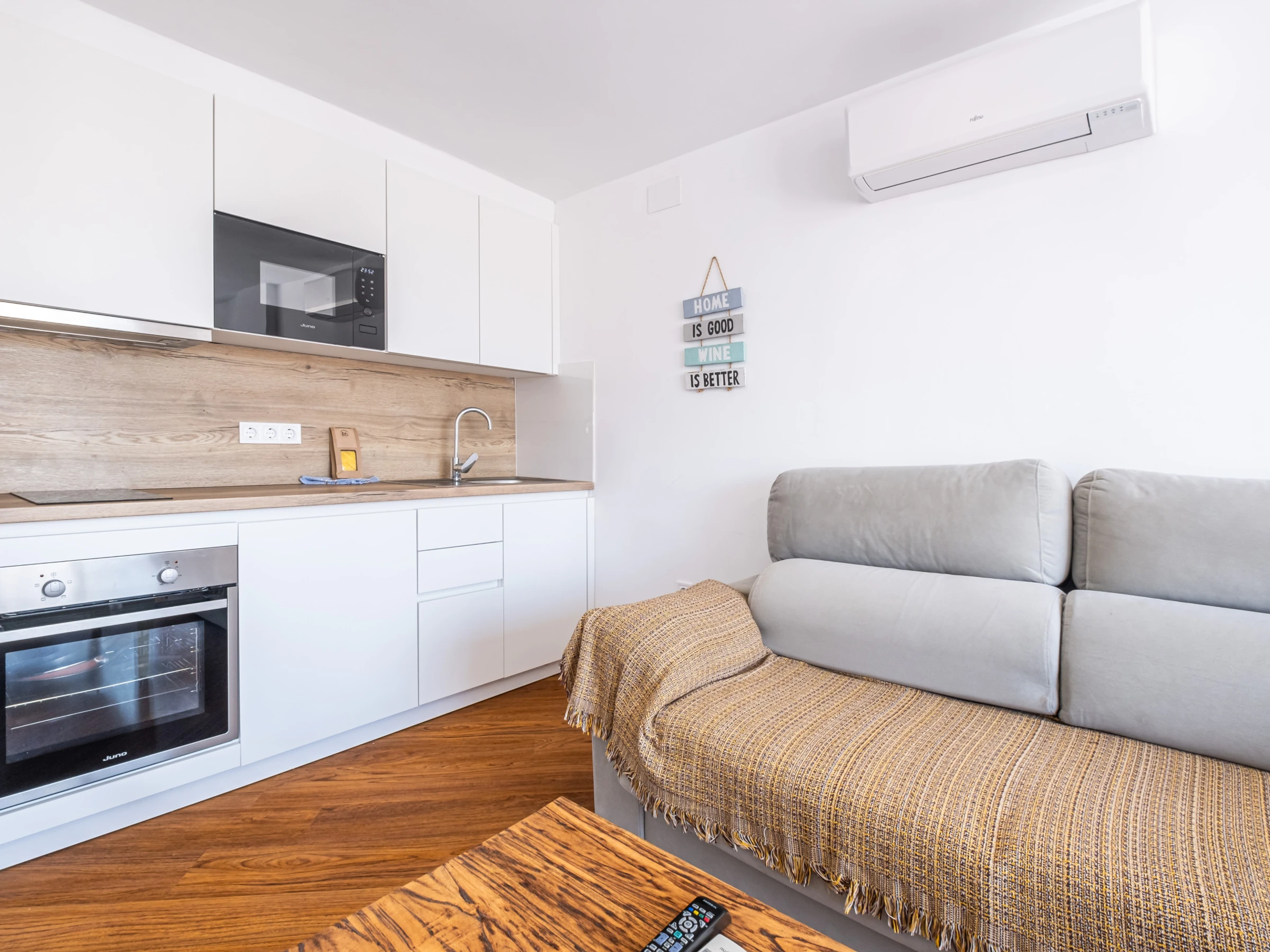 The apartment has a bedroom with a double bed and a double sofa bed in the living-dining room, bathroom with shower, air conditioning and heat pump heating to ensure your comfort in any season of the year. The kitchen is fully equipped with appliances such as fridge, washing machine, oven, microwave, coffee maker and all the necessary utensils to prepare your meals.