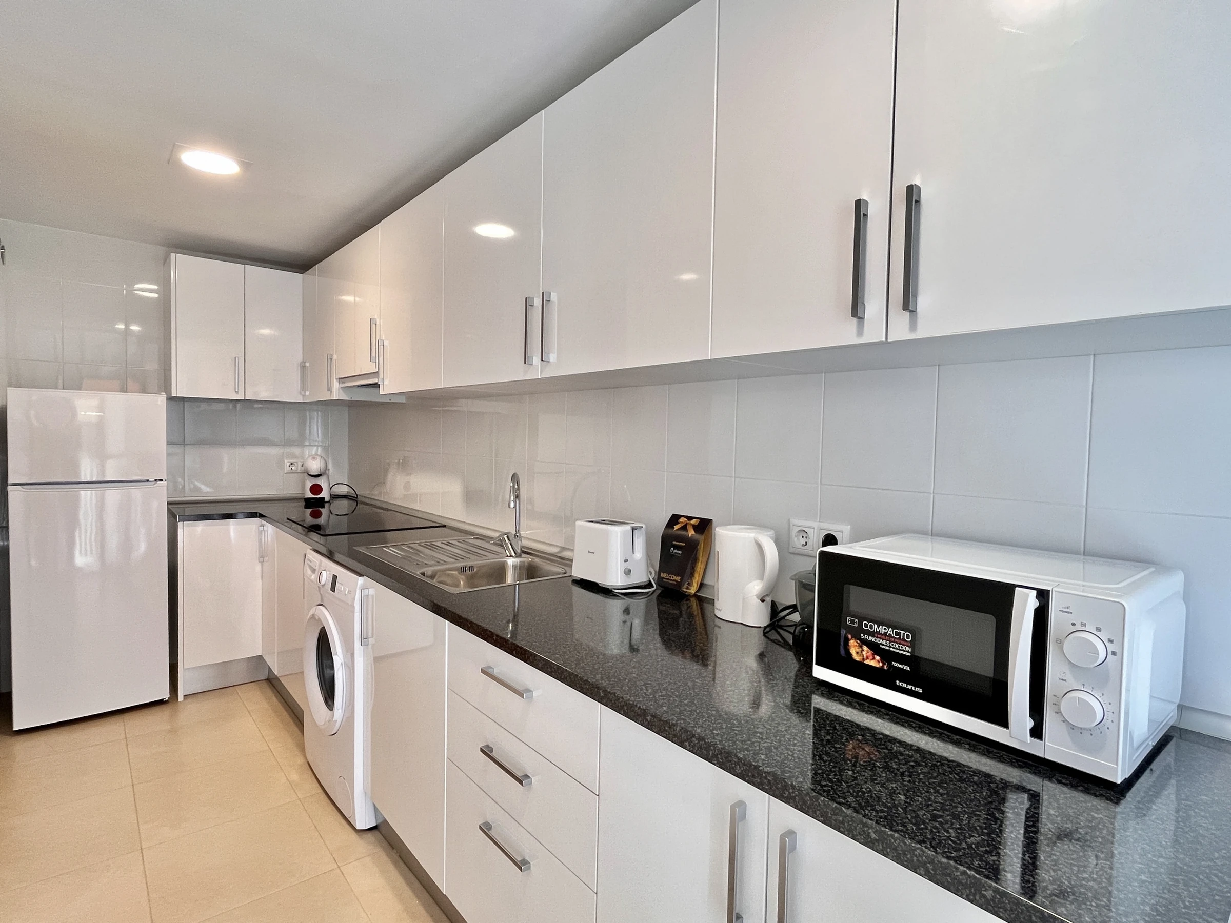The kitchen is equipped with an induction hob, fridge, microwave, freezer, coffee maker, toaster, kettle and juicer. You will also find a washing machine, iron and ironing board for your convenience.