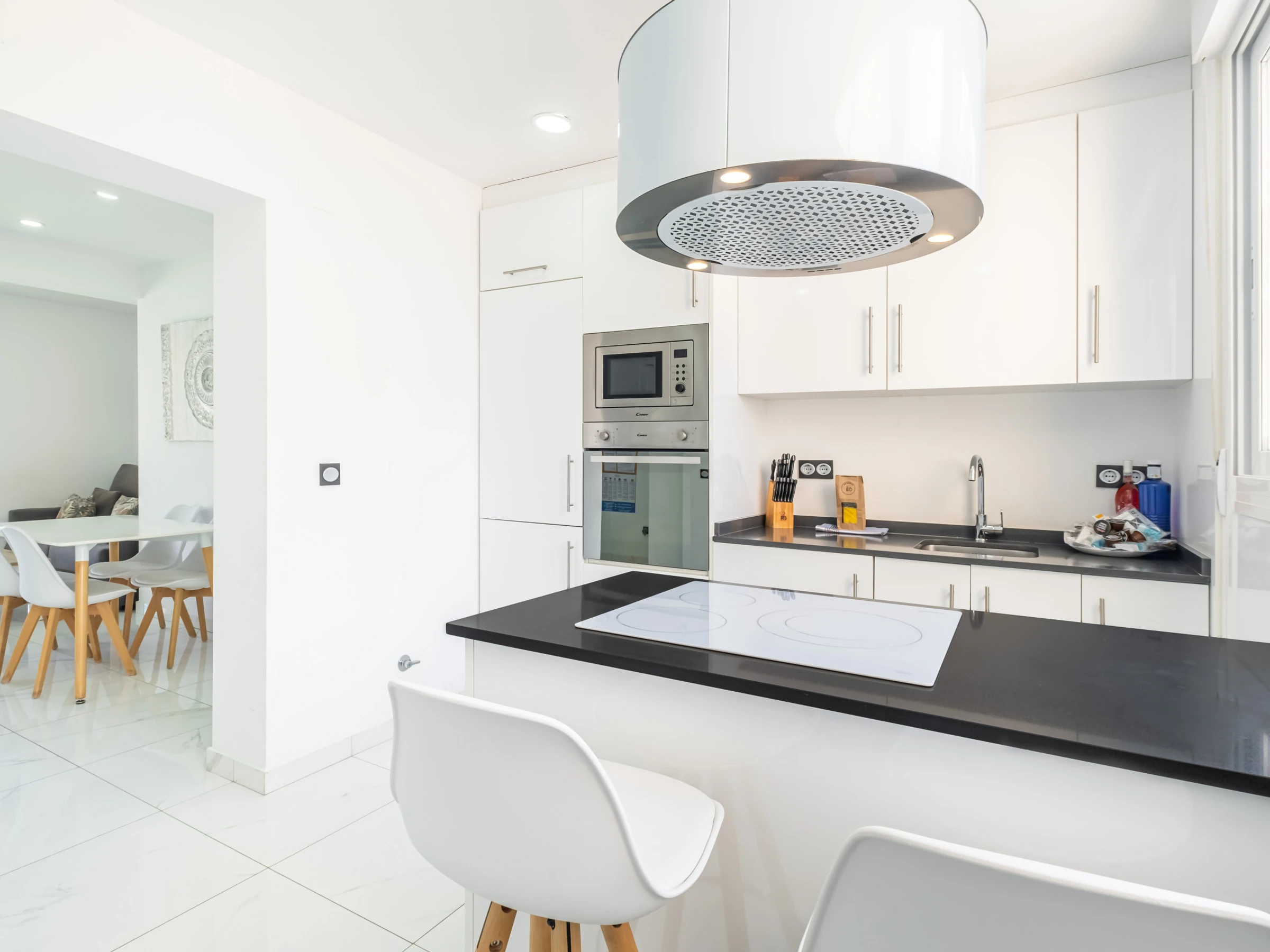 The open-plan kitchen with induction island is equipped with a refrigerator, washing machine, microwave, oven, freezer, dishes/cutlery, kitchen utensils, Dolce Gusto coffee maker, toaster, kettle and juicer.