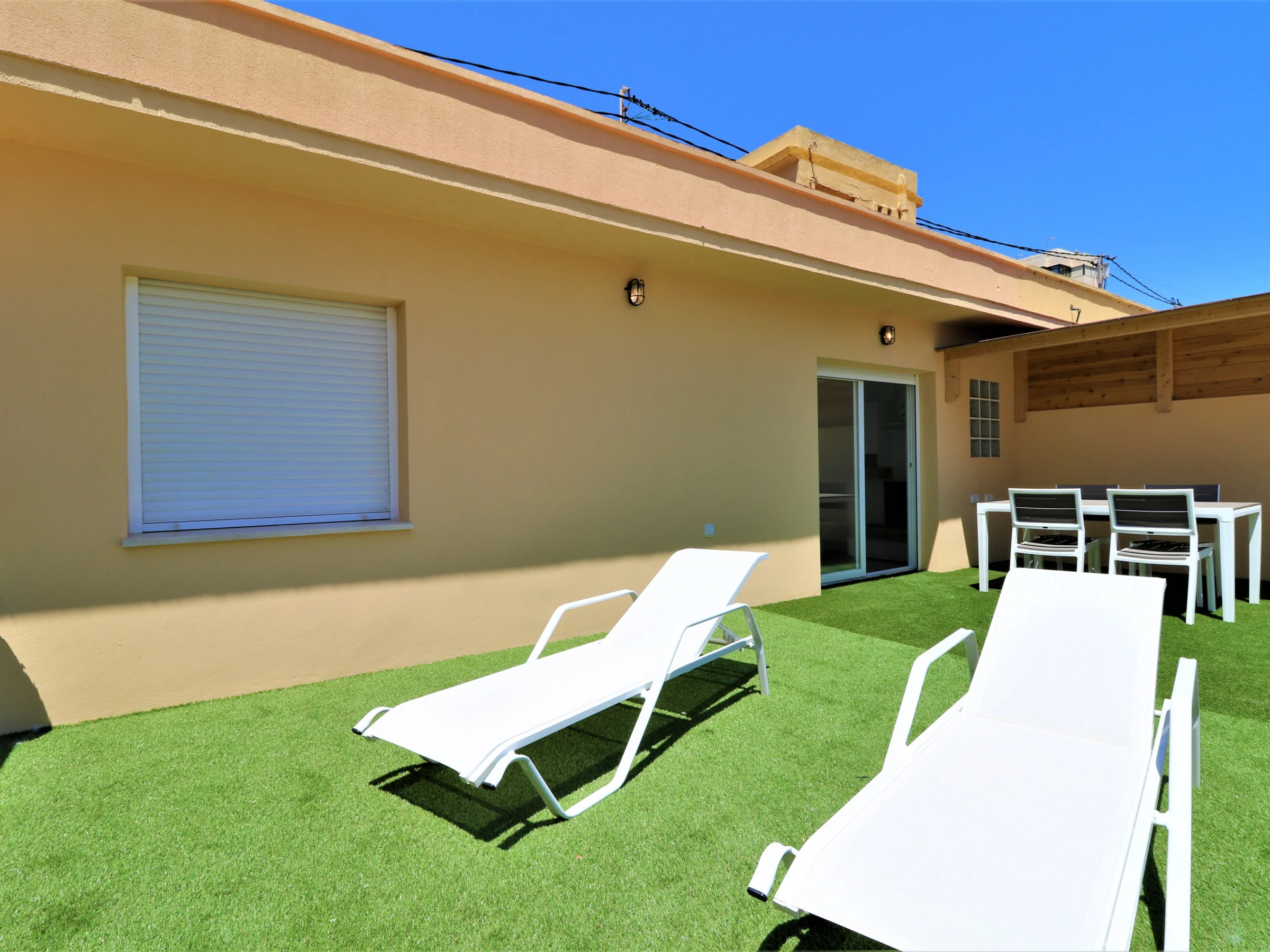 Modern 100 m² accommodation, with a huge 25 m2 private terrace with dining area and solarium, and views of the sea and the city.