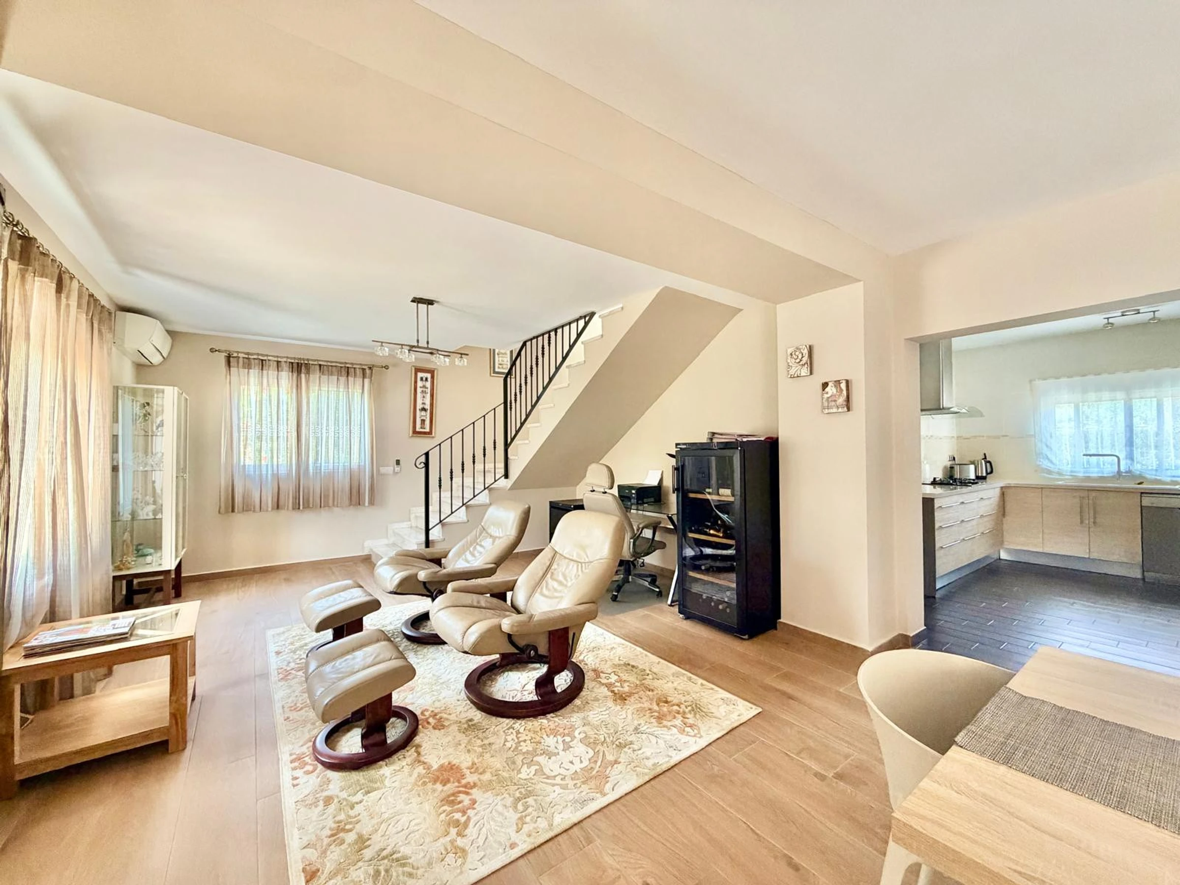 The house, with 300 m2 of surface area, is distributed over two floors. The ground floor has a beautiful entrance hall with a courtesy toilet, a spacious bedroom with a double bed, built-in wardrobes and plasma TV. The entrance hall leads to a very spacious living-dining room with comfortable leather sofas and armchairs, plasma TV, fireplace and a dining table with leather chairs. The living room has direct access to the outdoor area and a modern fully equipped kitchen.