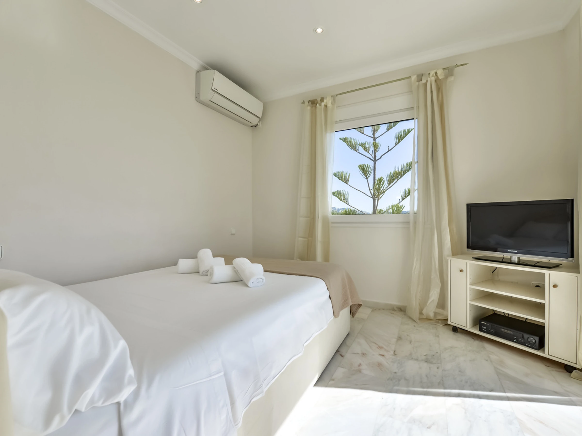 With 300 m² of living space, the villa is divided into two floors. On the first floor there is a bright living room with beautiful sea views, a bedroom with queen size bed (two beds together with a total of 160 cm) with access to a beautiful terrace overlooking the sea and en suite bathroom with shower, a second bedroom with double bed (140 cm), en suite bathroom with shower and access to a terrace overlooking the sea.