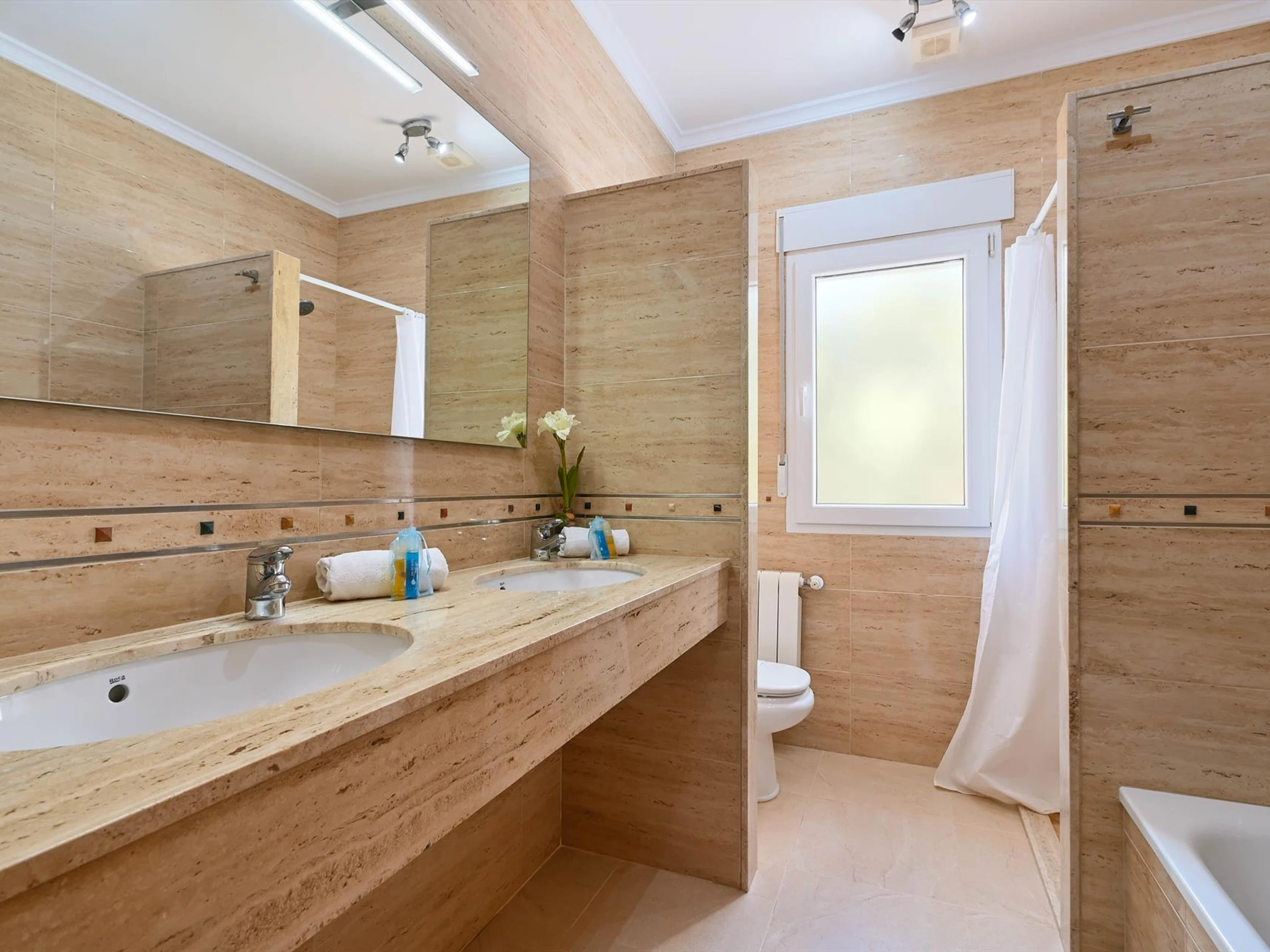 * bathroom with double washbasin, bath, shower and toiletExterior of this