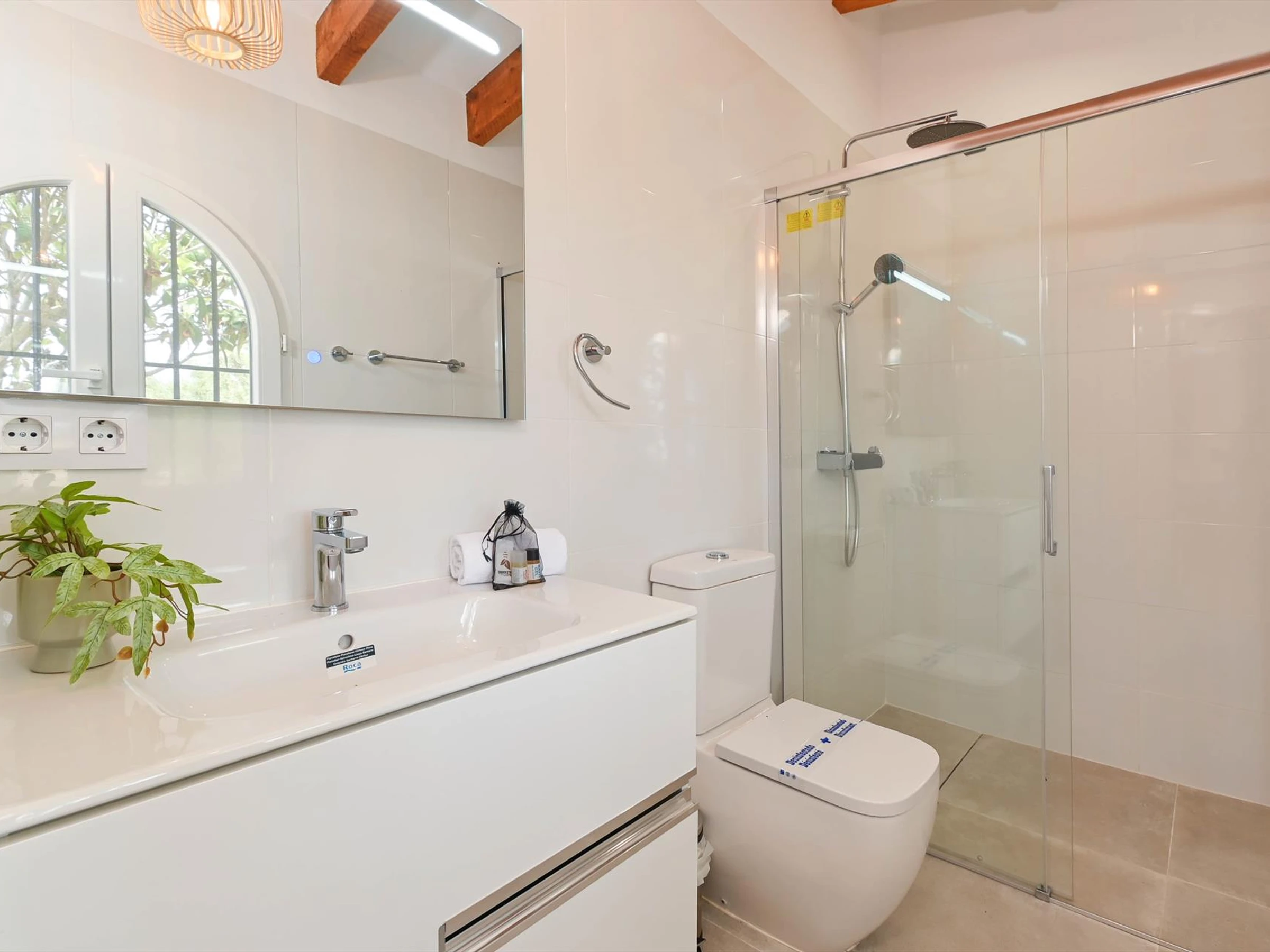 * bathroom with single washbasin, shower and toiletExterior of the villa