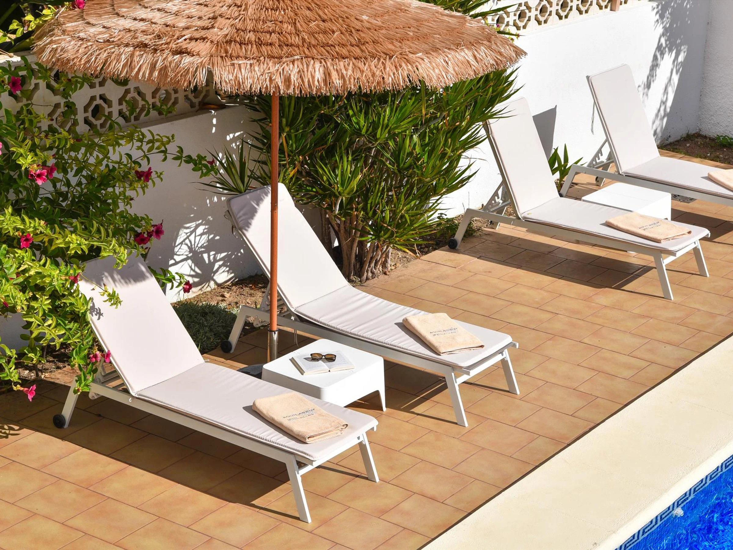 * garden with trees and garden furniture with sunbeds