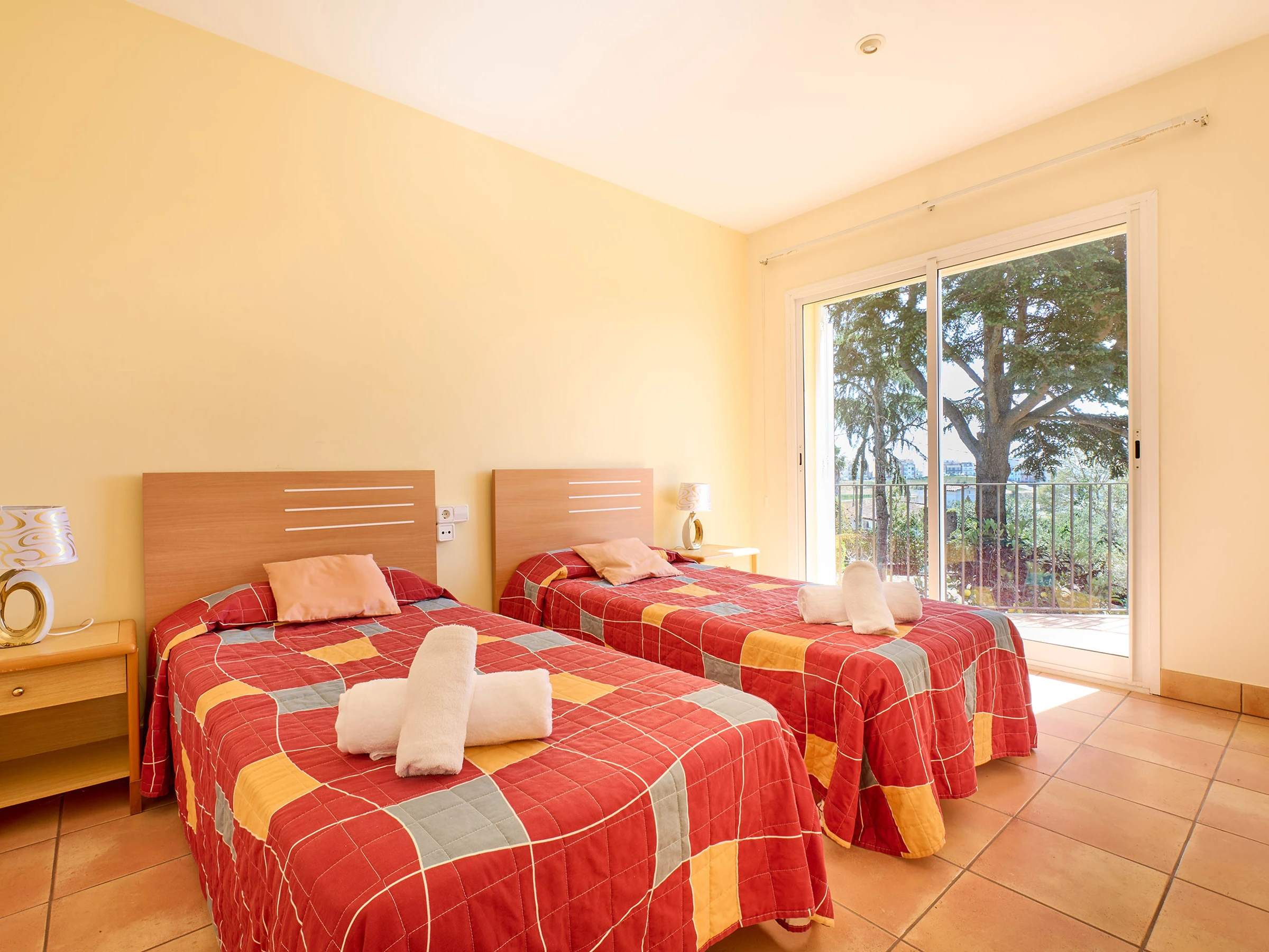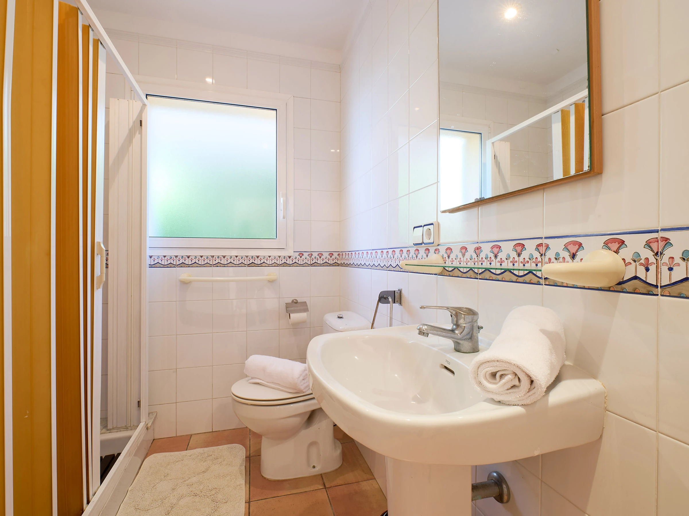 On the lower floor is where we find the spacious living room (TV) with direct access to the outdoor area. A fully equipped kitchen (dishwasher, fridge, oven, microwave) and two double bedrooms: one with a double bed (suite with bathtub) and the other with 2 single beds. A bathroom with shower.