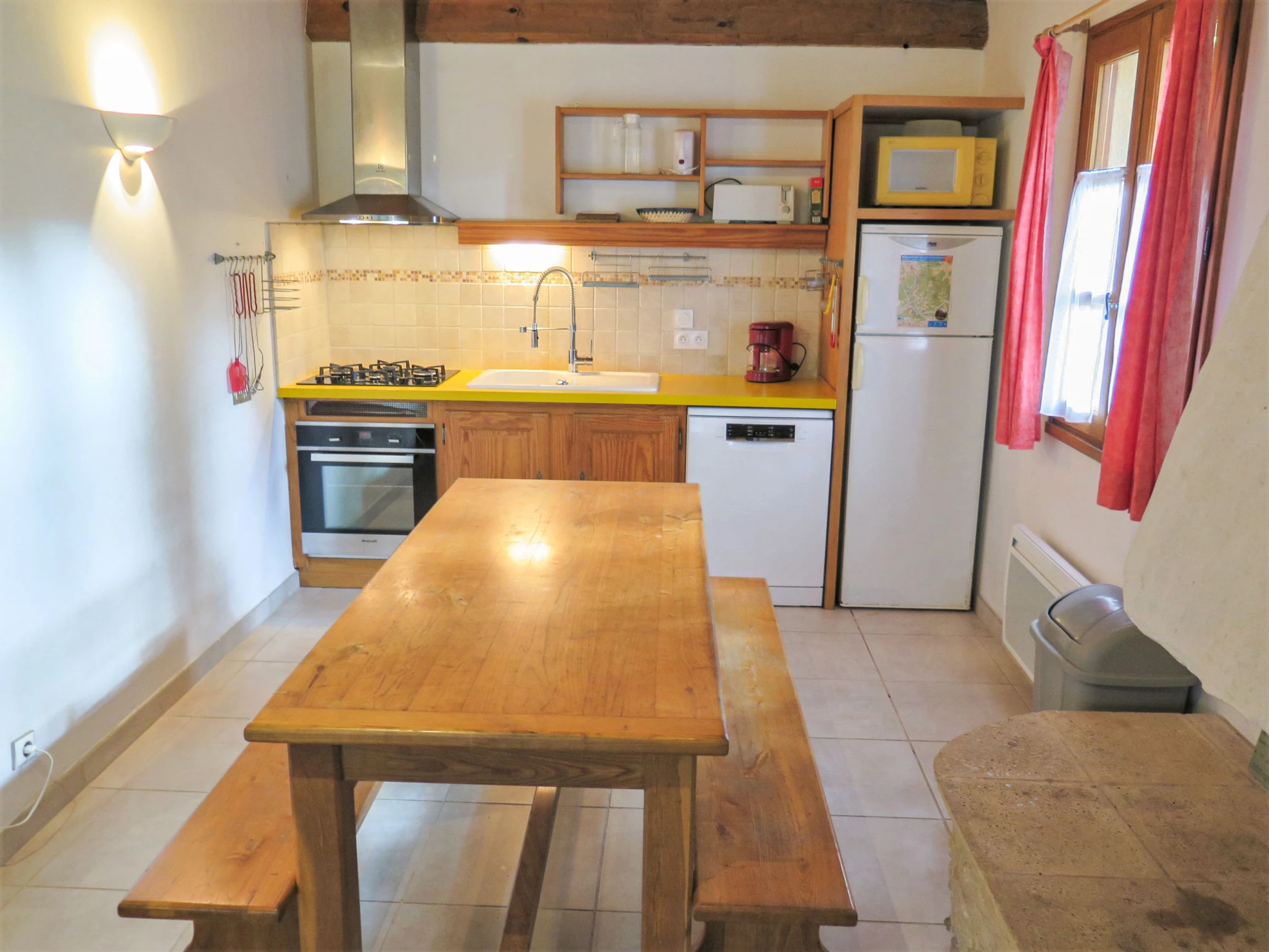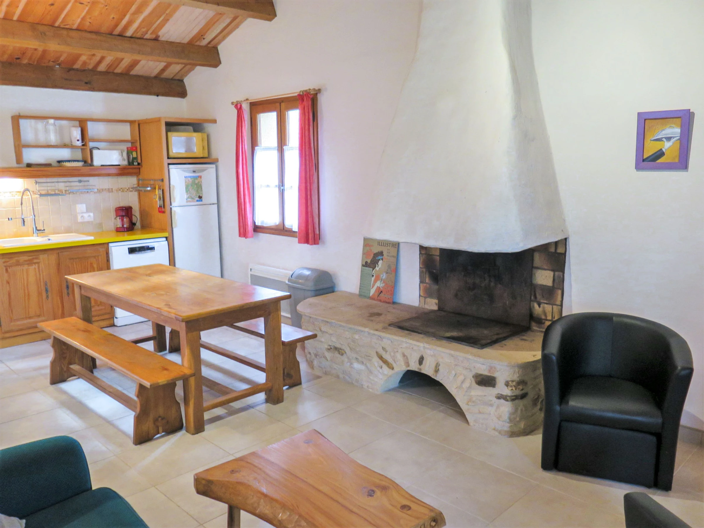 "Le Sorbier", 3-room house 70 m2. Object suitable for 2 adults + 2 children. Practical furnishings: living/dining room with open-hearth fireplace, dining table and TV (flat screen). Exit to the terrace. 1 room with 1 french bed (140 cm, length 190 cm). 1 room with 2 beds (90 cm, length 190 cm). Open kitchen (oven, dishwasher, 4 gas rings, toaster, kettle, microwave, freezer, electric coffee machine). Bathroom, sep. WC. Electric heating. Terrace. Terrace furniture, barbecue, deck chairs (2). Facilities: washing machine, baby cot, logs (extra). Internet (WiFi, free). Please note: non-smoking house. 1 small pet/ dog allowed. Smoke alarm. Offer by a commercial proprietor according to Art. 155, IV, CGI
