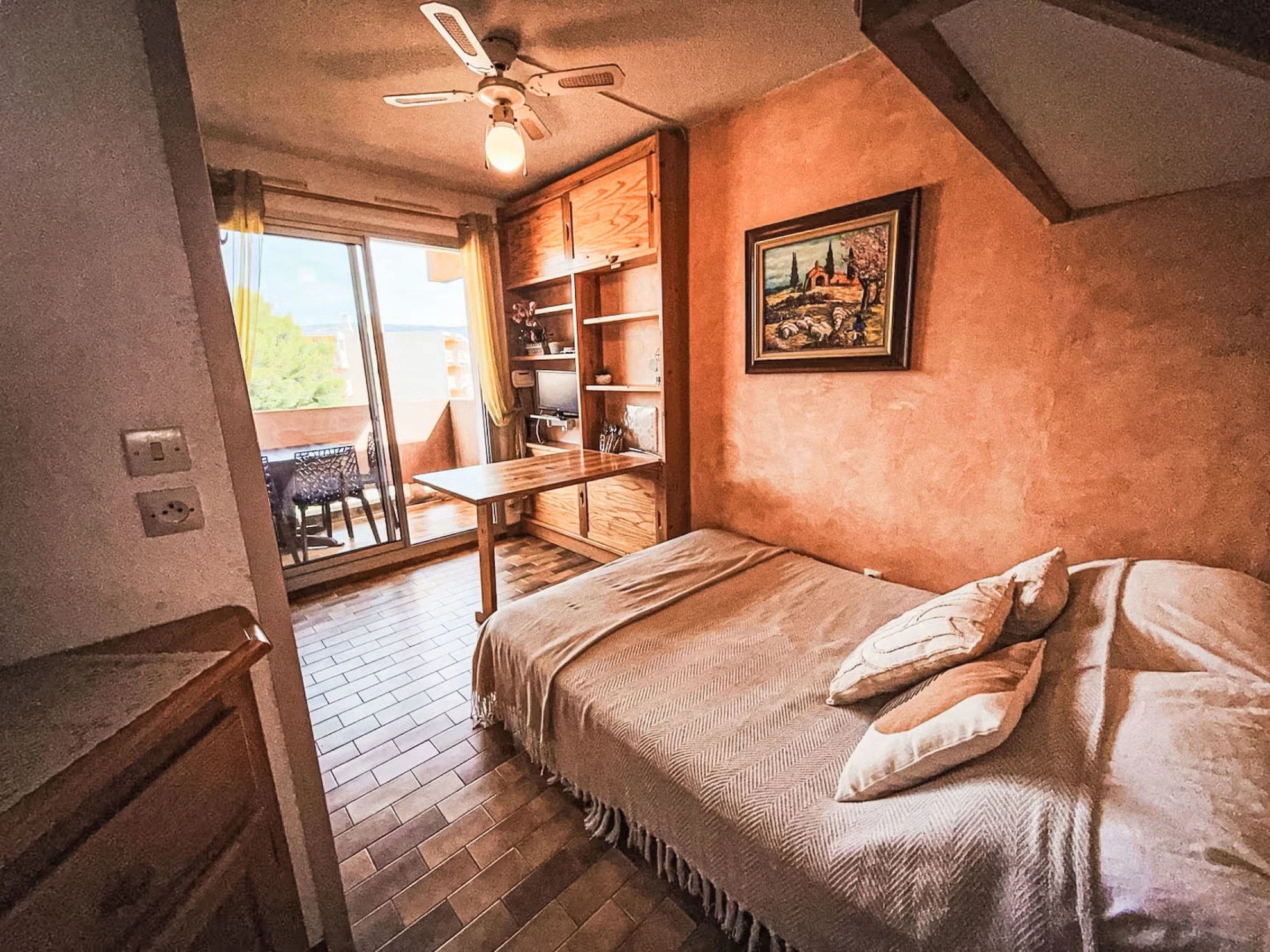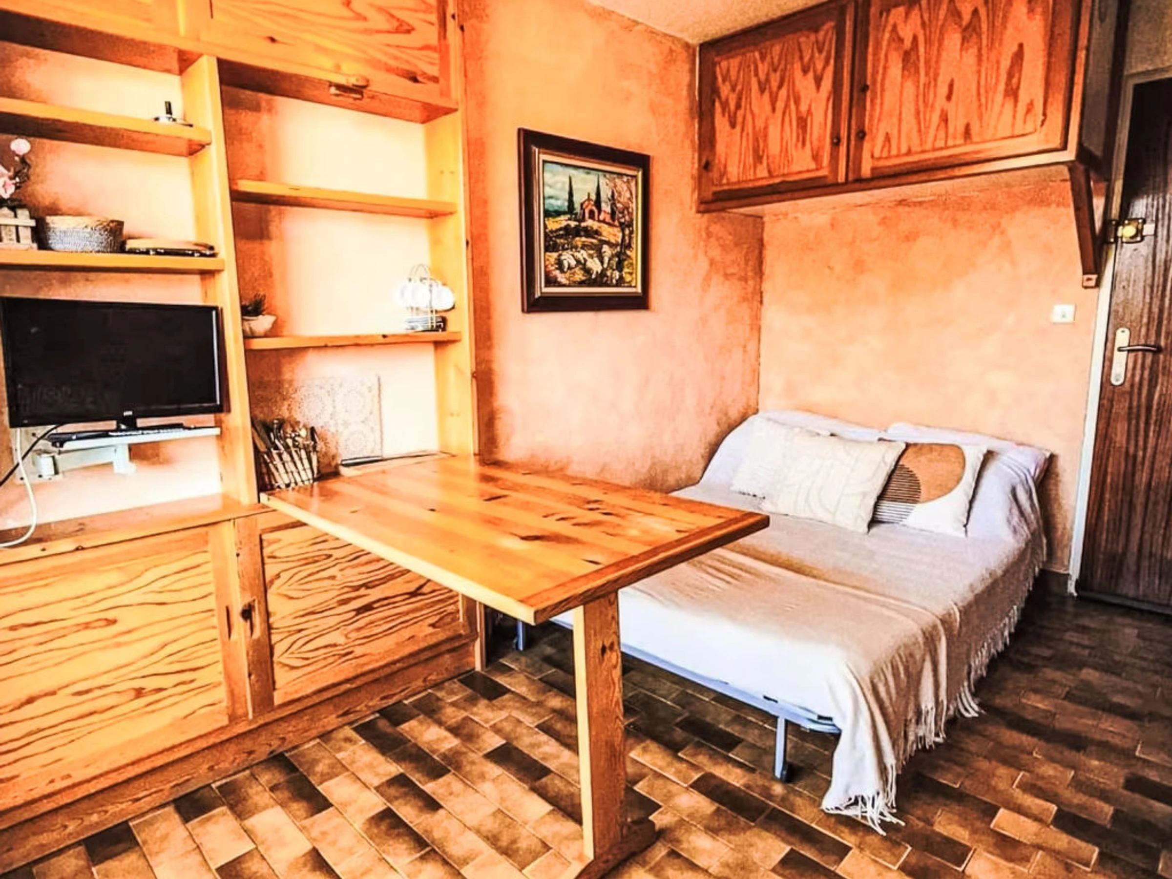 1-room studio 20 m2 on 3rd floor. Object suitable for 2 adults + 2 children. Very simple furnishings: living/dining room with 1 double sofabed (140 cm, length 190 cm), TV (flat screen), fan. Exit to the balcony. Entrance hall with 1 x 2 bunk beds (80 cm, length 190 cm). Kitchenette (3 hot plates, toaster, kettle, microwave, electric coffee machine). Shower/WC. Balcony. Balcony furniture. Facilities: Internet (WiFi, free). Garage space n 281, height 180 cm. Please note: non-smokers only. Maximum 1 small pet/ dog allowed. TV only FR. Smoke alarm. Offer by a private individual according to  Art. 155, IV of CGI. [hidden]