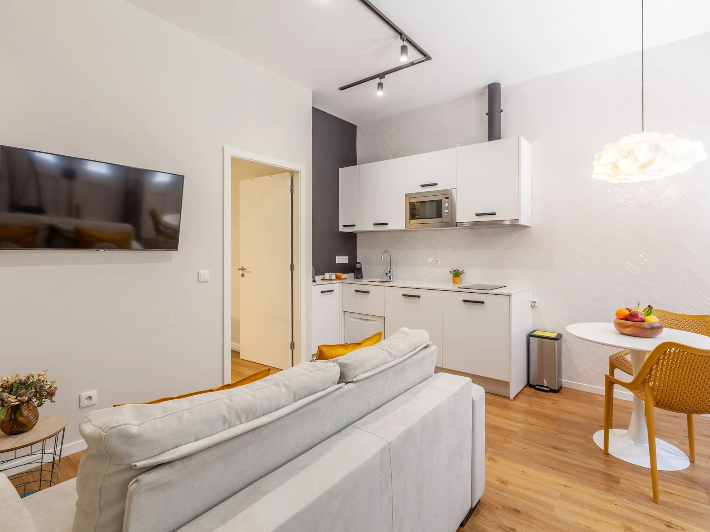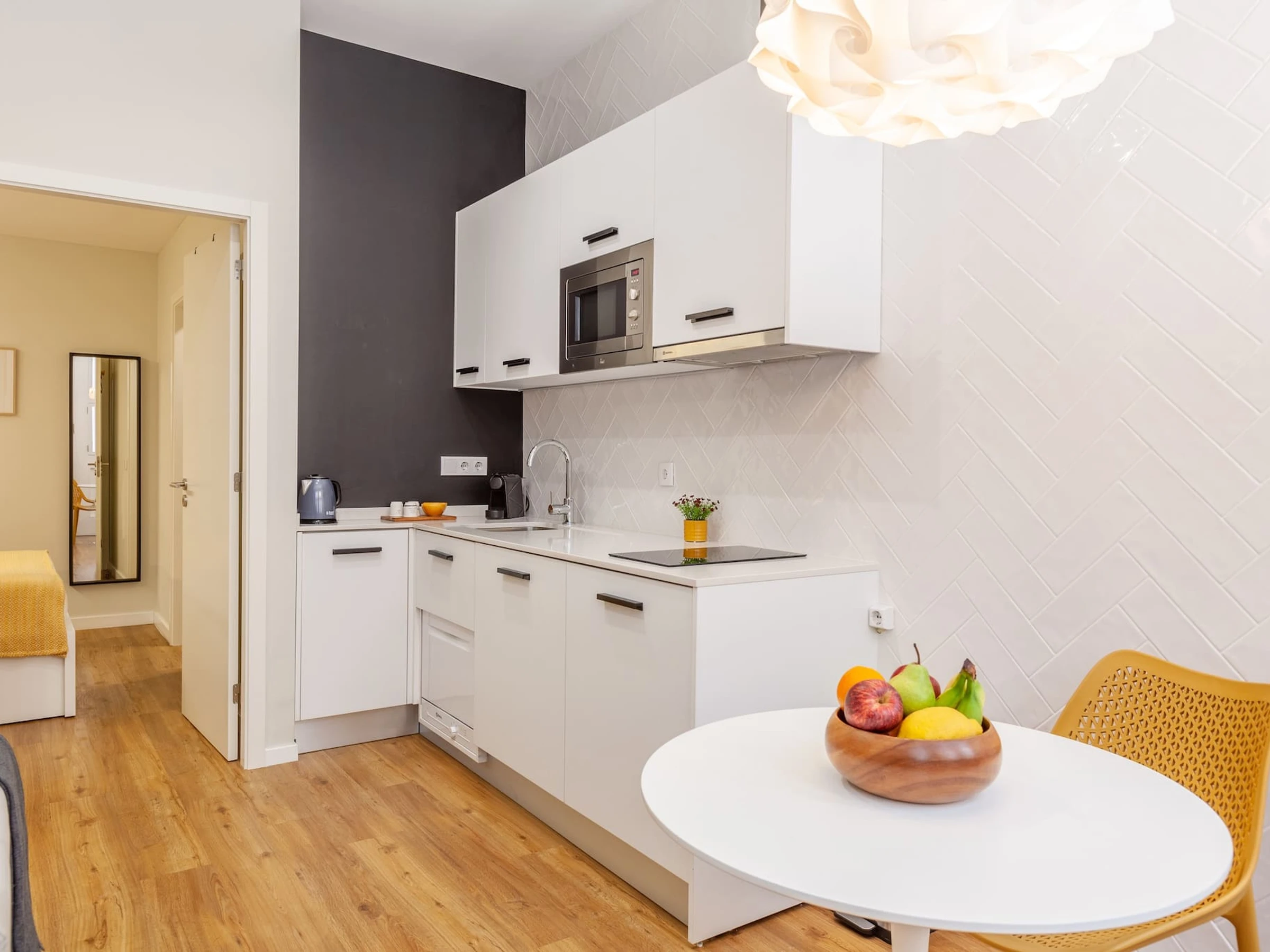 The living room is a cosy place to relax and unwind after a day of exploring. Sit comfortably amidst cosy surroundings and let the cheerful décor lift your spirits. Take advantage of modern amenities for your entertainment and enjoy quality time with your loved ones in this charming space. The fully equipped kitchen goes with the yellow theme, adding a cheerful touch to your culinary adventures. Cook your favourite meals surrounded by the bright colour palette and savour delicious dishes at the dining table, where the yellow details continue to add a touch of happiness to your meals. The bedroom is a cosy haven, designed to give you peaceful nights and energetic mornings. Embrace the fun atmosphere and wake up ready to explore the treasures of the historic centre.