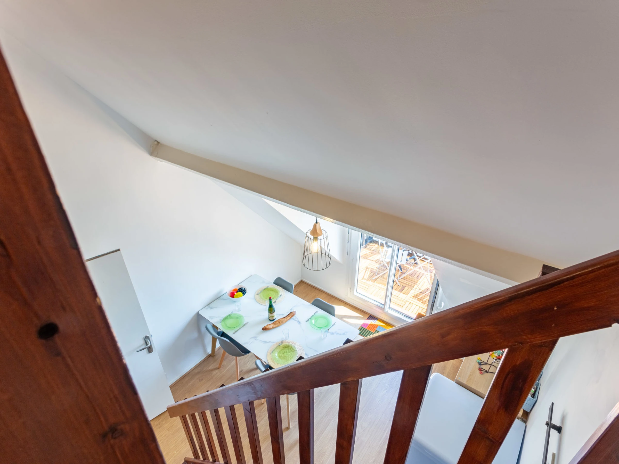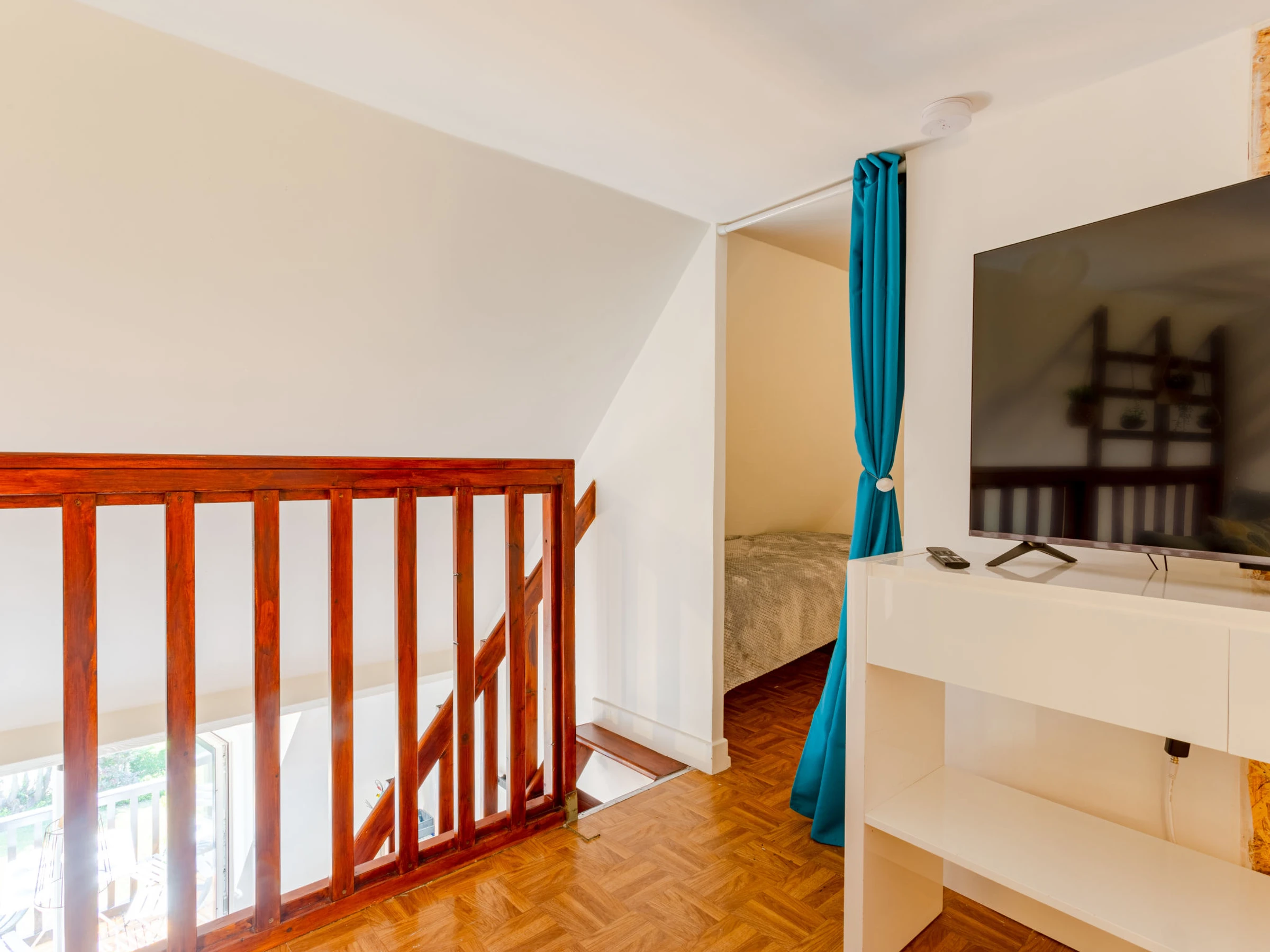 2-room apartment 32 m2 on 2 levels on 4th floor, east facing position. Living/dining room. Exit to the balcony. 1 room with 1 french bed (140 cm, length 190 cm), shower/WC. Kitchenette (2 induction hot plates, microwave, freezer). Upper floor: (steep stair) gallery with sloping ceilings with 2 beds (90 cm, length 190 cm), TV (flat screen). Balcony 5 m2, east facing position. Balcony furniture. Facilities: washing machine. Internet (WiFi, extra). Please note: non-smokers only. Smoke alarm. Offer by a private individual according to Art. 155, IV of CGI.