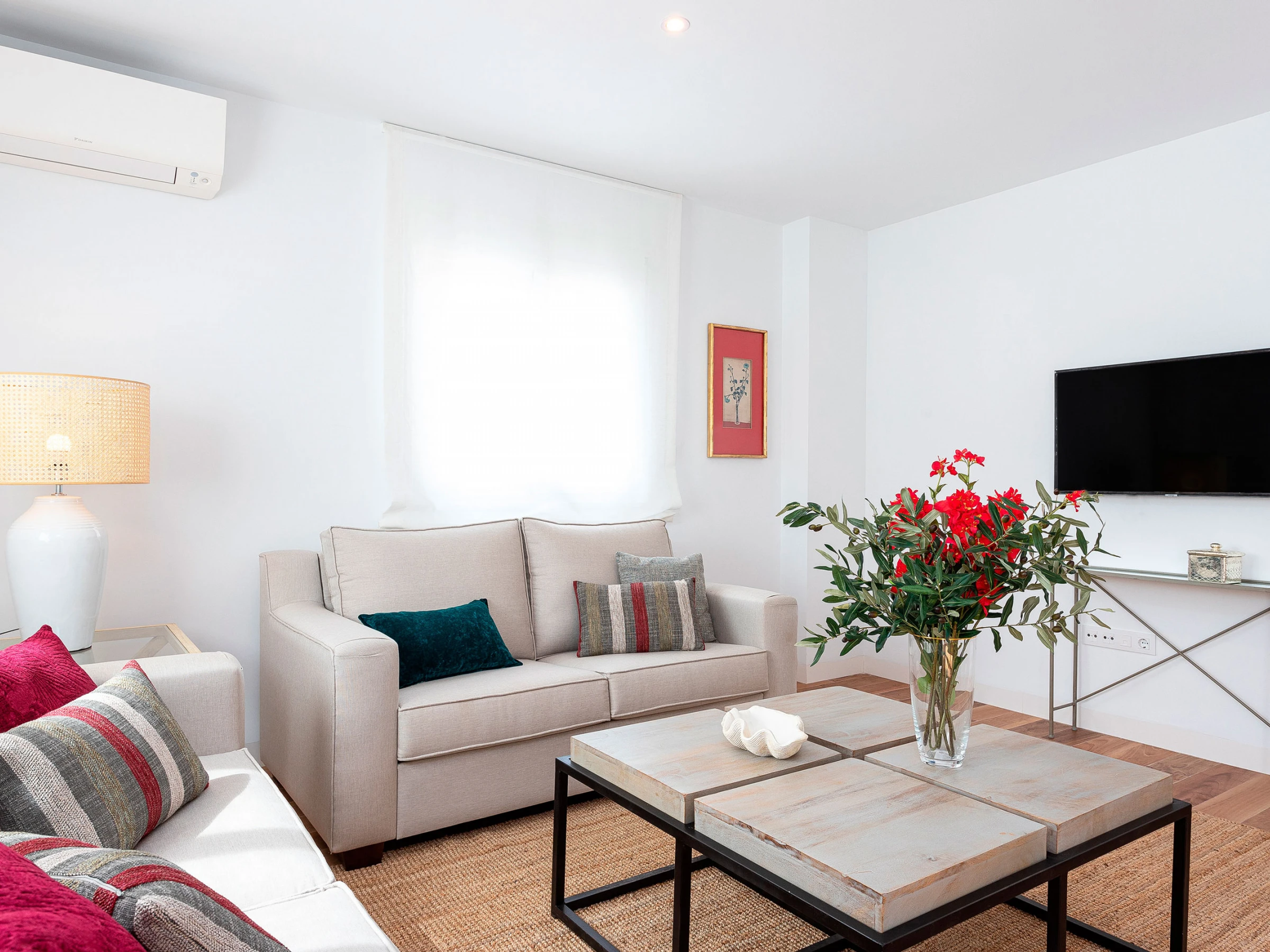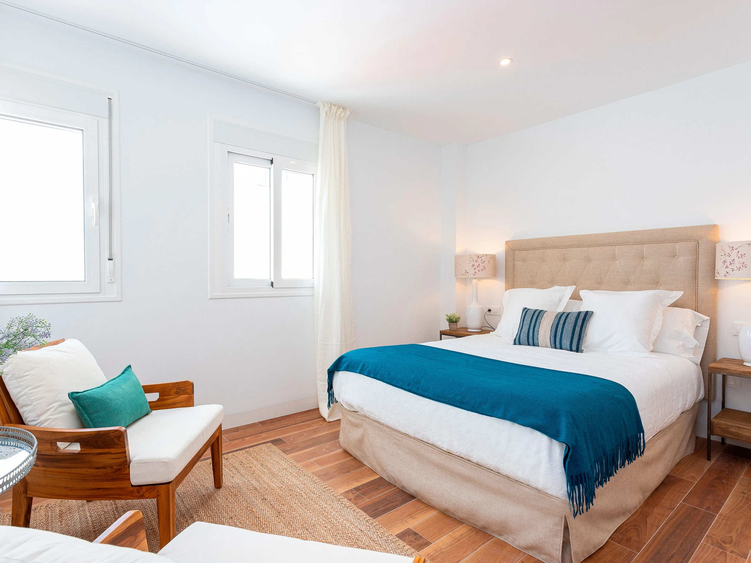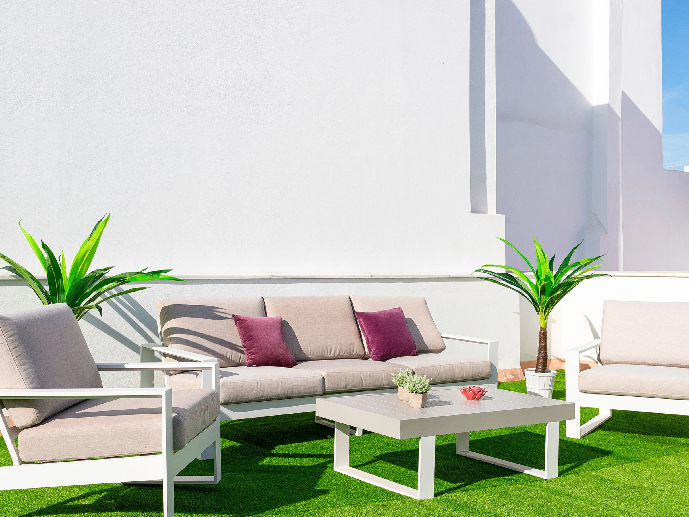 Located on the third floor, the apartment features a beautifully decorated living room with designer furniture and a comfortable double sofa bed (1.40 x 1.90 m), allowing accommodation for up to 6 guests. From the living room, without the need for stairs, you access a large private terrace furnished with garden furniture and lovely plants—an ideal space to relax and enjoy the Andalusian sun.