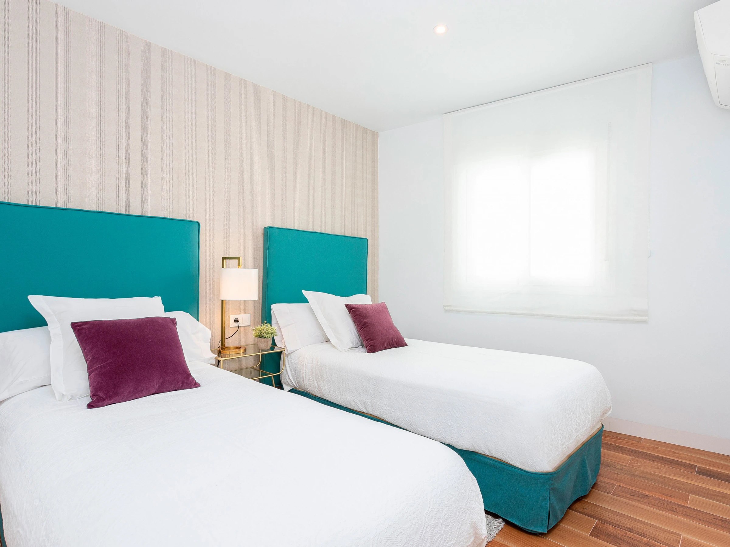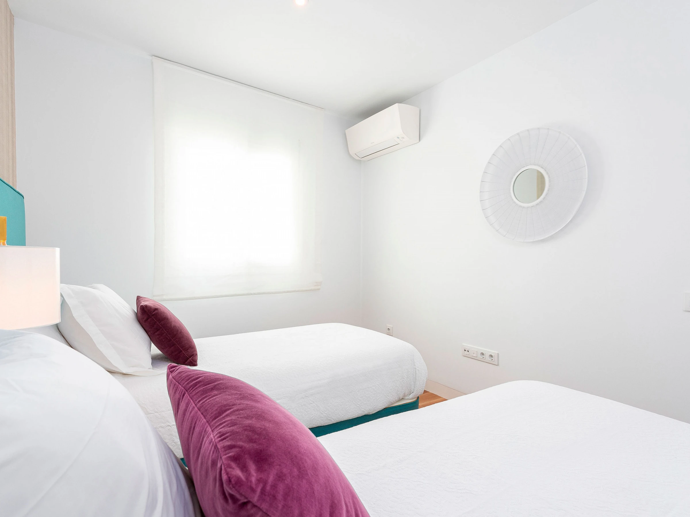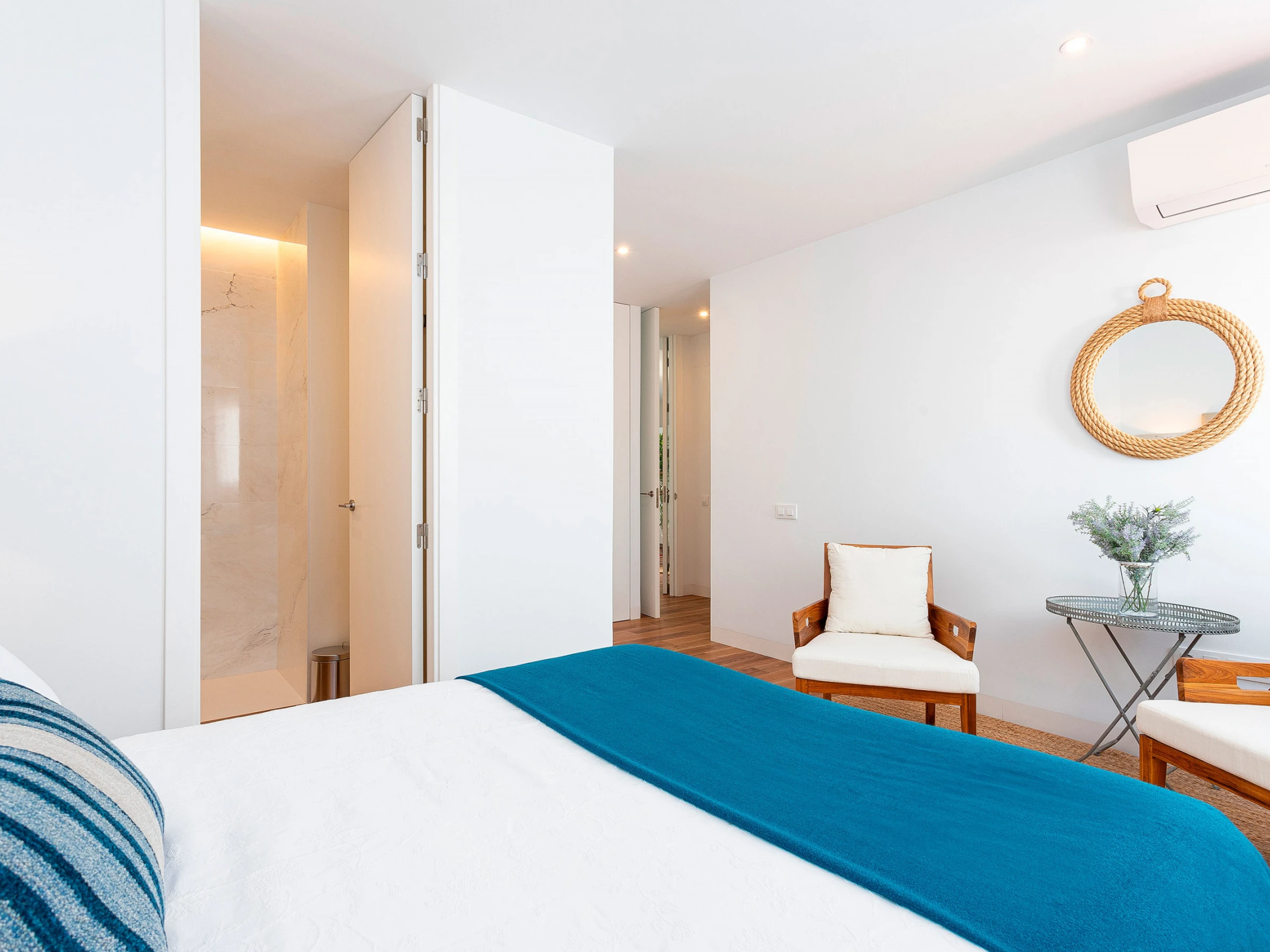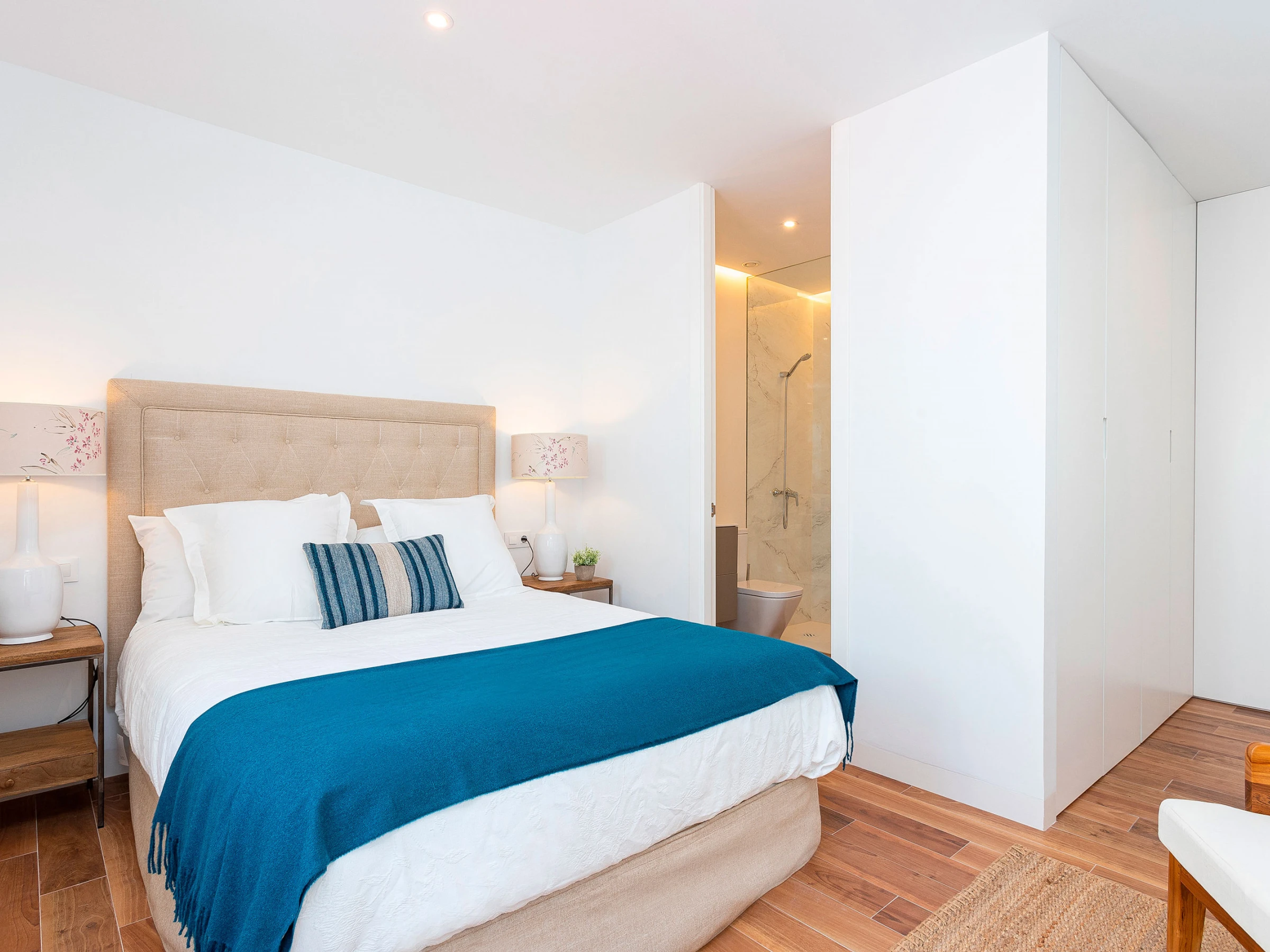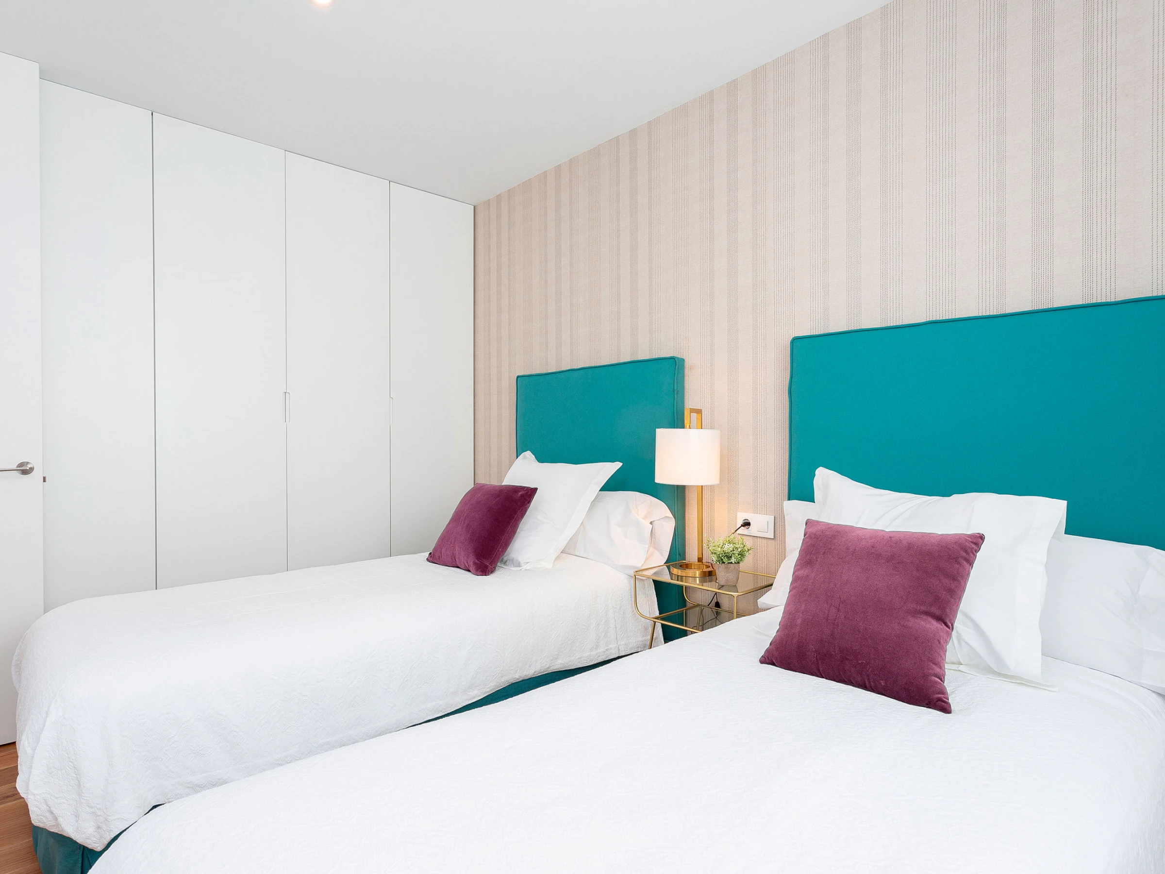 The apartment has two bedrooms. The main one is very spacious and outward-facing, with a double bed (1.50 x 2.00 m), a reading corner, and an en-suite bathroom with a shower. The second bedroom, also exterior, offers two single beds (0.90 x 2.00 m). There is also a second full bathroom with a bathtub.