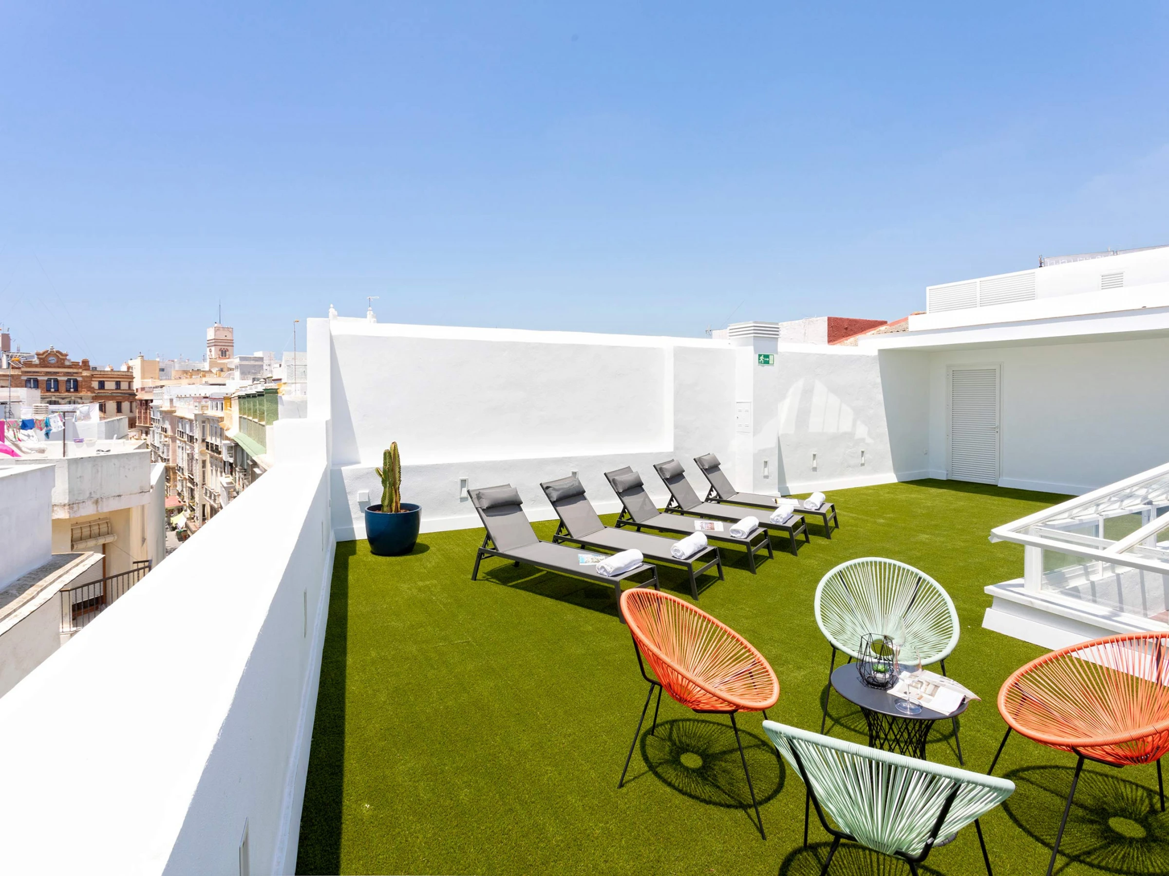 This three-story building in the heart of Cádiz offers charming tourist apartments. It stands out for its bright Andalusian patio with palm trees, an elevator that takes you to the rooftop terrace, equipped with sun loungers and a laundry room.
