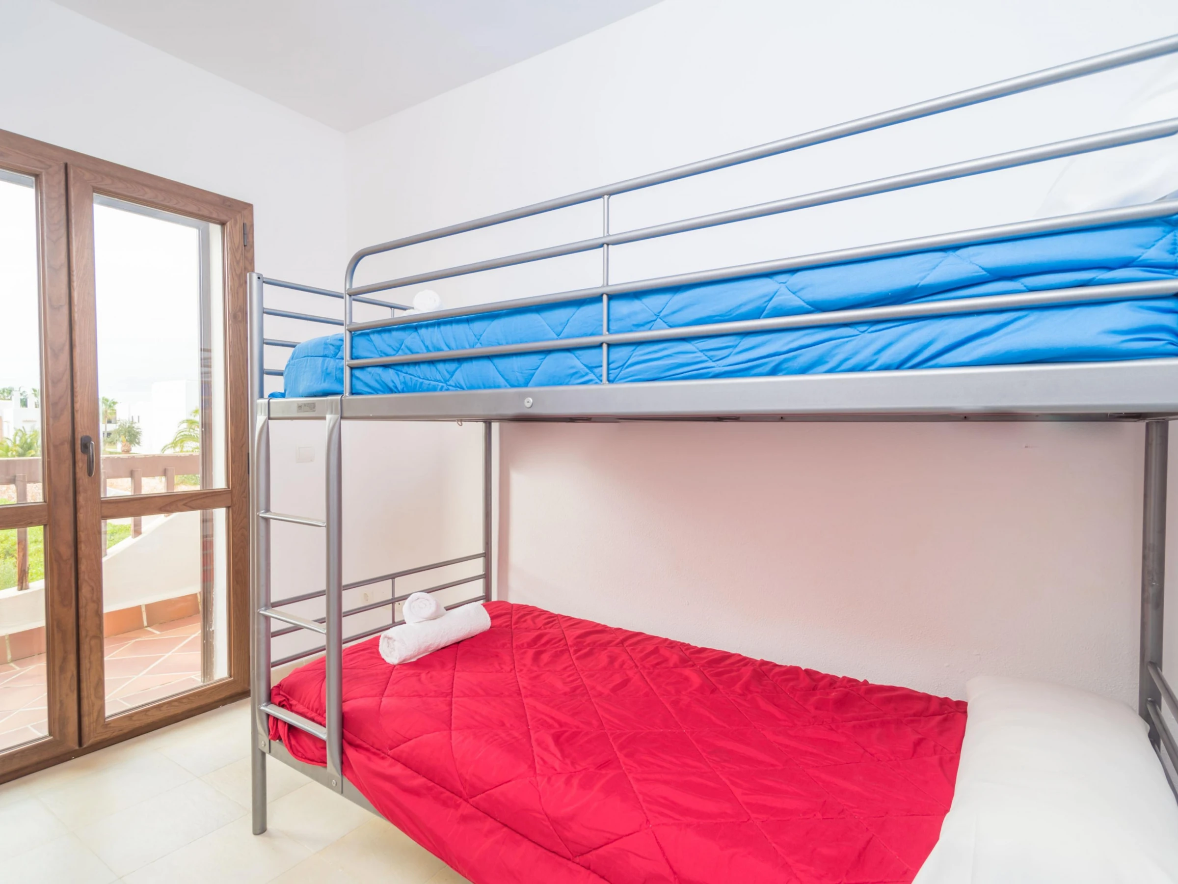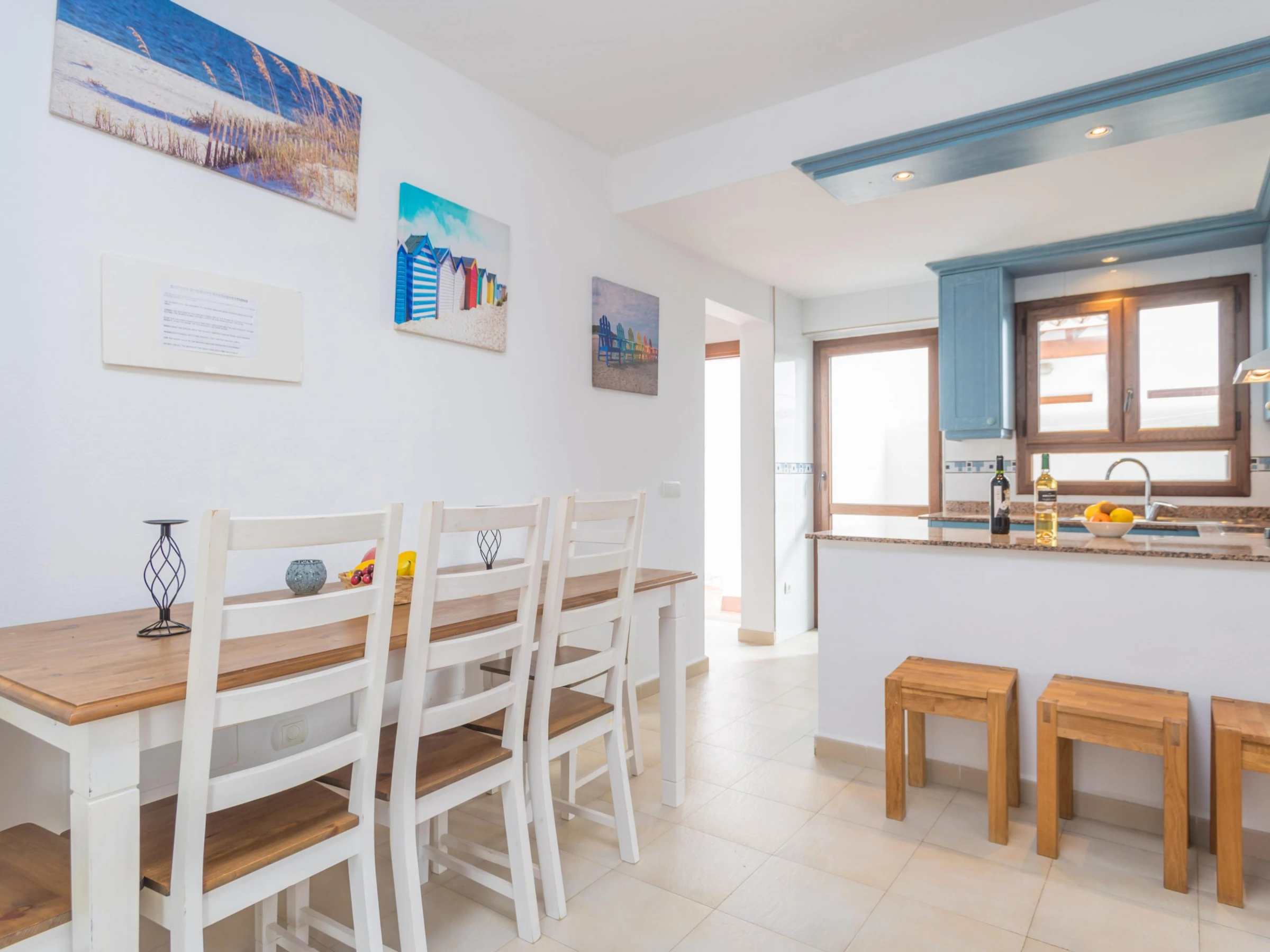 The house has 130 m2 distributed in two floors. Entering on the ground floor we find a large room shared by living room, dining room and kitchen. It is equipped with sofas where you can sit and watch satellite TV (German channels) while cooling off with the air conditioning. The dining area has a table that can comfortably seat 9 people. A small bar separates this space from the kitchen, which is fully equipped for cooking during your holidays: ceramic hob, oven, microwave, dishwasher,... In the house you will also find a washing machine, iron and ironing board. To rest the house has 5 bedrooms. The first one is on the ground floor and has a double bed. A bathroom with bathtub completes the floor. Upstairs we find the rest of the bedrooms. The first one with two single beds, another one with a bunk bed, a third one with two single beds and the last one with a double bed. All bedrooms on both floors are equipped with wardrobes and air conditioning, and some have access to the terrace or balcony. A bathroom with bathtub serves this floor. If you are travelling with a baby we can provide a cot and high chair on request.